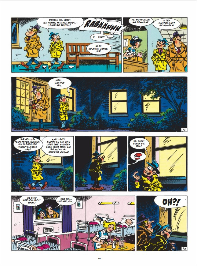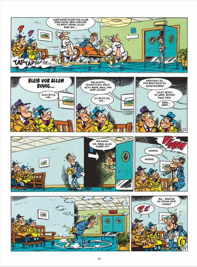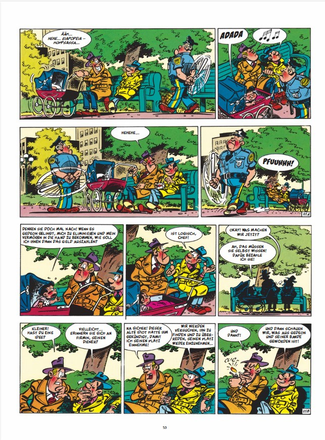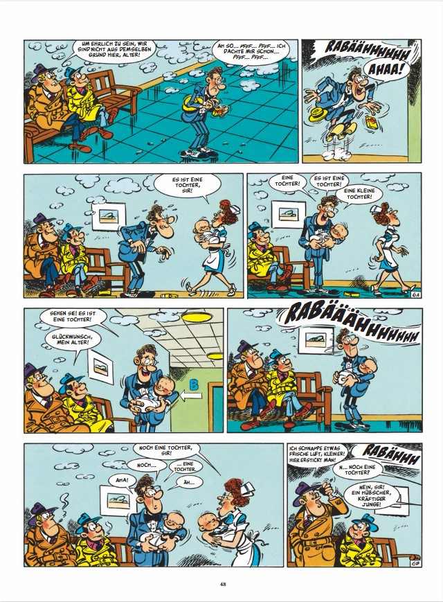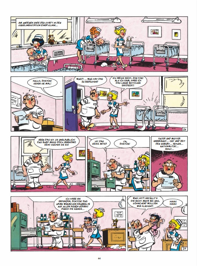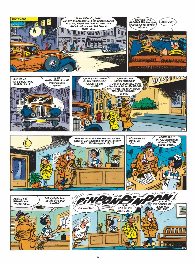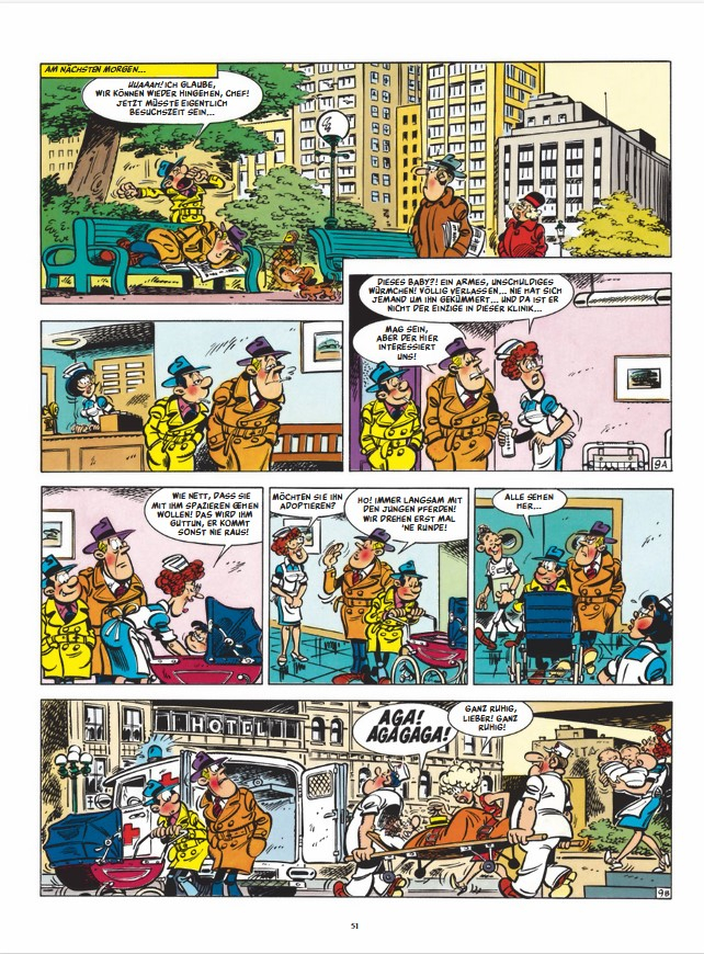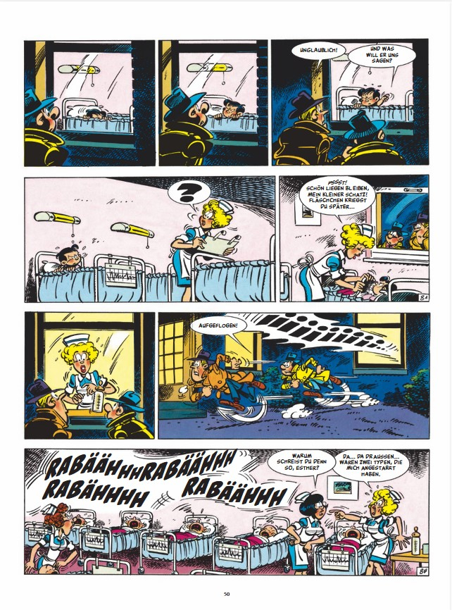 Der fünfte Band der aberwitzigen Abenteuer der beiden Bodyguards Sammy & Jack deckt die Jahre 1982 bis 1985 ab und präsentiert als deutsche Erstveröffentlichungen im Albumformat die Abenteuer »Die Killer-Babys«, »Panik im Vatikan«, »Gorillas in der Manege« und »Ma betritt die Bühne«. Neben den neu übersetzten Geschichten finden sich zusätzliches für das Spirou-Magazin und die flämische Ausgabe Robbedoes produziertes Material wie Coverabbildungen und Magazin-Vorankündigungen sowie kenntnisreiche Artikel zu den Autoren und den Hintergründen der Reihe.