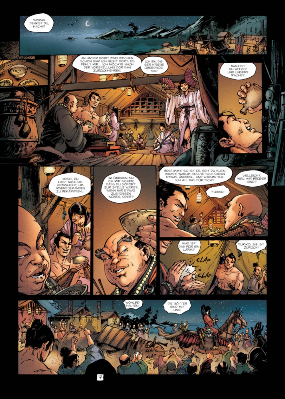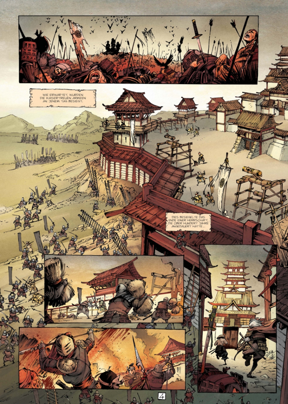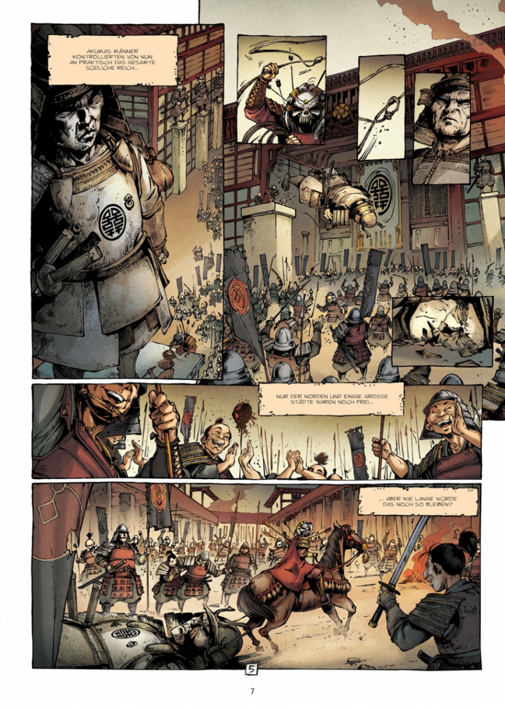 Sieben Söldner überfallen eine junge Frau, die sich gerade nichtsahnend eine Tätowierung stechen lässt – keine gute Idee. Am Ende sind fünf von ihnen tot und zwei auf der Flucht. Damit ist klar, dass es sich nicht um irgendeine harmlose Fremde handelt und dass zugleich jemand sehr großen Wert auf ihre Ergreifung legt. Solch mysteriöse, wenn nicht gar mystische Vorfälle sind in diesem exotischen Umfeld jederzeit möglich, einem mittelalterlichen Japan voller Magie, das den Rahmen abgibt für das Schauspiel, das sich dann mit »Samurai« voll entfalten wird – einem epischen Ringen um Macht und eine dramatische Selbstfindung.