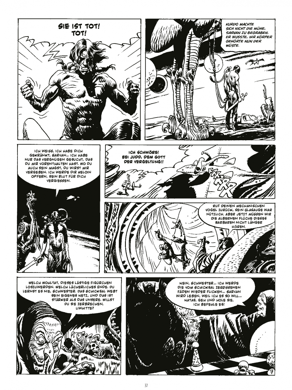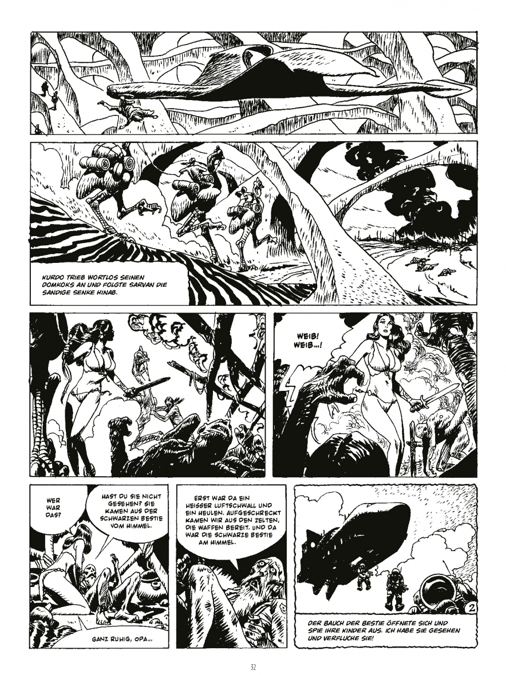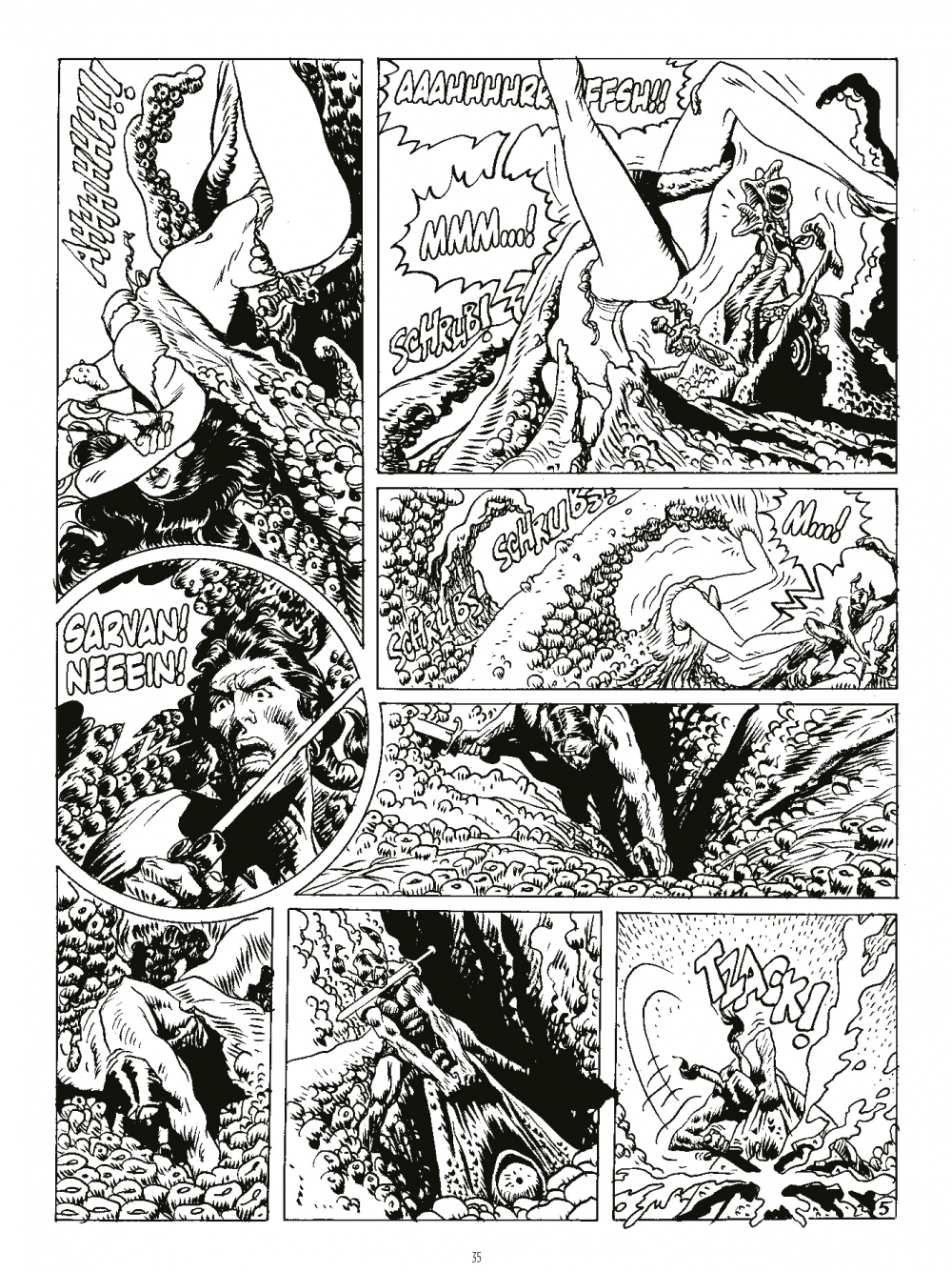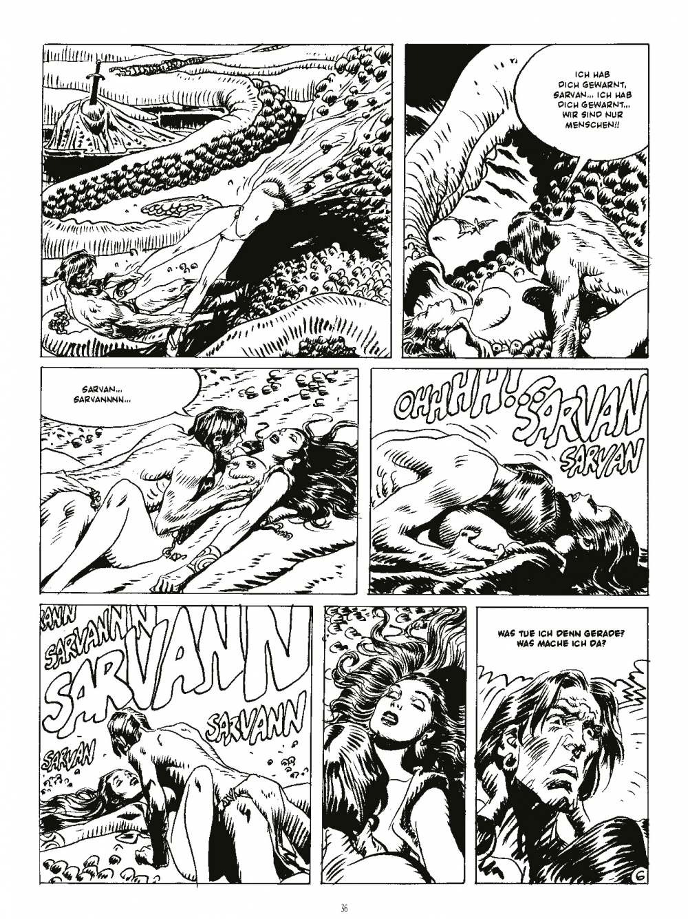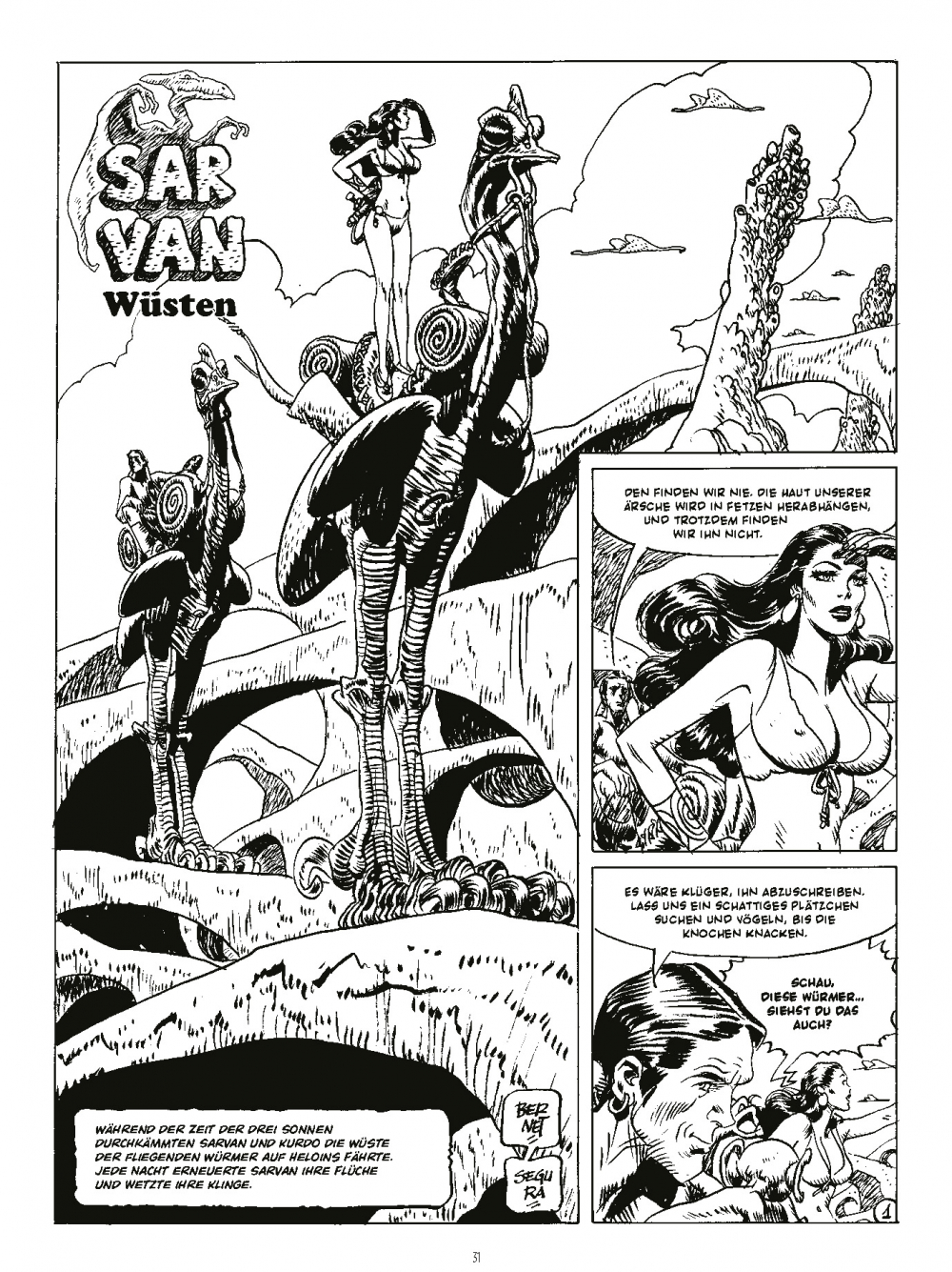 Im Mittelpunkt der von Szenarist Antonio Segura und Zeichner Jordi Bernet geschaffenen Serie Sarvan steht die titelgebende Kriegerin vom Stamm der Kloks. Inmitten einer postapokalyptisch anmutenden Fantasy-Welt erwehrt sich die ebenso anmutige wie schlagkräftige Sarvan auf rustikale Weise der Avancen eines Verehrers, da sie auf einen ihr im Traum versprochenen Mann wartet. Dieser tritt bald in Form eines einem havarierten Raumschiff entsprungenen Raumfahrer in ihr Leben.
