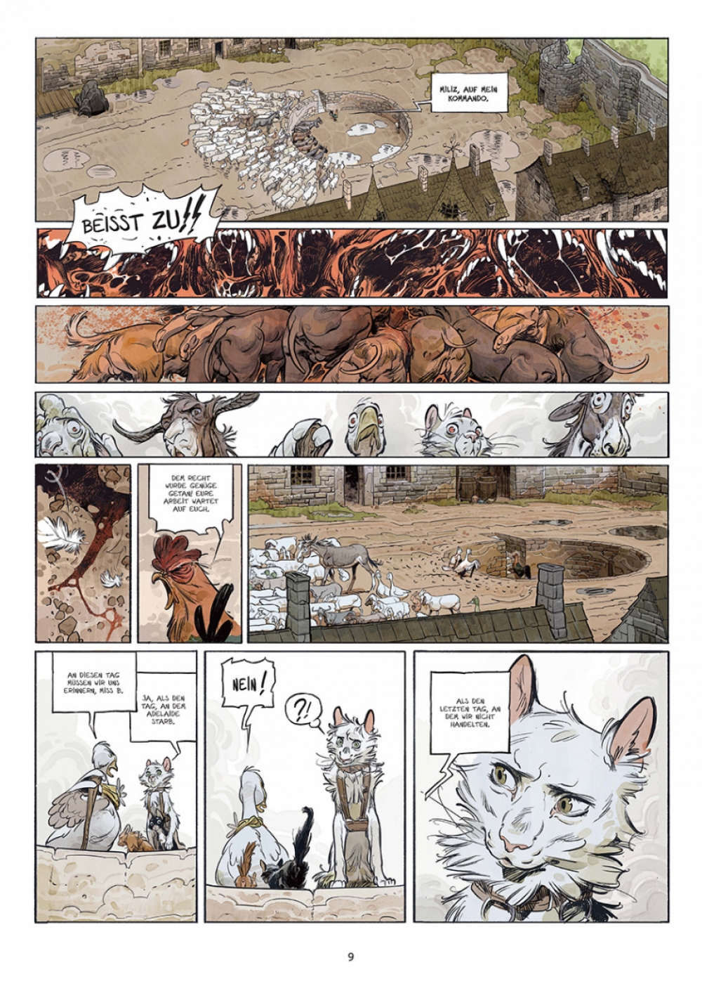 Die Parallelen zur »Farm der Tiere« kommen nicht von ungefähr. Xavier Dorisons (»Long John Silver«, »Undertaker«) scharfsinnige Modernisierung von George Orwells Fabel hält uns einen Spiegel vor, in dem wir unbequeme Wahrheiten erkennen müssen. Der ausdrucksstarke Strich von Félix Delep, der ein eindrucksvolles Erstlingswerk abliefert, haucht seinen tierischen Protagonisten so viel Menschlichkeit ein, dass die Unmenschlichkeit der Diktatur umso stärker hervortritt."