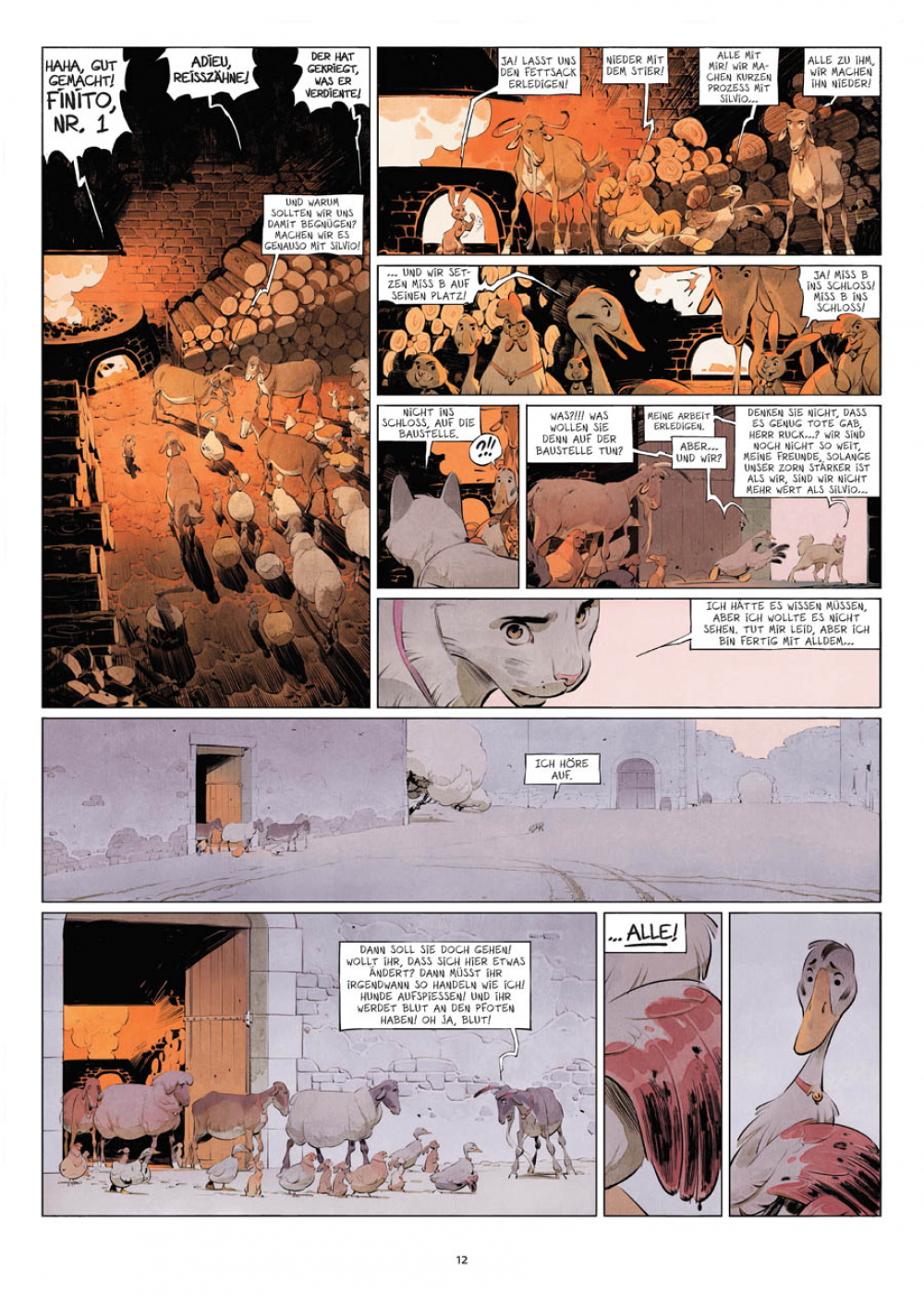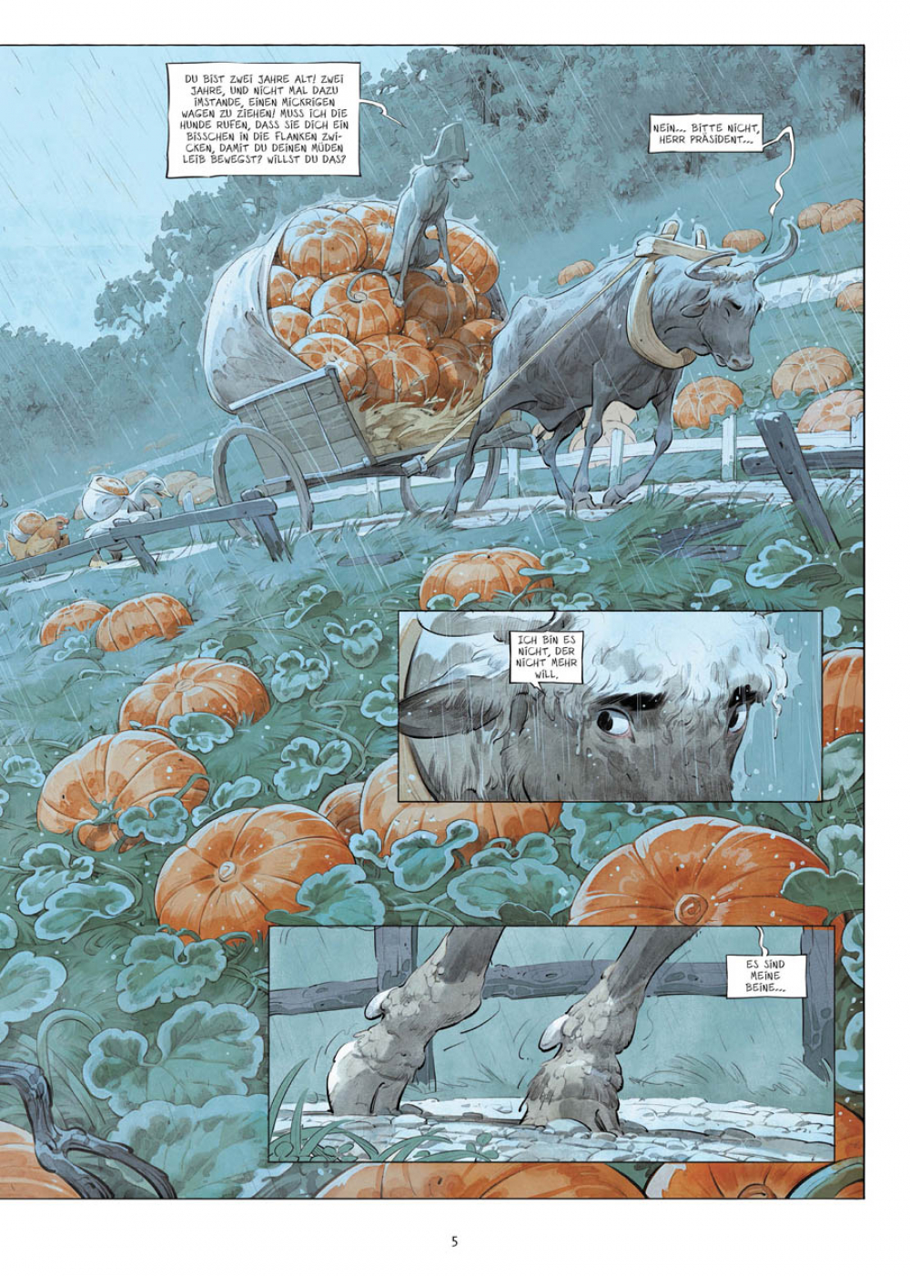 Die Parallelen zur »Farm der Tiere« kommen nicht von ungefähr. Xavier Dorisons (»Long John Silver«, »Undertaker«) scharfsinnige Modernisierung von George Orwells Fabel hält uns einen Spiegel vor, in dem wir unbequeme Wahrheiten erkennen müssen. Der ausdrucksstarke Strich von Félix Delep, der ein eindrucksvolles Erstlingswerk abliefert, haucht seinen tierischen Protagonisten so viel Menschlichkeit ein, dass die Unmenschlichkeit der Diktatur umso stärker hervortritt.