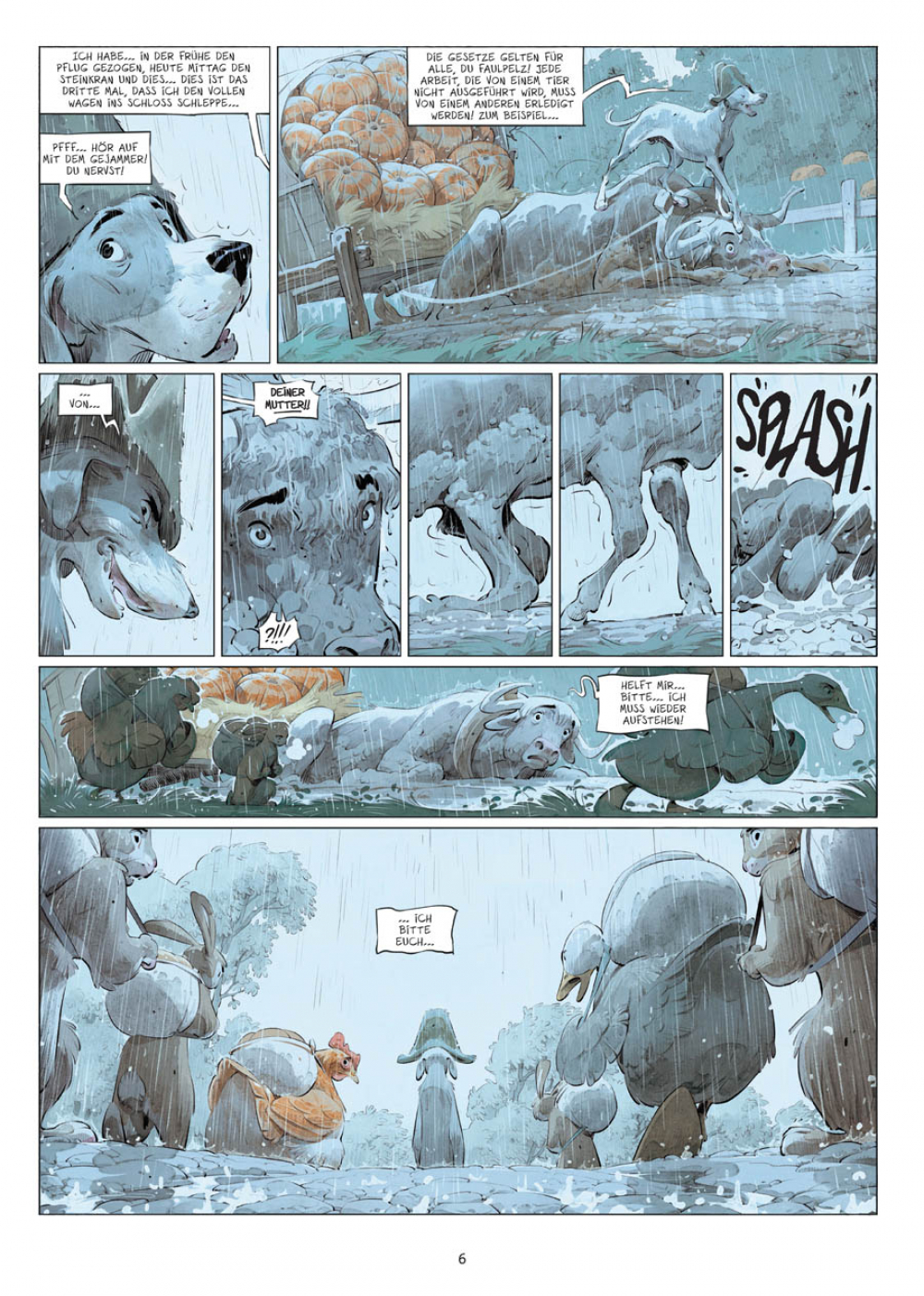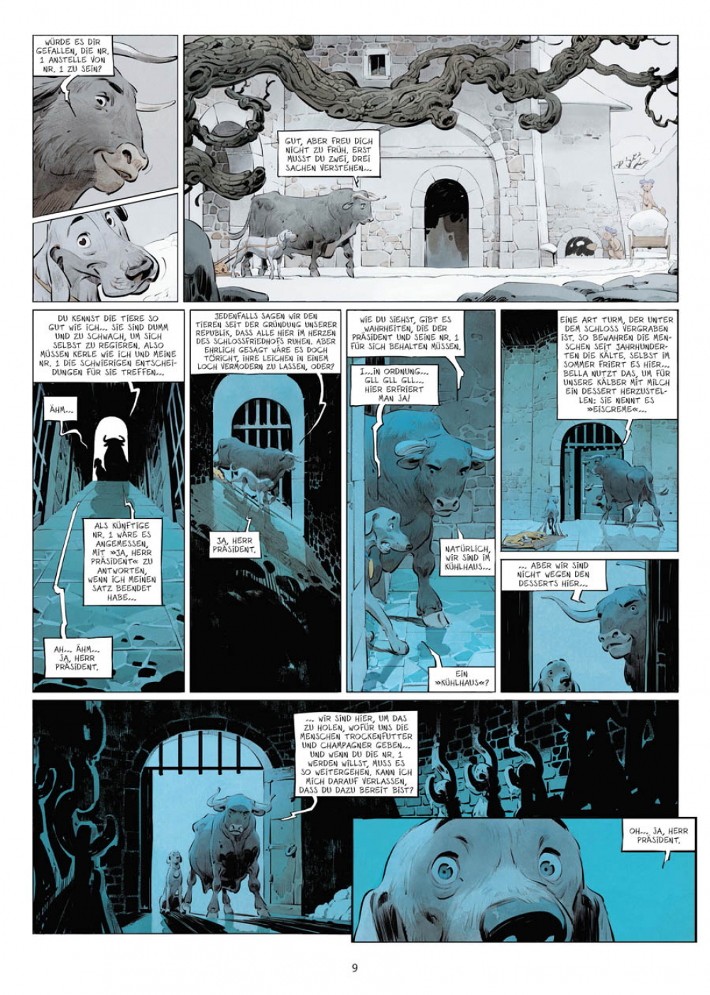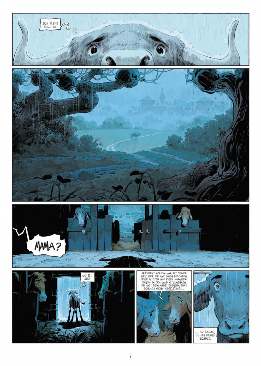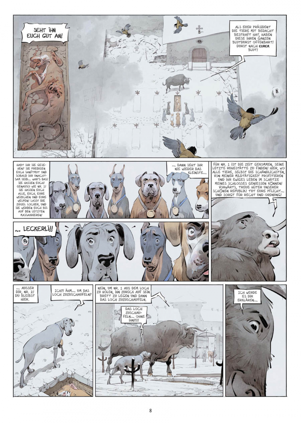 Die Parallelen zur »Farm der Tiere« kommen nicht von ungefähr. Xavier Dorisons (»Long John Silver«, »Undertaker«) scharfsinnige Modernisierung von George Orwells Fabel hält uns einen Spiegel vor, in dem wir unbequeme Wahrheiten erkennen müssen. Der ausdrucksstarke Strich von Félix Delep, der ein eindrucksvolles Erstlingswerk abliefert, haucht seinen tierischen Protagonisten so viel Menschlichkeit ein, dass die Unmenschlichkeit der Diktatur umso stärker hervortritt.