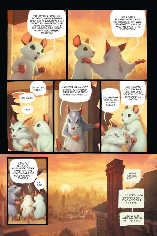 Während die junge Pict und ihr Vater Orim versuchen, die Kolonie vor dem Chaos zu bewahren, begeben sich der kleine Wix und sein Rattenfreund Umf auf eine weitere Plündertour, um Nahrung zu suchen. Dass sie von wilden Katzen und Raubvögeln gejagt werden, gehört für die Mäuse zum Leben – aber hinter den Zäunen lauert noch etwas viel Furchterregenderes ...