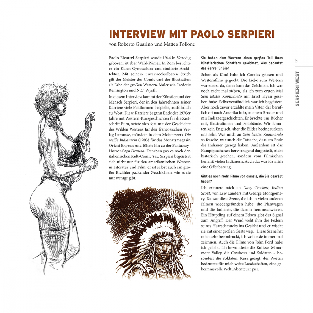 In einem langen Interview bekundet Serpieri seine Faszination und Liebe für den Wilden Westen, seine Gesichter, Mythen und Geschichten.