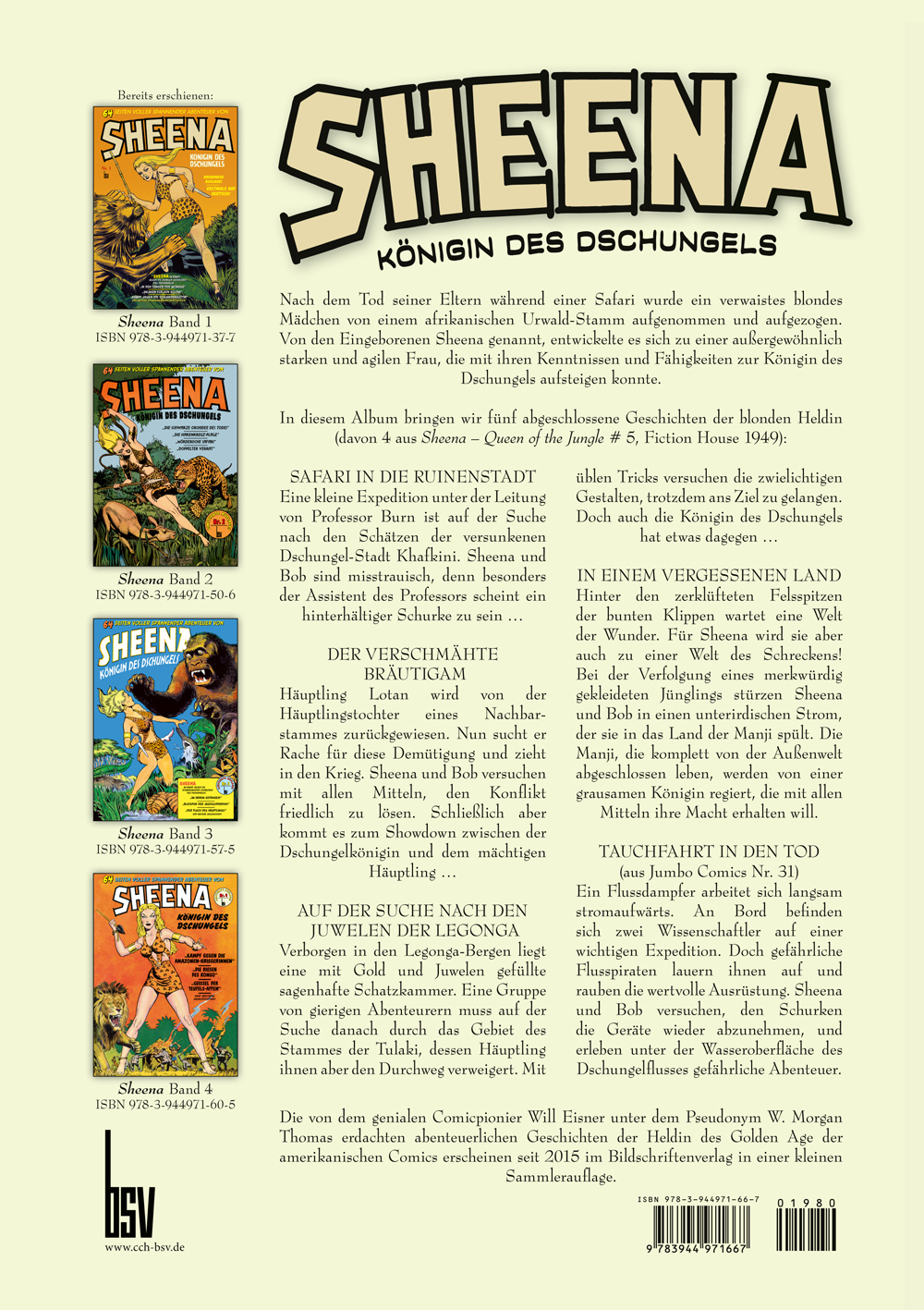 Ohne Frage ist hier von Sheena, der Königin des Dschungels, die Rede. Folgen wir ihr gemeinsam mit ihrem treuen Gefährten Bob durch die tiefen Dschungel Afrikas. Erlebt fünf abgeschlossene Abenteuer aus dem Golden Age des amerikanischen Comics: