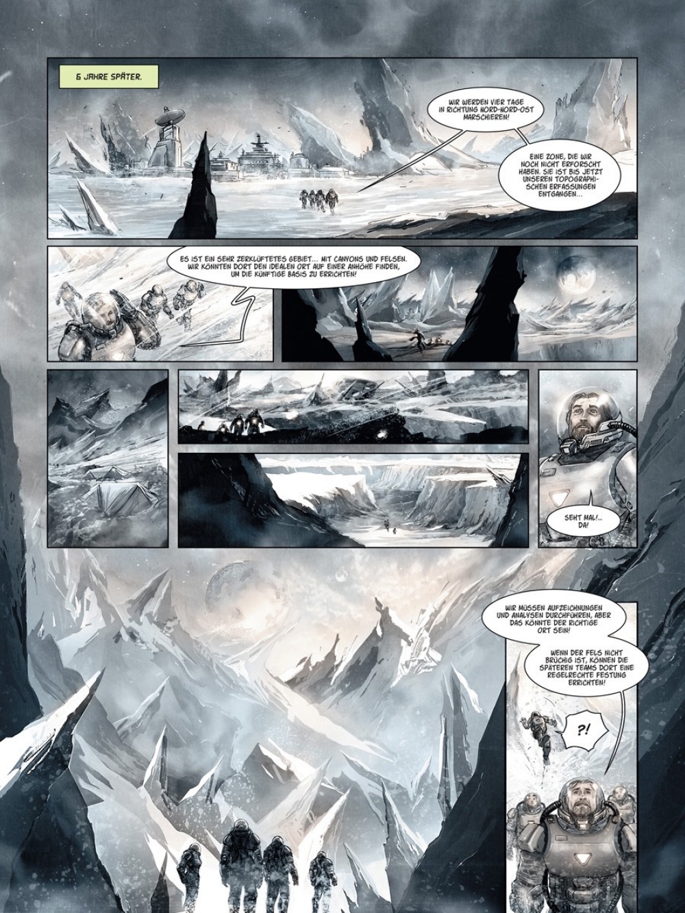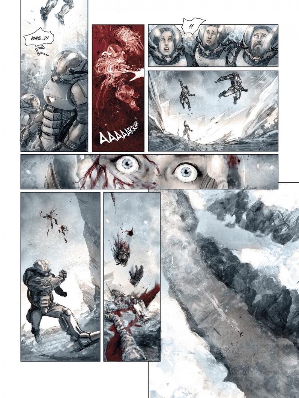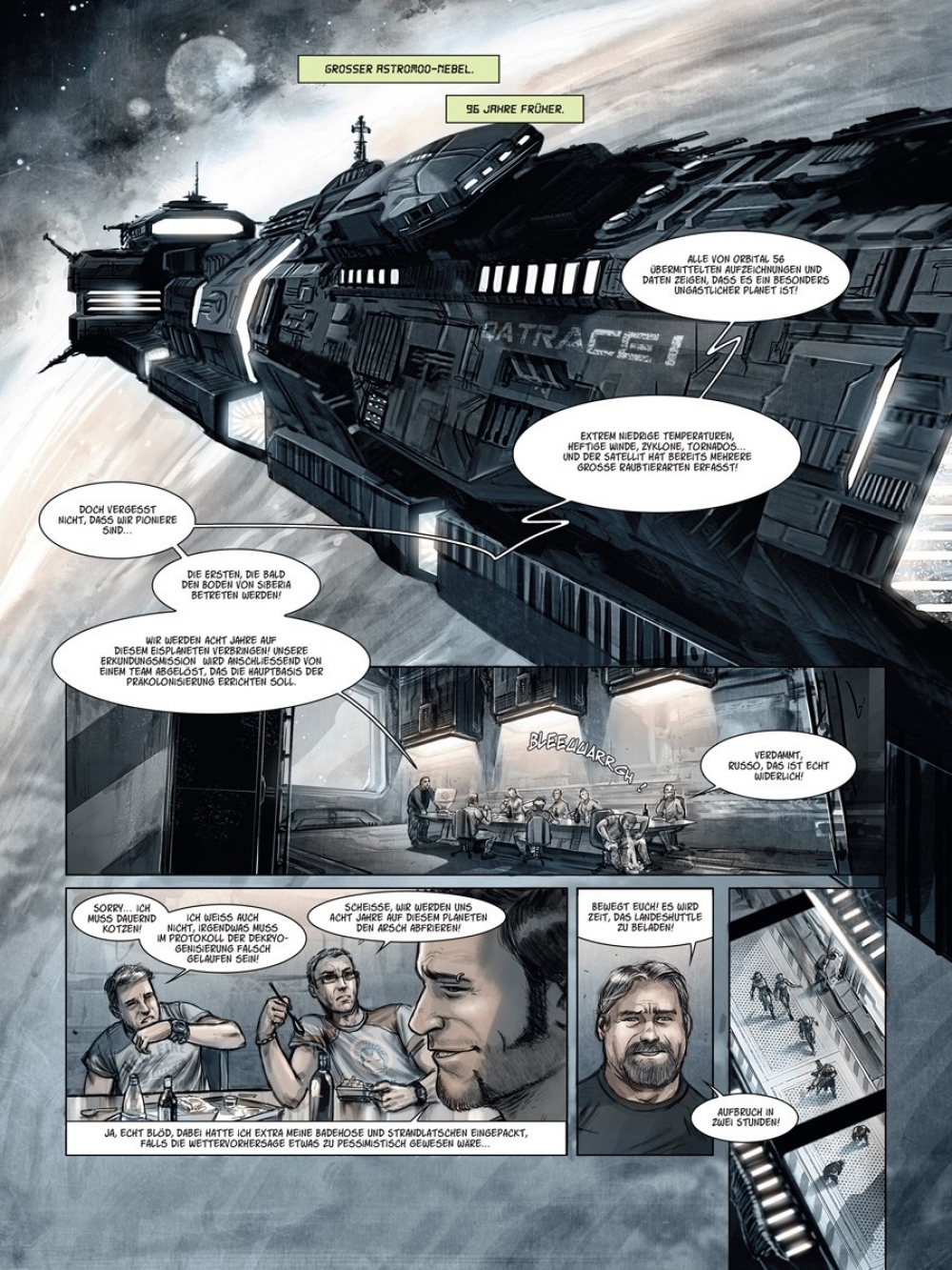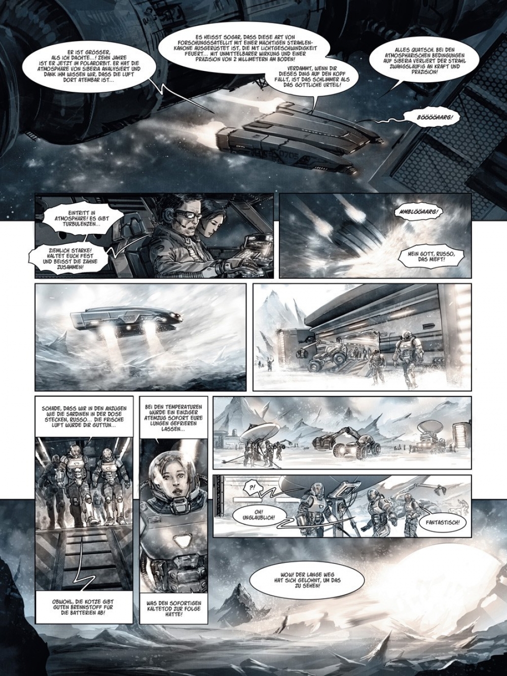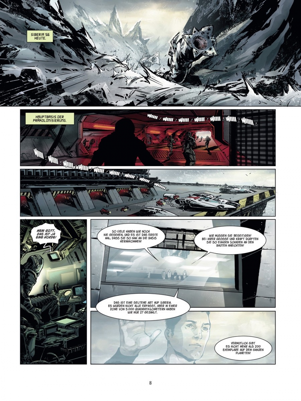 Siberia ist der 56. Planet der Vorkolonisation durch die Erde, eine Welt, wo »Überleben« keine Floskel ist! Ein Planet, dessen Oberfläche vollkommen von Schnee und schroffen Gebirgen bedeckt ist. An den Polen sinkt die Temperatur bis auf -200°C, mit eisigen Winden, die eine Geschwindigkeit von 300 km/h erreichen. In dieser wahren Hölle sollen sich 5 Wissenschaftler zu ihrem Basislager begeben, nachdem sie 80 Millionen Lichtjahre durch den Raum gereist sind. Doch beim Landeanflug auf den Planeten wird ihre Raumfähre von heftigen Winden erfasst und stürzt ab! Die Überlebenden sind gezwungen, 250 Kilometer bis zur Basis zurückzulegen… zu Fuß. Nicht gerade ein Zuckerschlecken angesichts der beißenden Kälte, der orkanartigen Stürme und der umherstreifenden Raubtiere… Mit Siberia 56 liefert uns Christophe Bec ein Heiligtum im All! Eine neue SF-Serie, die im Herzen einer feindlichen, aber auch faszinierenden Welt angesiedelt ist, von Alexis Sentenac auf geniale