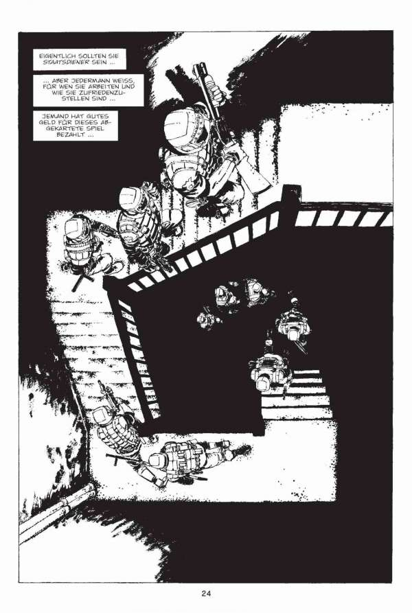 Später produzierte Miller, mit Dave Gibbons als Zeichner, die satirische Science-Fiction Serie GIVE ME LIBERTY/MARTHA WASHINGTON, die eine düstere und chaotische Zukunft der USA durch die Augen einer jungen, schwarzen Kämpferin aus den Slums zeigt. Gemeinsam mit Geoff Darrow kreierte er die Graphic Novel HARD BOILED, eine 100 Seite vollkommen sinnfreie Gewaltorgie, die sehr viel Spaß macht. 1998 führte Miller seinen Lesern mit der Miniserie 300 einen weiteren Aspekt seines kreativen Geistes vor. Noch einmal kommt Miller hier auf das Thema des griechisch-persischen Krieges zurück. Das auch rein optisch prachtvolle 300 wurde sowohl innerhalb der Comicszene als auch beim breiten Publikum zum riesigen Erfolg und gewann drei der renommierten Eisner Awards.