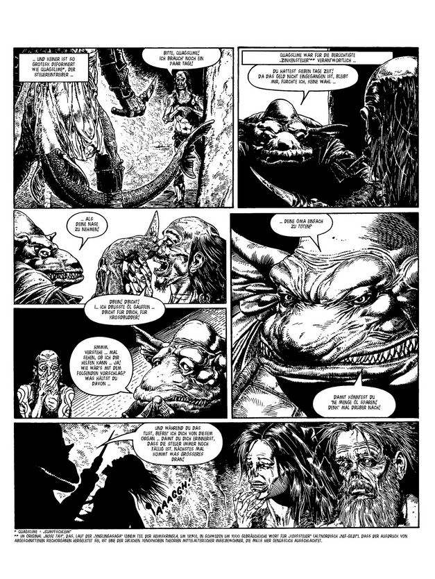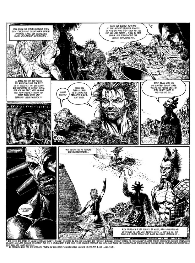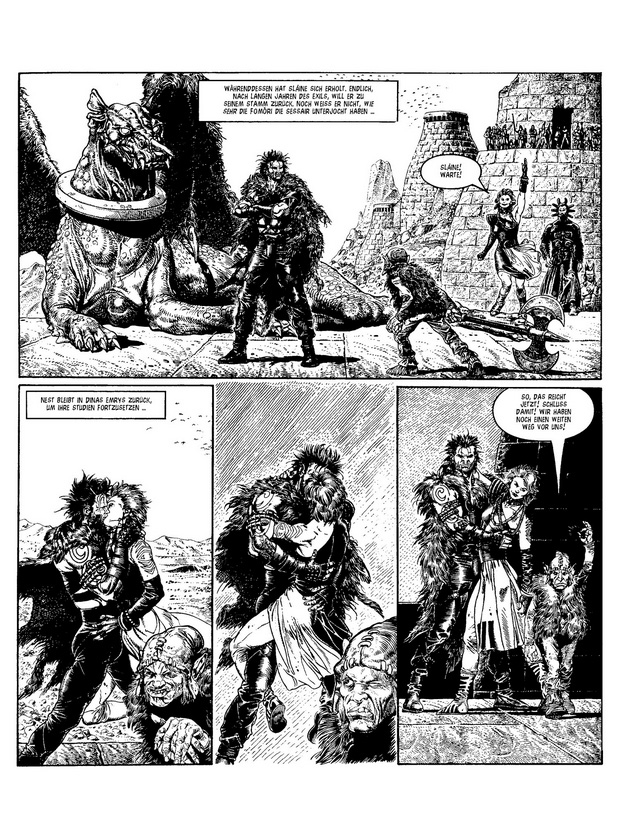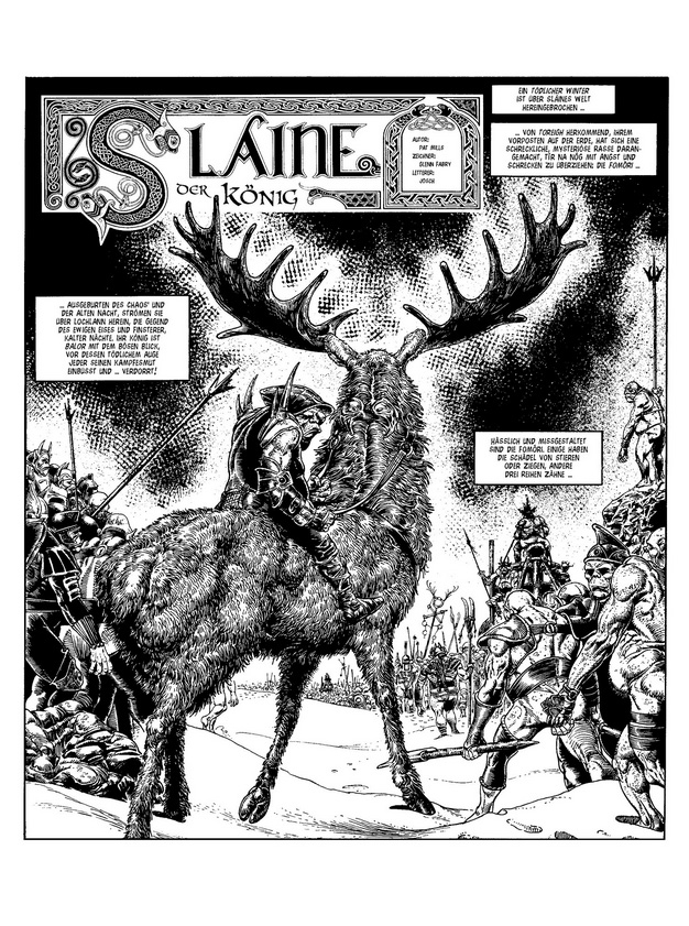 In Sláines Fall heißt das: Scheiße schippen, die Korn-Maid küssen und den König der Unterwelt zum Axt-Duell herausfordern. Und das ist nur das Vorgeplänkel! Denn als König der Sessair bekommt es der mythische Keltenkrieger mit gefährlichen Gegnern zu tun: mit einer launischen Göttin, einer rachedurstigen Vielleicht-Gattin, einer nörgelnden Ex-Geliebten und mit fiesen, fischgesichtigen Steuereintreibern! Klar, dass Sláine auch als König wieder massig Schädel spalten muss.