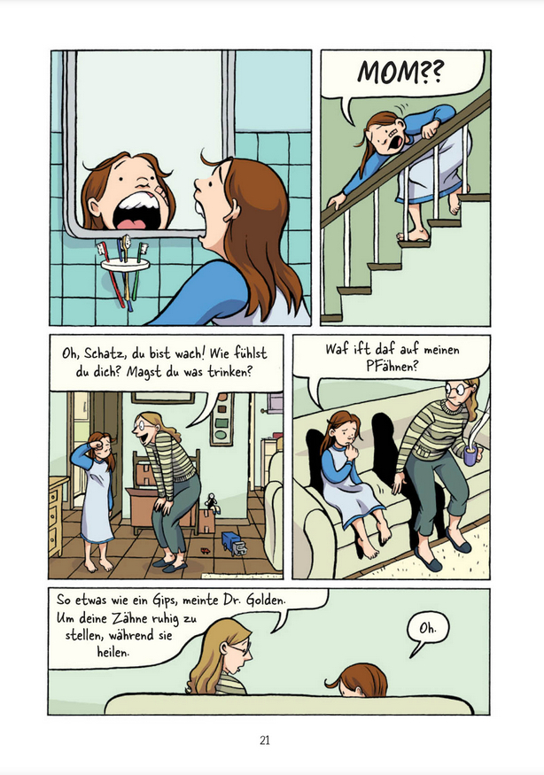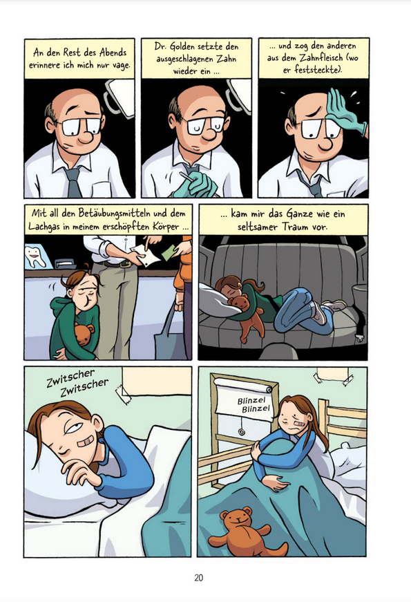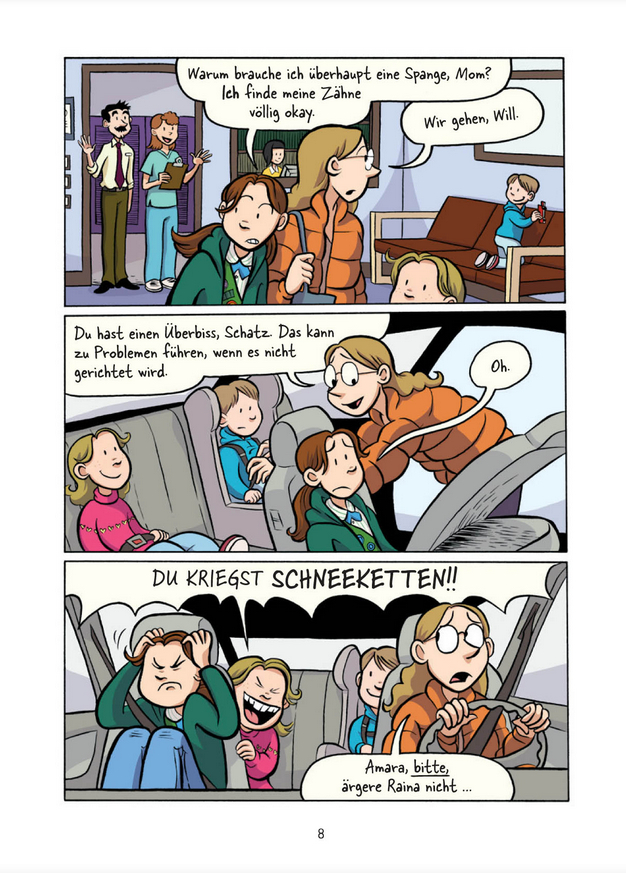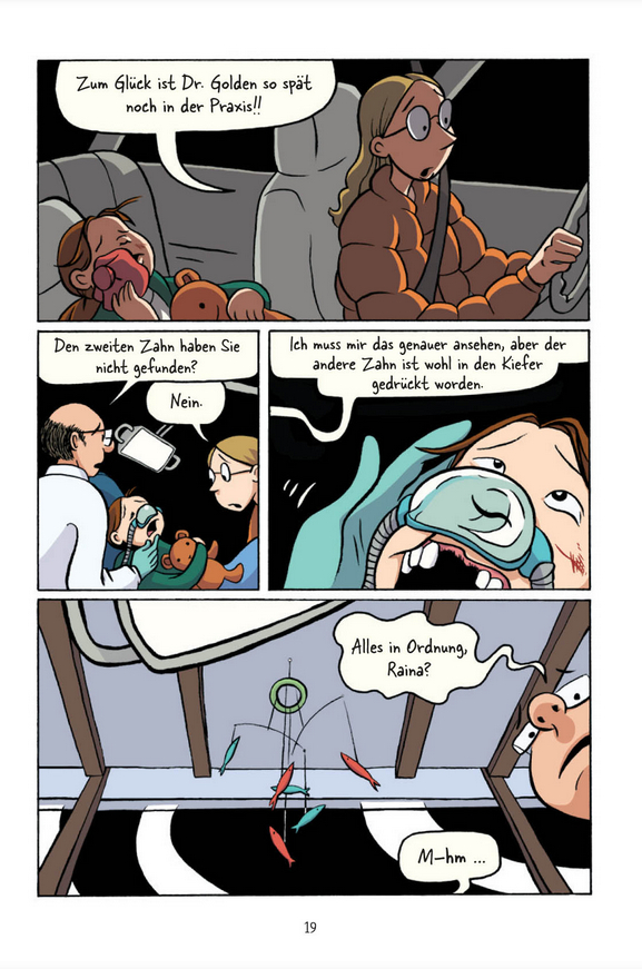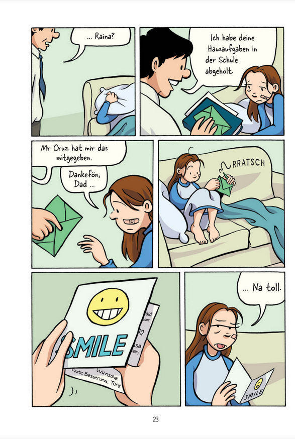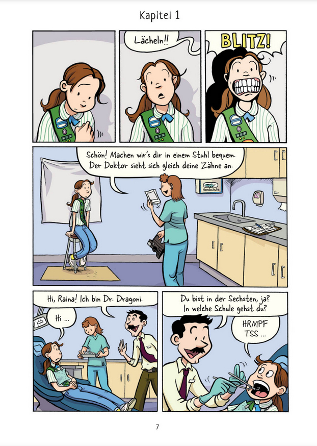 Wer lächelt, zeigt Zähne. Nur bei Raina klafft eine riesige Lücke, wo früher ihre Schneidezähne waren. Seit ihrem Unfall trägt sie eine peinliche Zahnspange. Und immer wieder muss sie zum Zahnarzt, zum Chirurgen, zum Kieferorthopäden. Da kann einem das Lachen schon einmal vergehen. Als ob sie sonst keine Probleme hätte! Pickel zum Beispiel. Und Jungs. Wie gut, dass sie an der neuen Schule wenigstens echte Freundinnen findet. Und am Ende auch wieder lachen kann.
