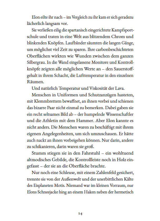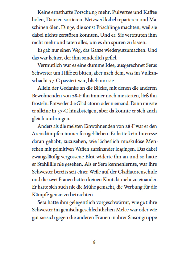 Stahllilie ist Gladiatorin auf dem Planeten Motis und eigentlich recht zufrieden mit ihrem Leben. Als jedoch ihre Schwester unter merkwürdigen Umständen verschwindet und ausgerechnet Seras Verlobter sie um Hilfe bittet, muss sie eingreifen. Als sie begreift, was gespielt wird, ist es fast zu spät.