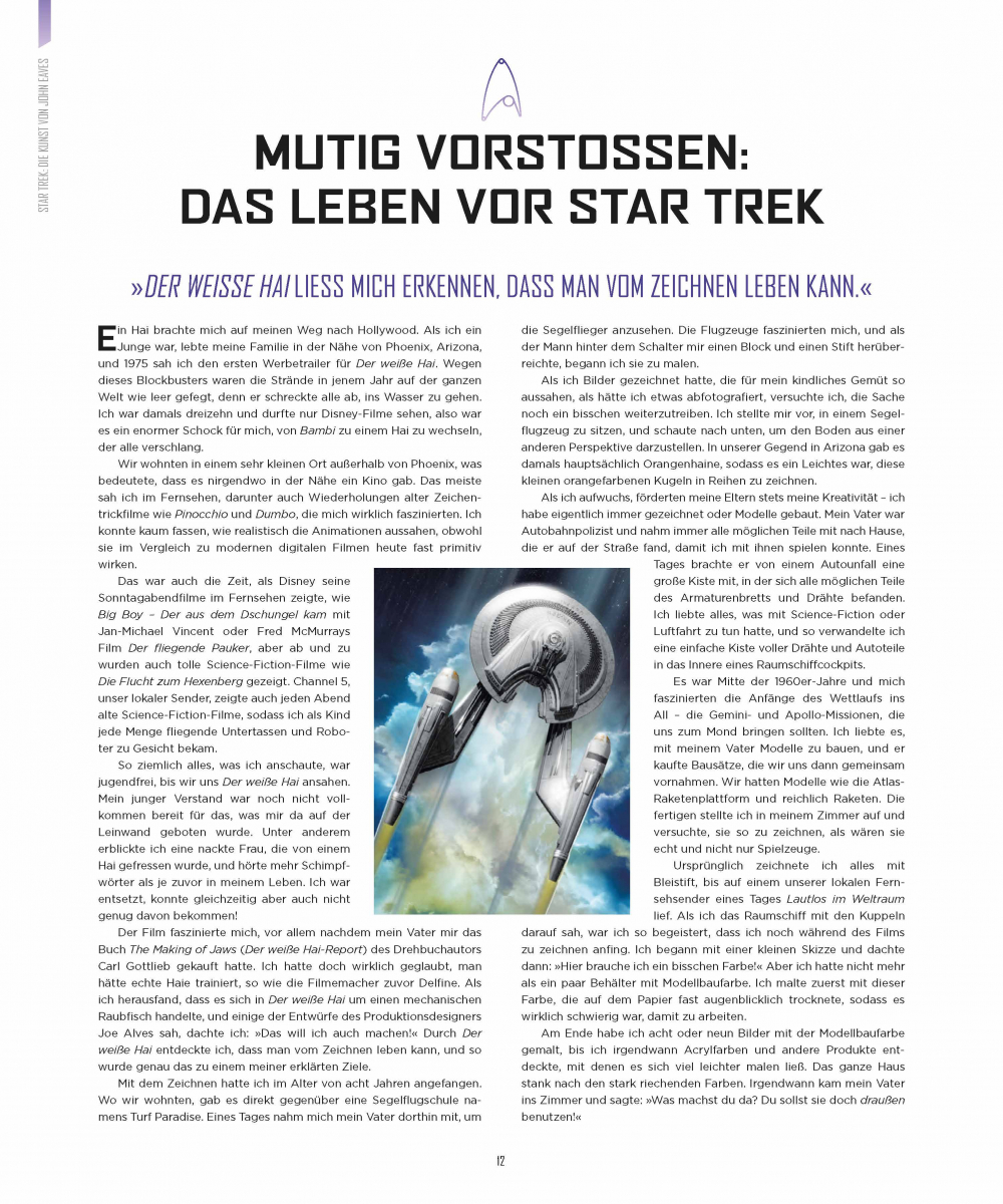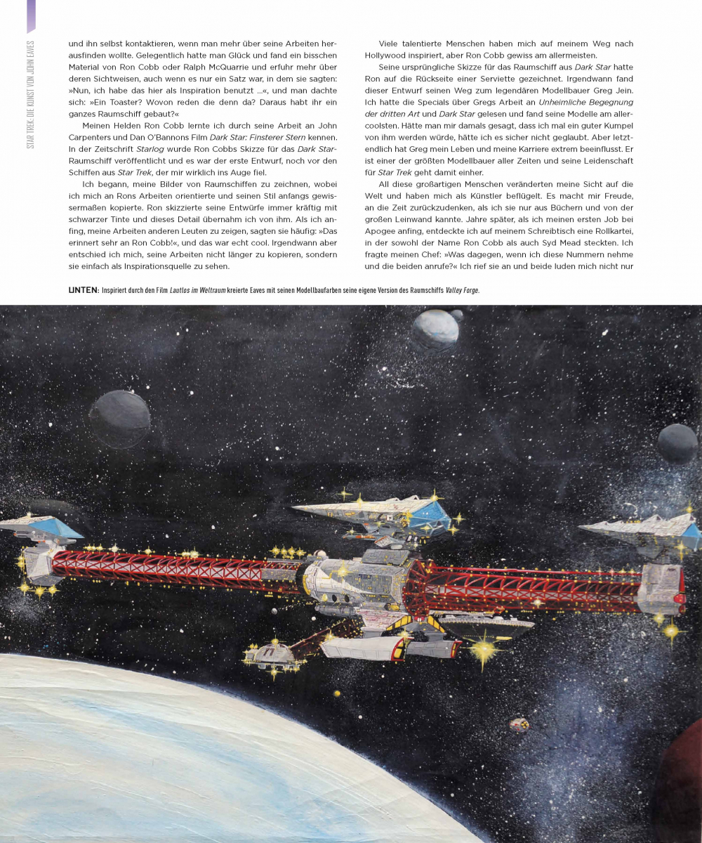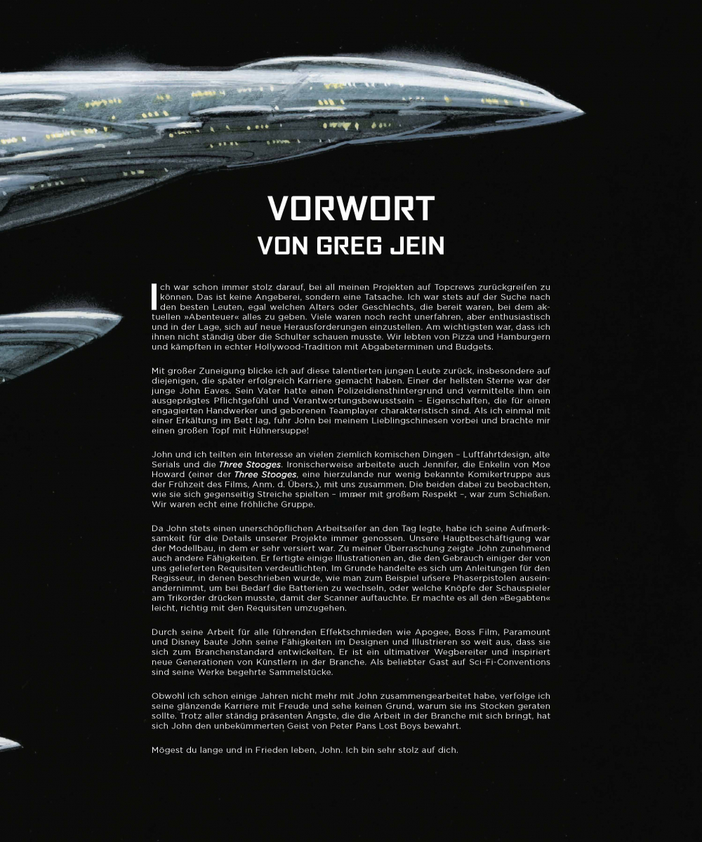 "Star Trek: Die Kunst von John Eaves“ stellt die umfangreichste Sammlung von Entwürfen und Illustrationen dar, die Eaves für das „Star Trek“-Universum geschaffen hat. Mit zahlreichen Bleistiftskizzen und Entwürfen gibt dieser Bildband den Fans einen Einblick in Eaves’ kreative Vision und die Fülle seiner Arbeit im Zentrum dieses bekannten Franchise.