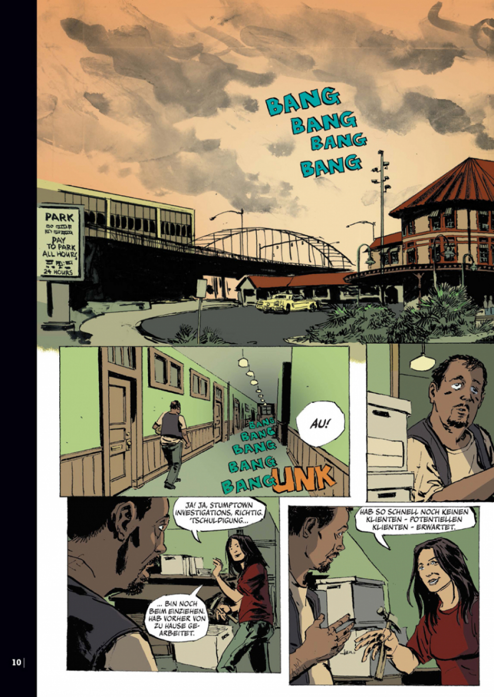 Dex Parios hat »Stumptown Investigations« ein nagelneues Büro gegönnt, und sie kommt kaum dazu es einrichten vor lauter Klienten, die sie abweisen muss, weil ihr letzter Fall sie bei den falschen Leuten ziemlich unbeliebt gemacht hat. Als Mim Bracca von der Band »Tailhook« an die Tür klopft und mit ein paar fetten Scheinen winkt, kann Dex es daher kaum erwarten, sich auf die Suche nach der verlorenen Lieblingsgitarre des Rockstars zu machen. Zwei Dinge findet die Schnüfflerin jedoch schneller raus, als ihr lieb ist: Die Gitarre ist nicht das einzige, was verloren gegangen ist, und Dex ist nicht die einzige, die danach sucht.