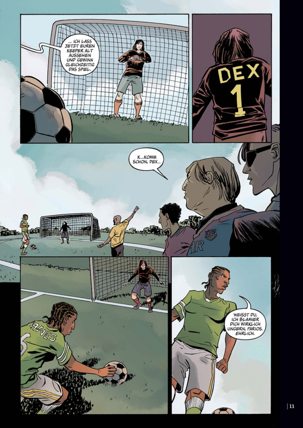 Neben ihrer Arbeit als Privatdetektiv und ihrem Bruder Ansel gibt es nur noch eine große Liebe in Dex Parios Leben: Fußball! Um genauer zu sein ihren Heimatverein, die »Portland Timbers«. Tickets für eine Autogrammstunde mit einem Starspieler runden ihren Stadiontag eigentlich ab, aber nach dem Spiel findet Dex einen ihrer ältesten Freunde – ebenfalls ein Timbers-Fan – aufs übelste zusammengeschlagen im Grünstreifen liegen. Hooligans? Dex ist wild entschlossen, der Sache auf den Grund zu gehen, selbst wenn sie dafür nicht nur Fußbällen Tritte verpassen muss!