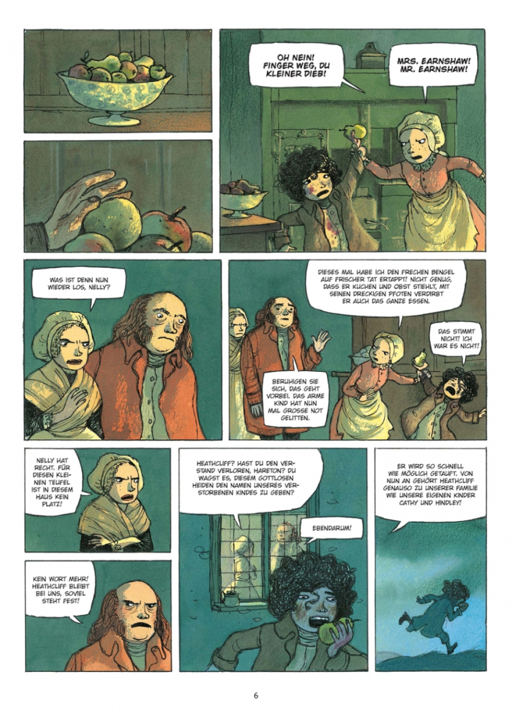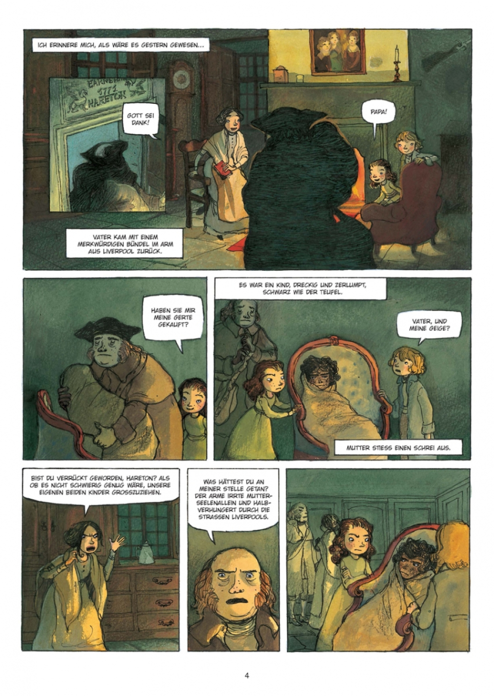 Eines Tages bringt der Vater von Cathy und Hindley ein Kind mit nach Hause, das ungepflegt im Äußeren und ungezogen in seinem Verhalten ist. Heathcliff, so der Name, wird adoptiert und damit zu einem Bruder seiner beiden leiblichen Kindern.