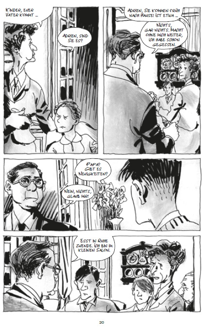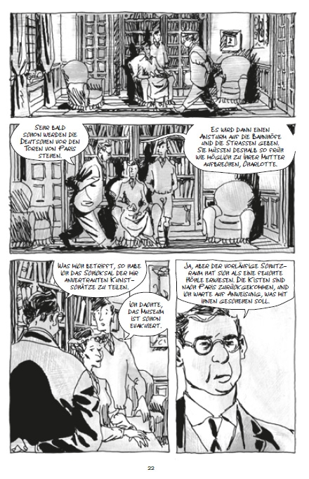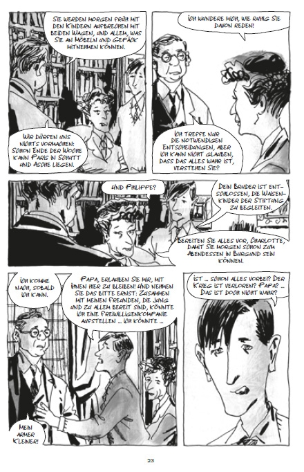 In der vorliegenden Graphic Novel bekommt Némirovskys Klassiker eine visuelle Dimension. Die unvergesslichen Romangestalten, deren Schick-sale sich während der großen Abwanderung aus Paris und dann der allmählichen Rückkehr kreuzen, prägen sich nun auch durch ihre groß-artige zeichnerische Charakterisierung ein: Der Bankier Corbin, das lie-benswürdige Ehepaar Michaud, der Familienclan der Péricands, der unglückselige Kaplan Philippe, die frivole Arlette Corail, der sinistre Schriftsteller Corte und seine naive Geliebte, und alle anderen, die Verlierer, die Schurken, die Anständigen und die Toten.