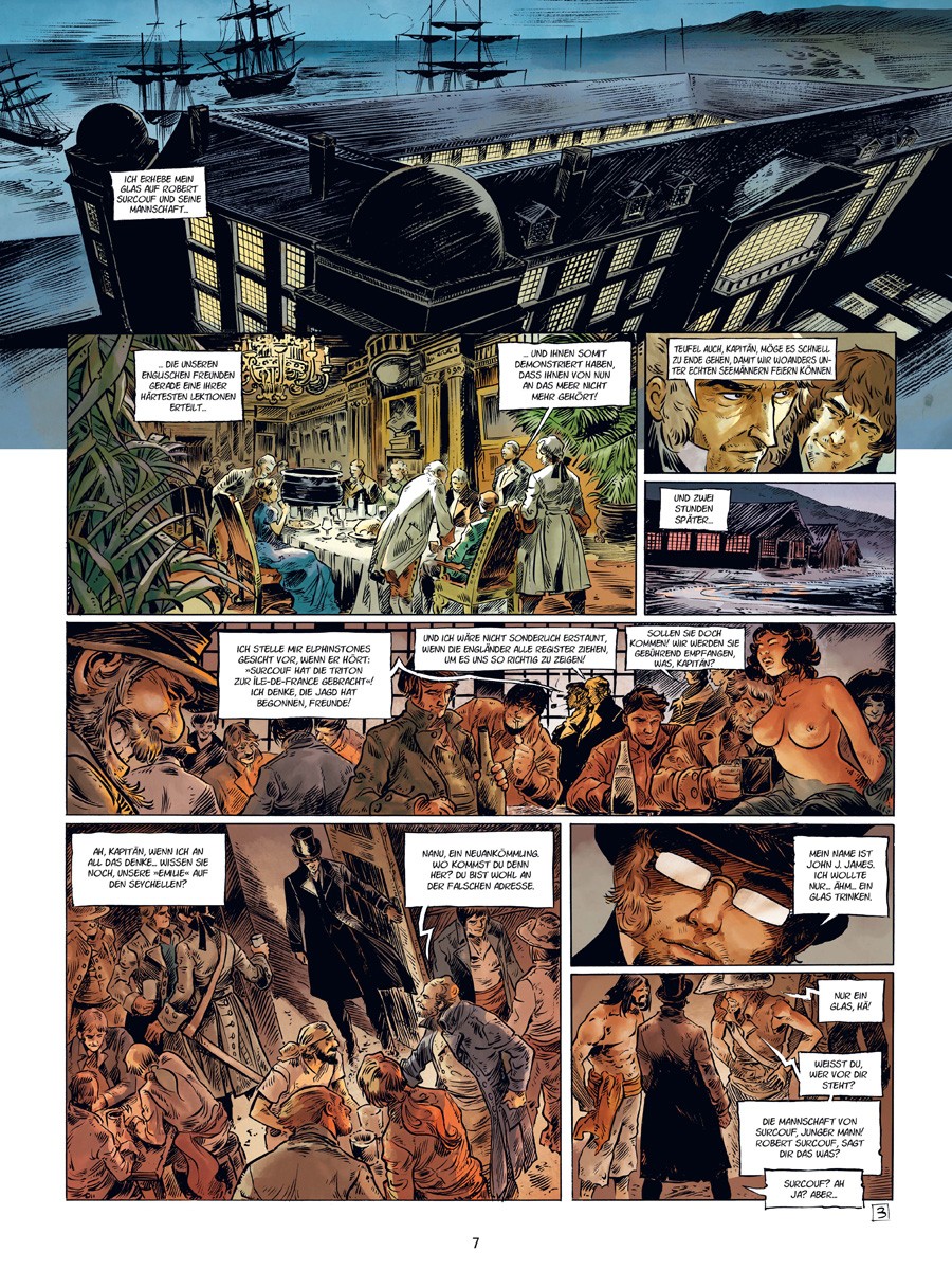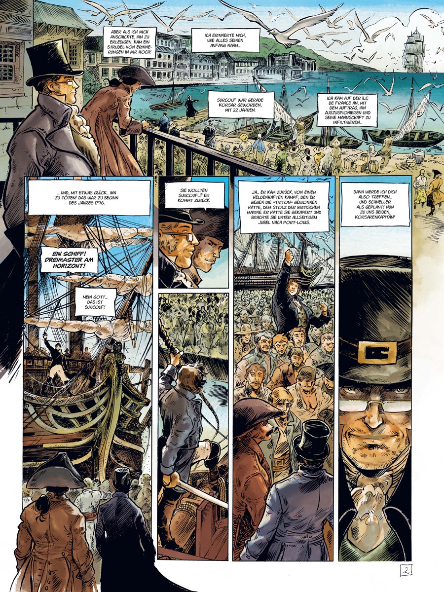 Erick Surcouf, der Ururneffe von Robert Surcouf (1773–1827), dem »König der Korsaren« von Napoleon I., ist Schatzjäger und Schriftsteller. Seit dreißig Jahren sucht er auf allen Weltmeeren nach versunkenen Schiffen. Er hat zahlreiche Expeditionen organisiert und ein Dutzend Wracks gefunden. Nach zahlreichen Romanen über seinen Vorfahren und dessen Entdeckungen, ist »Surcouf« nun seine erste Comicveröffentlichung.