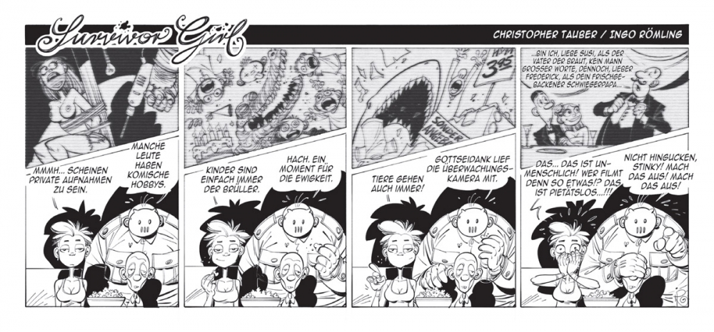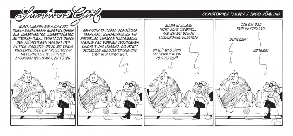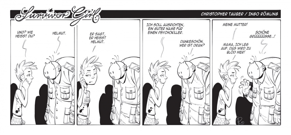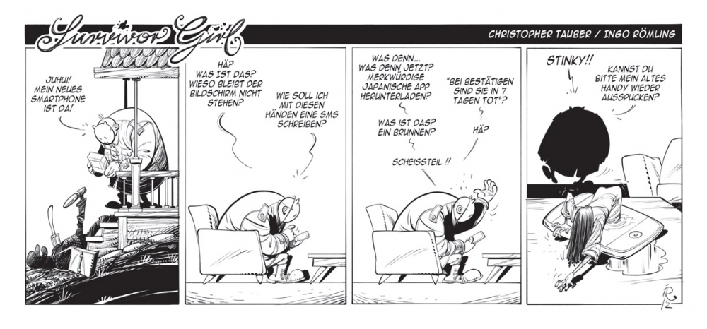 Nun liegen die ersten Abenteuer des Survivor Girls Phoebe und ihren Hausgenossen Helmut, dem sensiblen Serienkiller mit der Katzenmaske, dem langsamsten Zombie der Welt Stinky und dem Filmkritiker Robert Georginio erstmals als Printversion vor, getreu dem Motto: “Wenn im Internet kein Platz mehr ist, kehren die Comics in die Bücher zurück!”