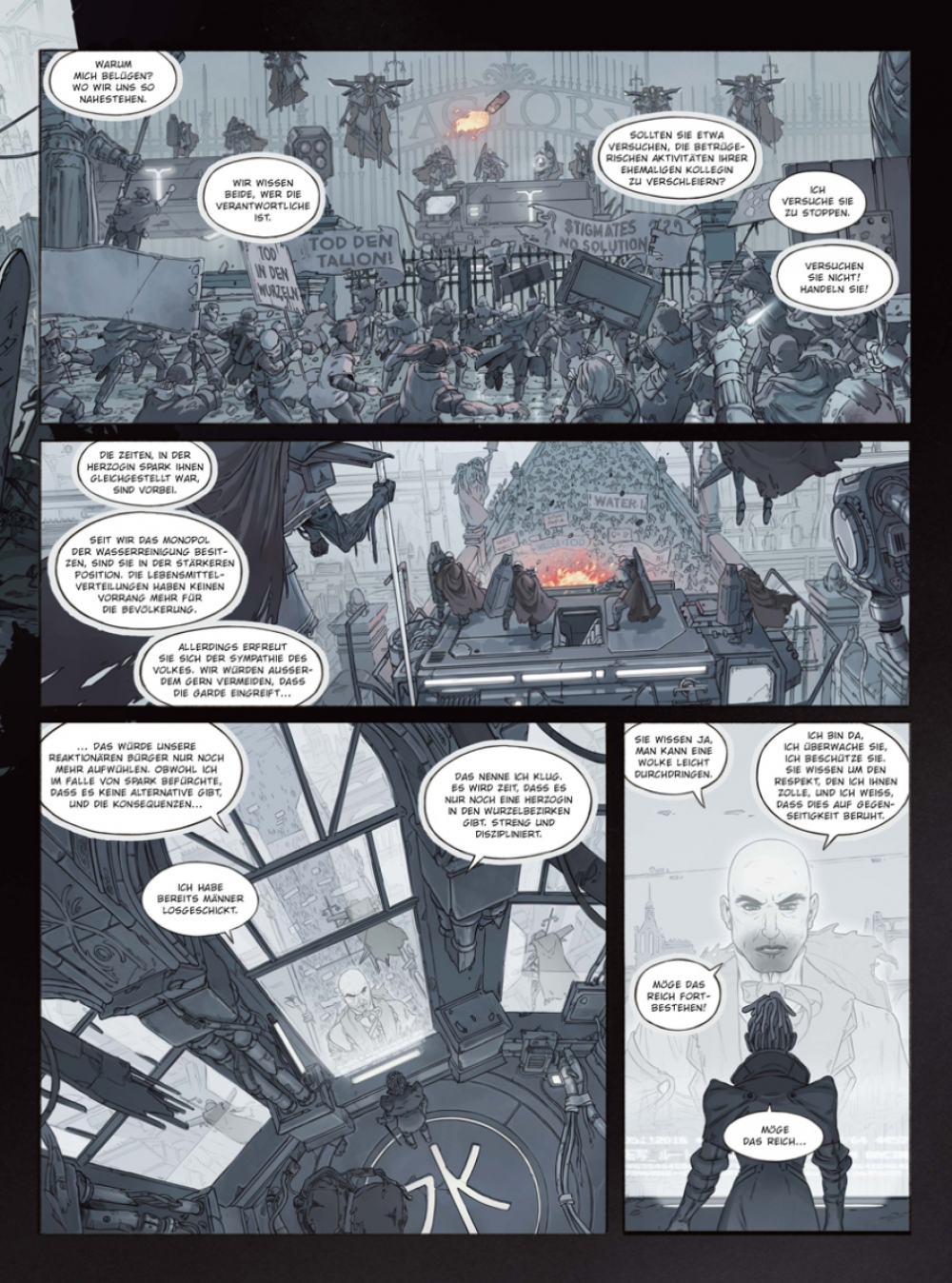 Sylvain Ferret verschreibt sich mit »Talion« einer Ästhetik, die er als »Gothic Cyberpunk« bezeichnet. Er öffnet für uns die Türen zu einer faszinierenden Welt, die wie ein dunkler Spiegel unserer eigenen wirkt. Verschwenderische Zeichenkunst sowie komplexe Charaktere und Themen machen diese Comic-Trilogie zu einem schwindelerregenden, süchtig machenden Erlebnis.