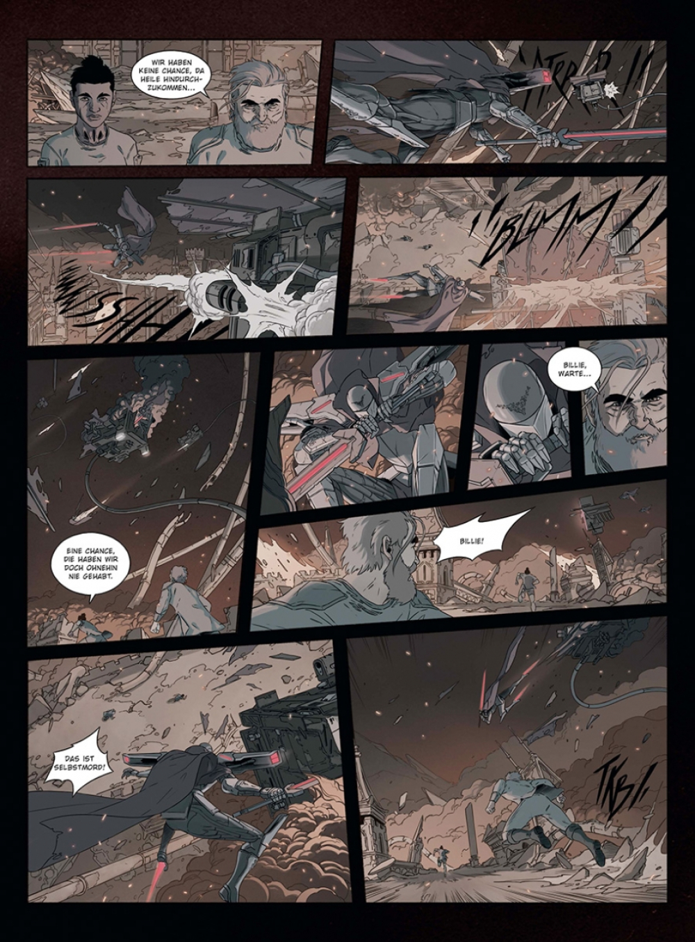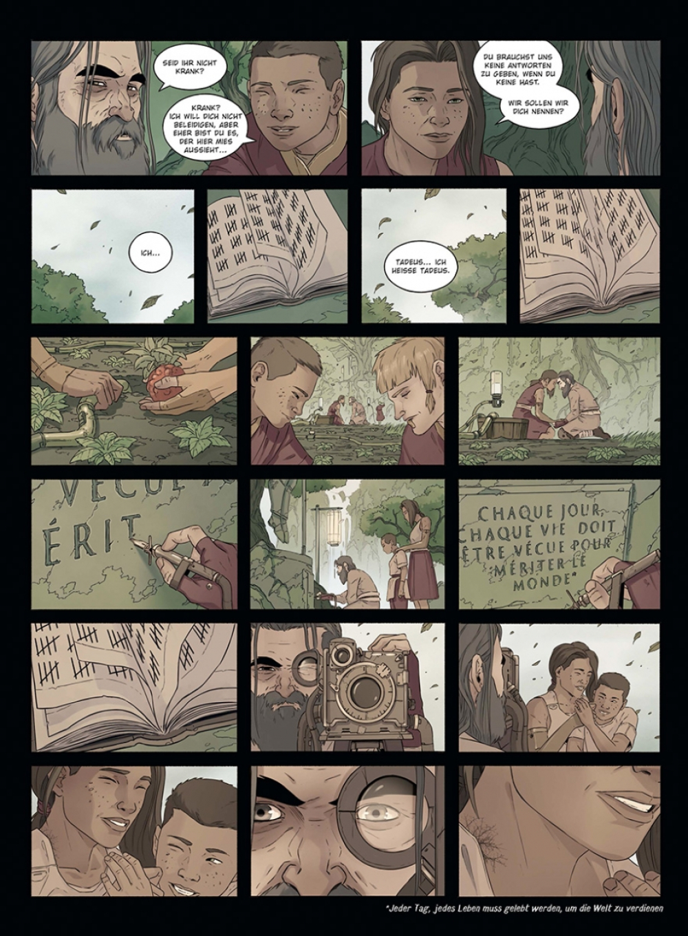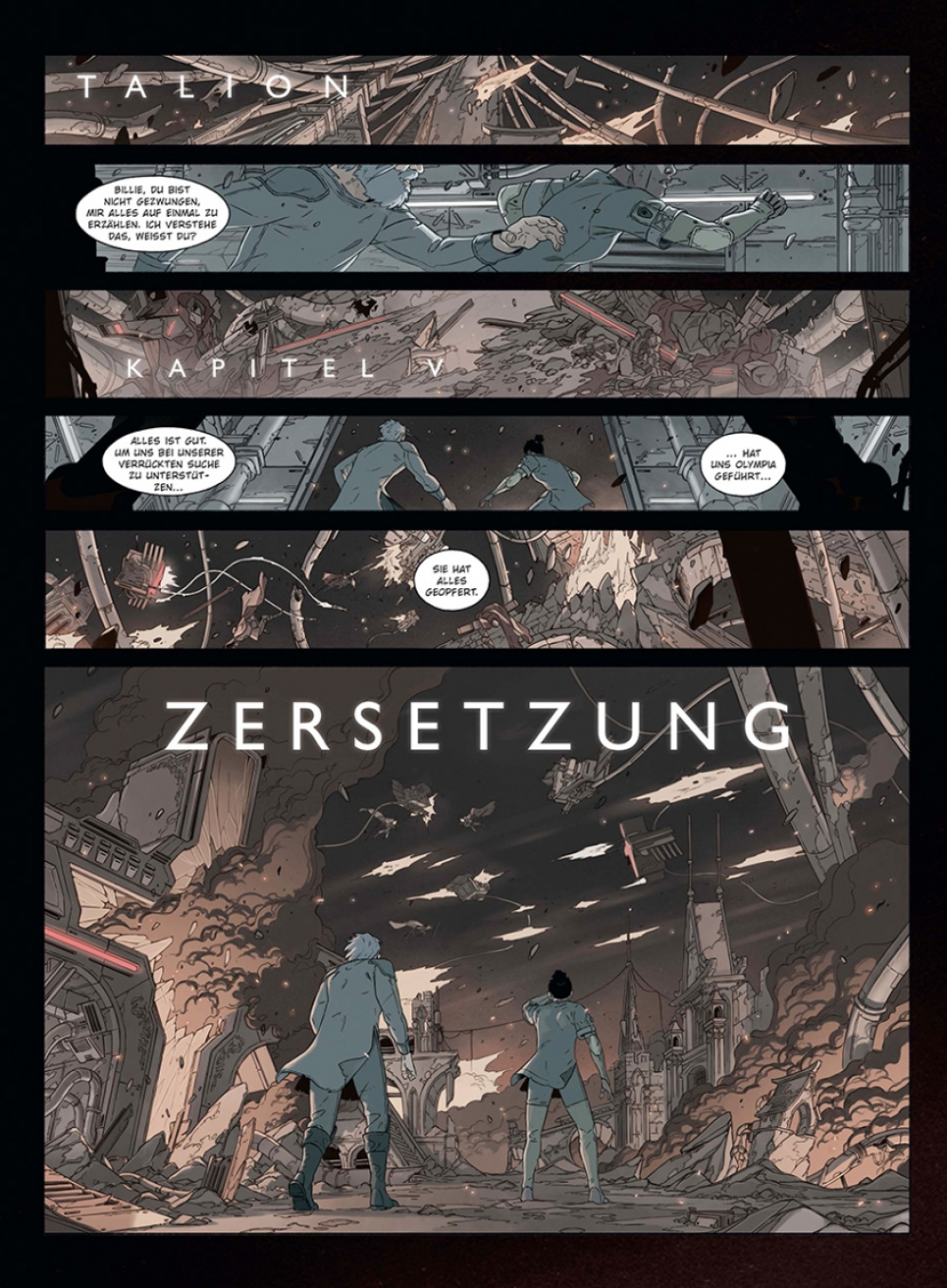 Es war die Seuche, die uns vernichtete. Sie drang ein in unsere Häuser und unsere Ernten, in unser Fleisch und in unser Blut, in unser Wasser, unseren Boden und in die Luft, die wir atmeten. Der ökologische Kollaps der Erde war gekommen. In ForenHaye, der letzten Bastion der Menschheit im Königreich Talion, kämpft man mit allen Mitteln ums überleben. Doch die Gesellschaft zersetzt sich gleichzeitig von innen: Abgeschieden in der Oberstadt genießen die Adeligen sauberes Wasser und reine Luft, während die ärmsten der Armen in den Wurzelbezirken verzweifelt um jeden Schluck und jeden Atemzug ringen. Als eine rebellische Tochter aus gutem Hause auf einen geheimnisvollen Streuner trifft, der in den Ruinen der alten Stadt nach einem Heilmittel sucht, wird ein Funke der Hoffnung entfacht. Vielleicht können die siechende Menschheit und die sterbende Natur doch noch zueinander finden. Sylvain Ferret verschreibt sich mit »Talion« einer ästhetik, die er als »Gothic Cyberpunk« bezeichnet. Er öffnet für uns die Türen zu einer faszinierenden Welt, die wie ein dunkler Spiegel unserer eigenen wirkt. Verschwenderische Zeichenkunst sowie komplexe Charaktere und Themen machen diese Comic-Trilogie zu einem schwindelerregenden, süchtig machenden Erlebnis.