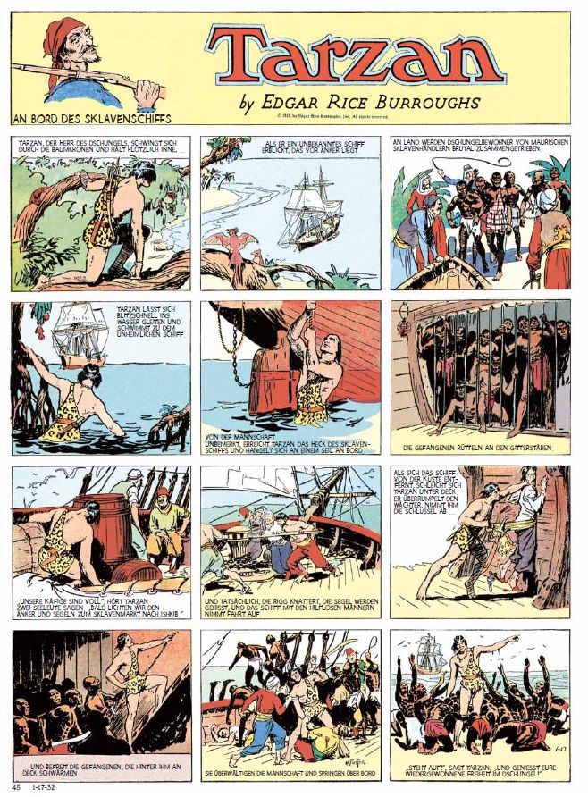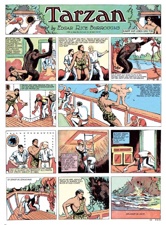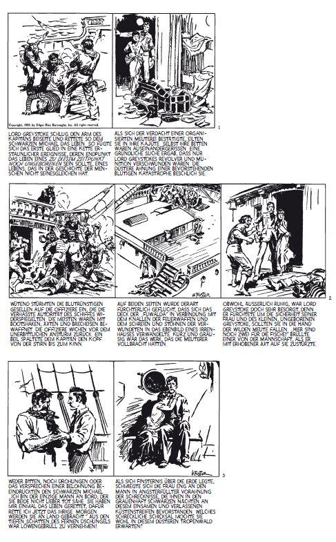 Zum Start wird dieser Band neben einem umfangreichen Vorwort von Detlef Lorenz auch die allererste Bildergeschichte (1928) von Hal Foster enthalten. In sehr detaillierten Schwarzweiß-Zeichnungen erzählt Foster, wie bei Tarzan alles begann.
