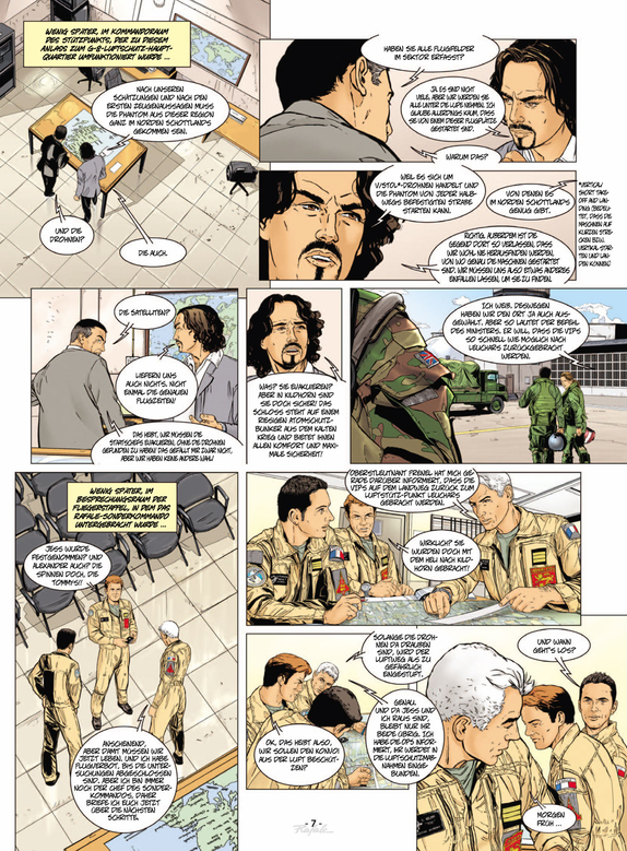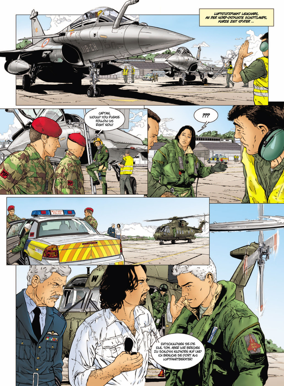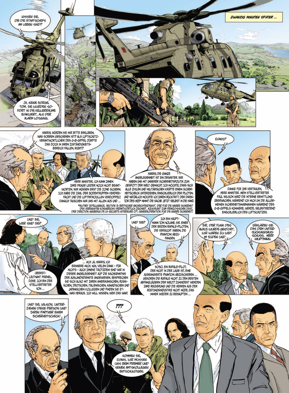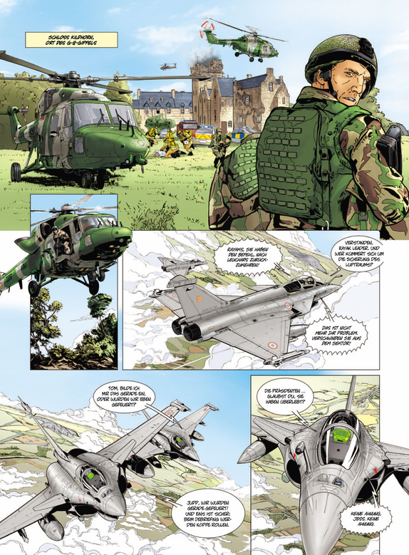Centre d’Essais des Landes* … Die Drohne Black Shark stellt bei einem Treffen französischer Generäle und Beamten auf eindrucksvolle Weise ihre Kampftauglichkeit unter Beweis. *Startplatz für Höhenforschungsraketen London … Die beiden anlässlich einer internationalen Waffenmesse nach London geschickten Black Sharks werden mit einem Skycrane-Hubschrauber von einem geheimnisvollen paramilitärischen Kommando gestohlen. Schottland … Während der G-8-Gipfel fi eberhaft unter hohen Sicherheitsvorkehrungen vorbereitet wird, landen Tom und Jessica mit ihrer Rafale auf einem Stützpunkt der Royal Air Force, um an den Luftschutzmaßnahmen teilzunehmen, die die Sicherheit des Präsidenten gewährleisten sollen. Die Orkney-Inseln Eine geheimnisvolle Gruppierung namens „Anarchy 2012“ beendet gerade ihre hochtechnischen Vorbereitungen. Ihr Ziel: ein abgelegenes schottisches Schloss, auf dem die Staatsoberhäupter des G-8-Gipfels erwartet werden. Für unsere Helden beginnt die Routine der Überwachungsflüge, die jedoch schon bald unterbrochen wird, als der Radar und Funk aller Patrouillenfl ugzeuge plötzlich gestört wird. Als dann auch noch ein Apache-Hubschrauber abgeschossen wird, besteht kein Zweifel mehr: Der G-8-Gipfel wird angegriffen …