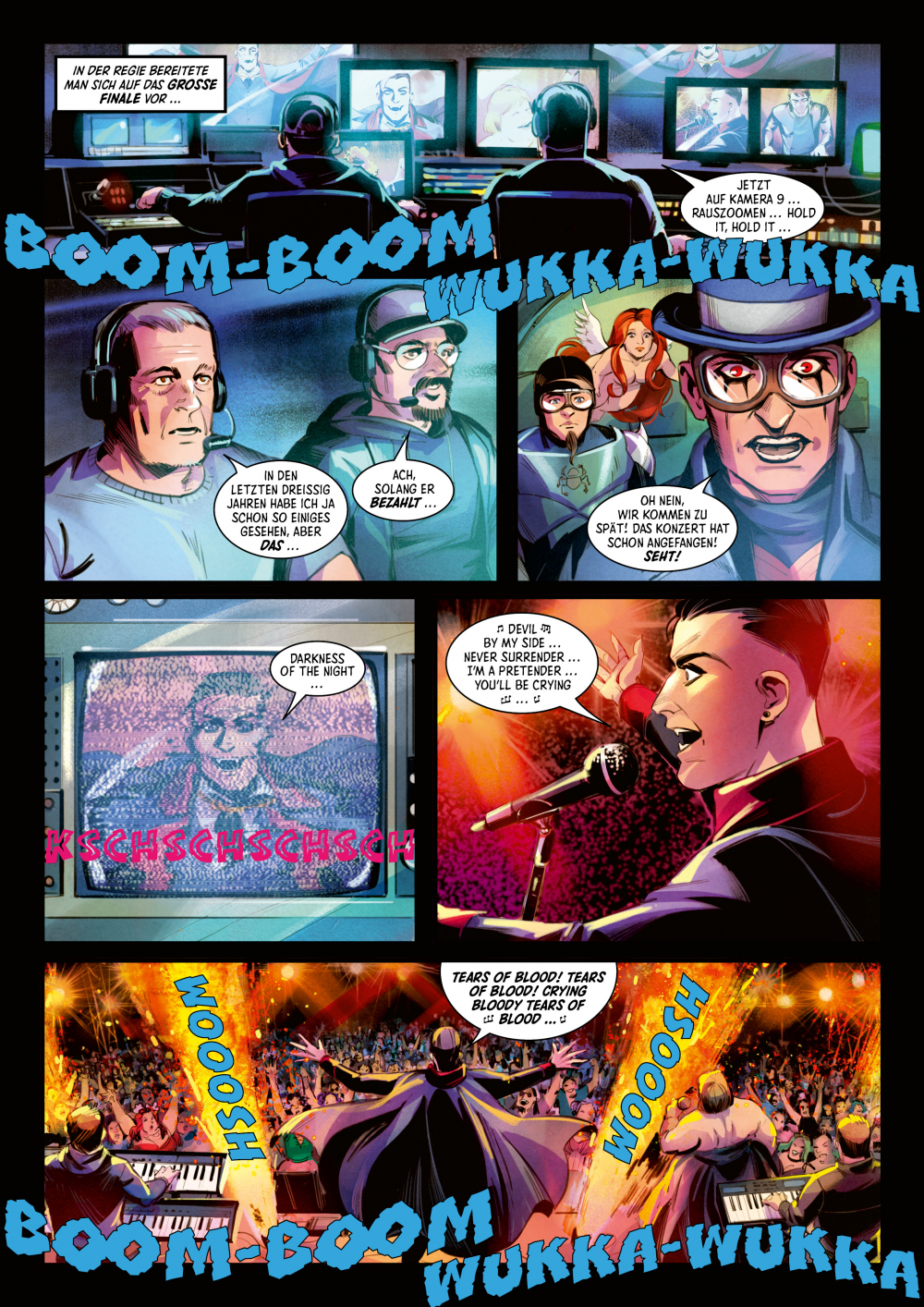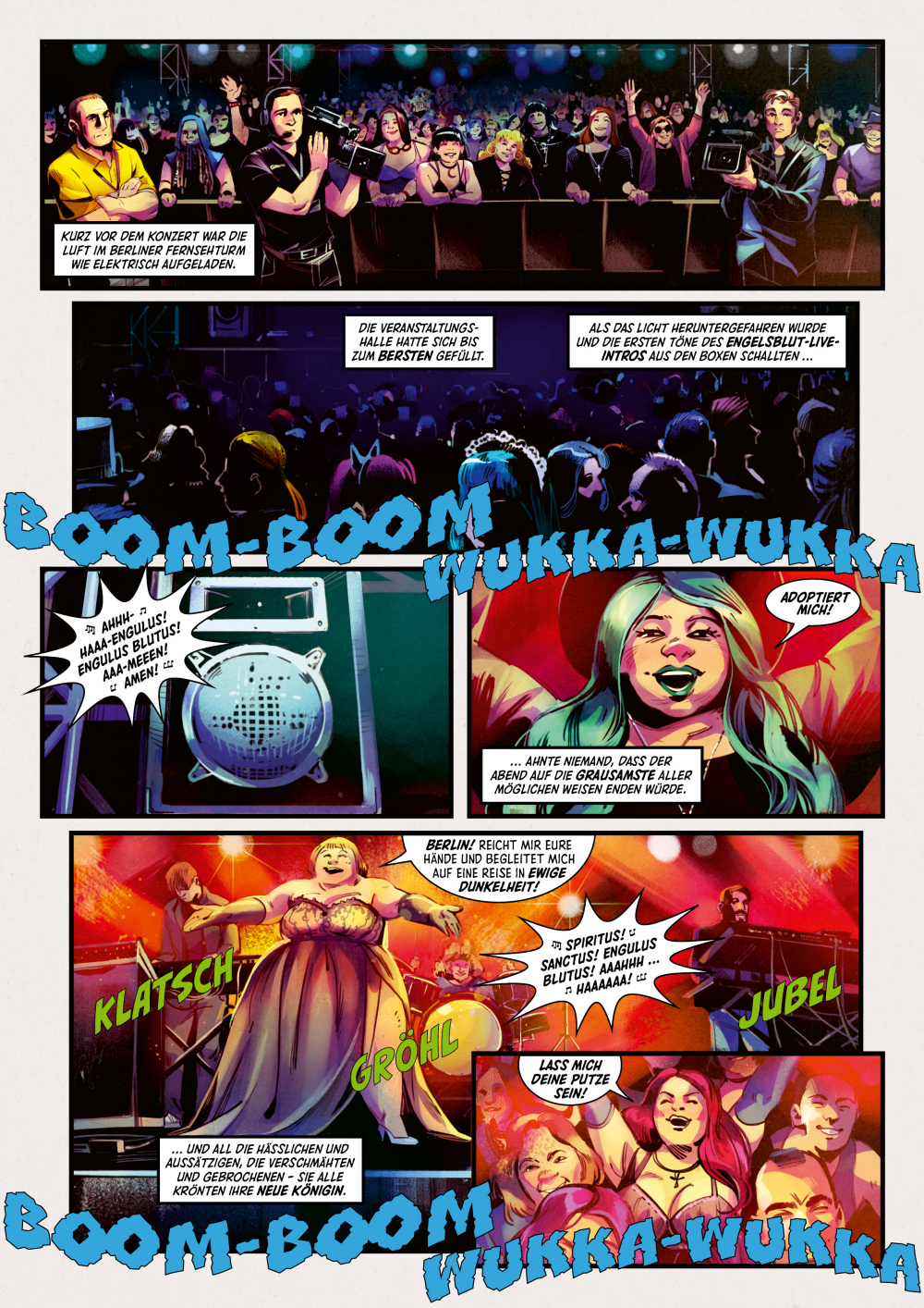 Unterdessen trachtet DRACUL BERLIN mit seiner Hausfrauen-Band ENGELSBLUT nach der Weltherrschaft – ein direkt aus DRACULS PENTHOUSE übertragenes ENGELSBLUT-Konzert soll die BürgerInnen der Bundesrepublik in GOTISCHE SCHWEINE-MUTANTEN verwandeln! Während die Überreste von DR. PATHOS im eisigen Norden Russlands in einer UNBESIEGBAREN KAMPFMASCHINE verbaut werden, findet ein einsames SCHULMÄDCHEN den murmelnden Kopf eines Orakels in einer Berliner Seitenstraße ...