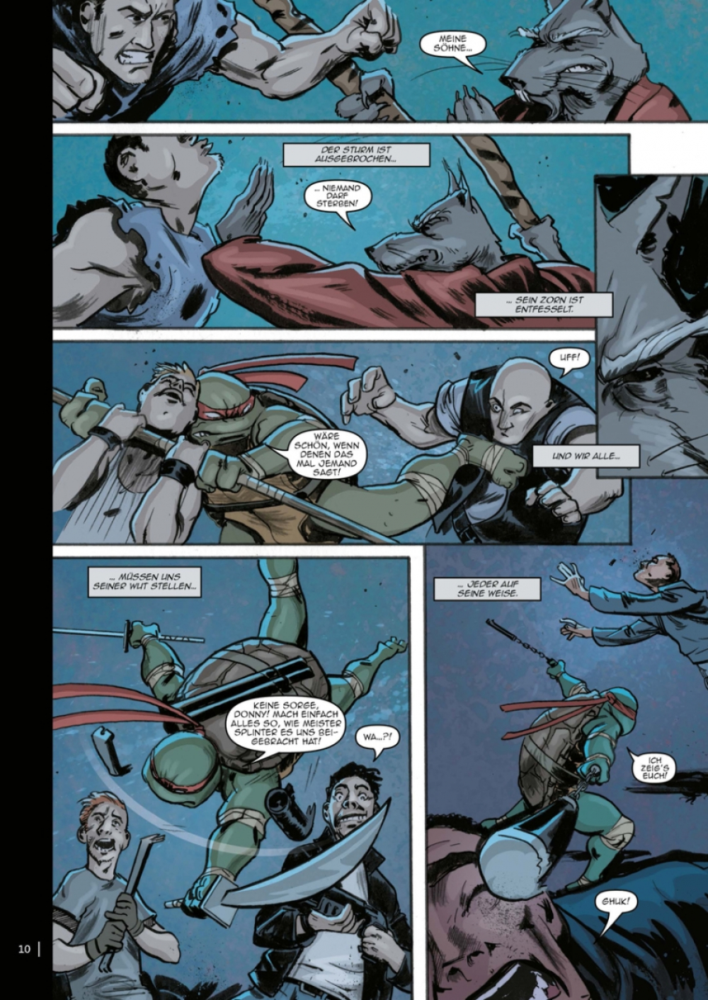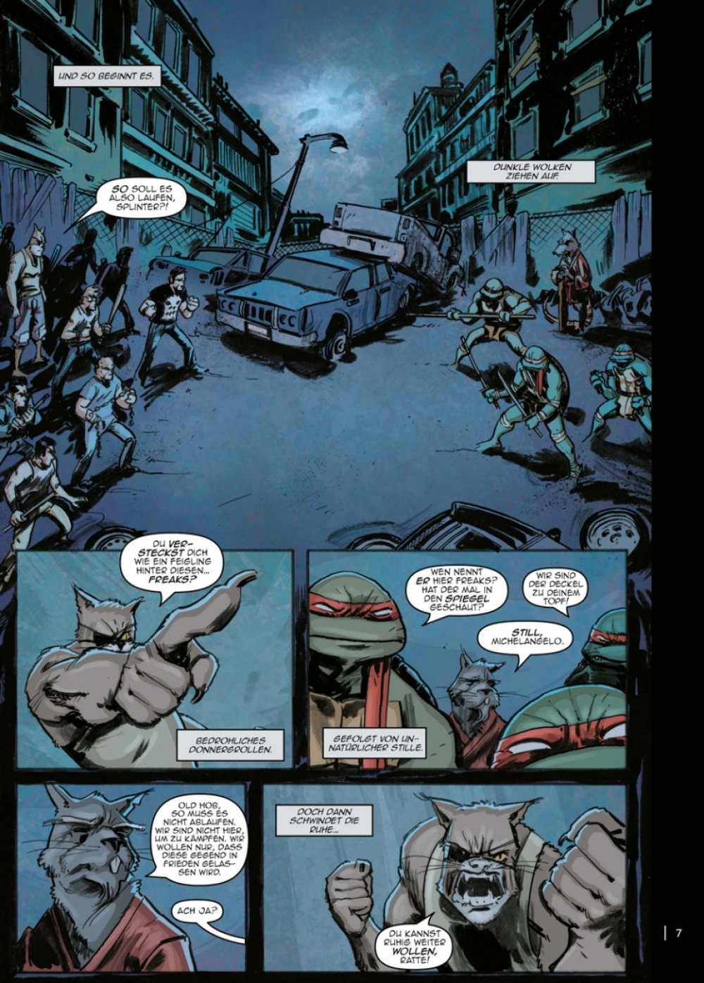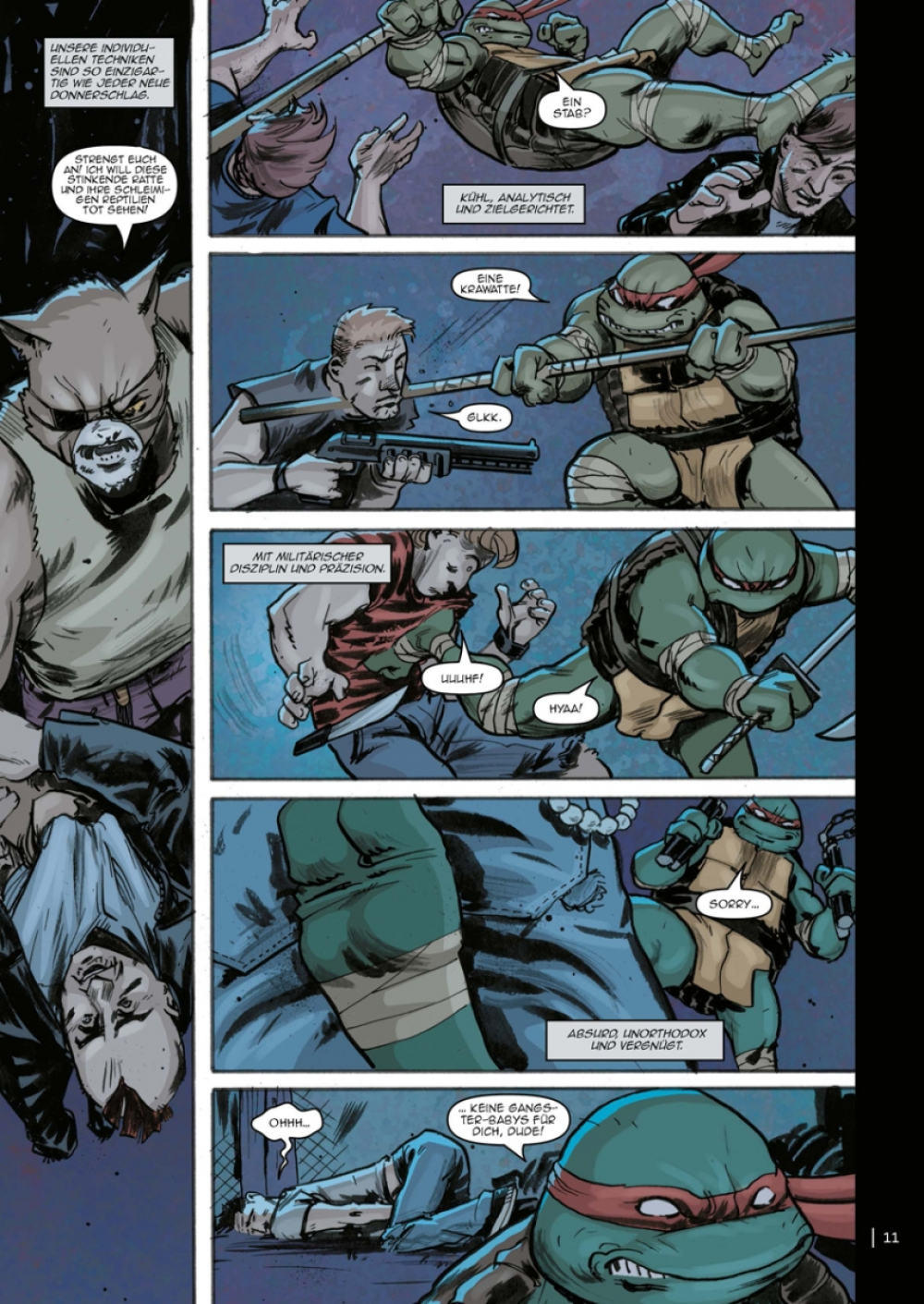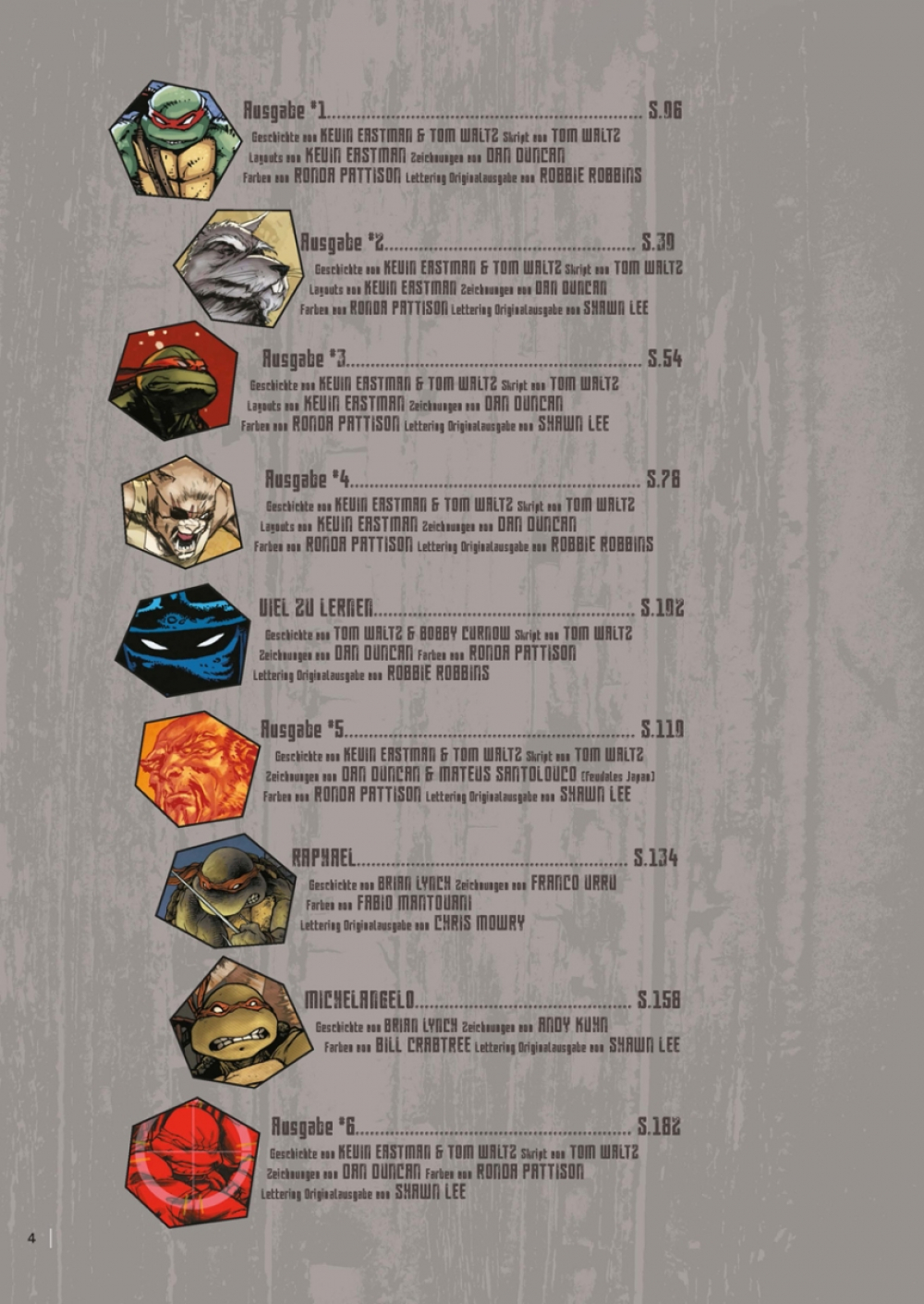 Band 1 beinhaltet die Hefte 1-12 der TMNT-Hauptserie sowie die Oneshots zu Raphael, Michelangelo, Donatello, Leonardo und Splinter.