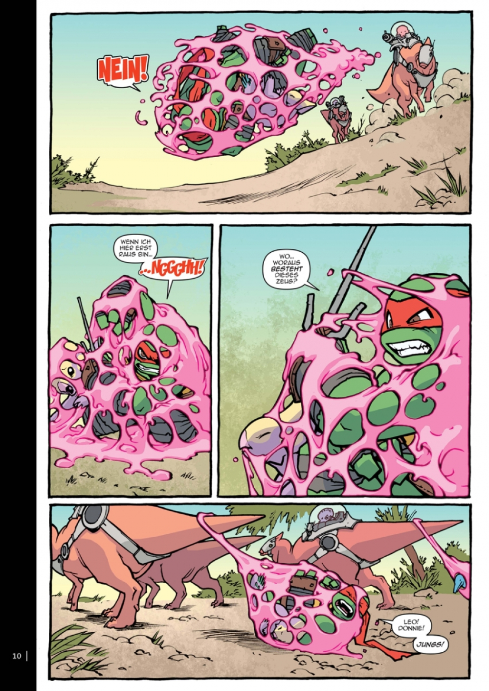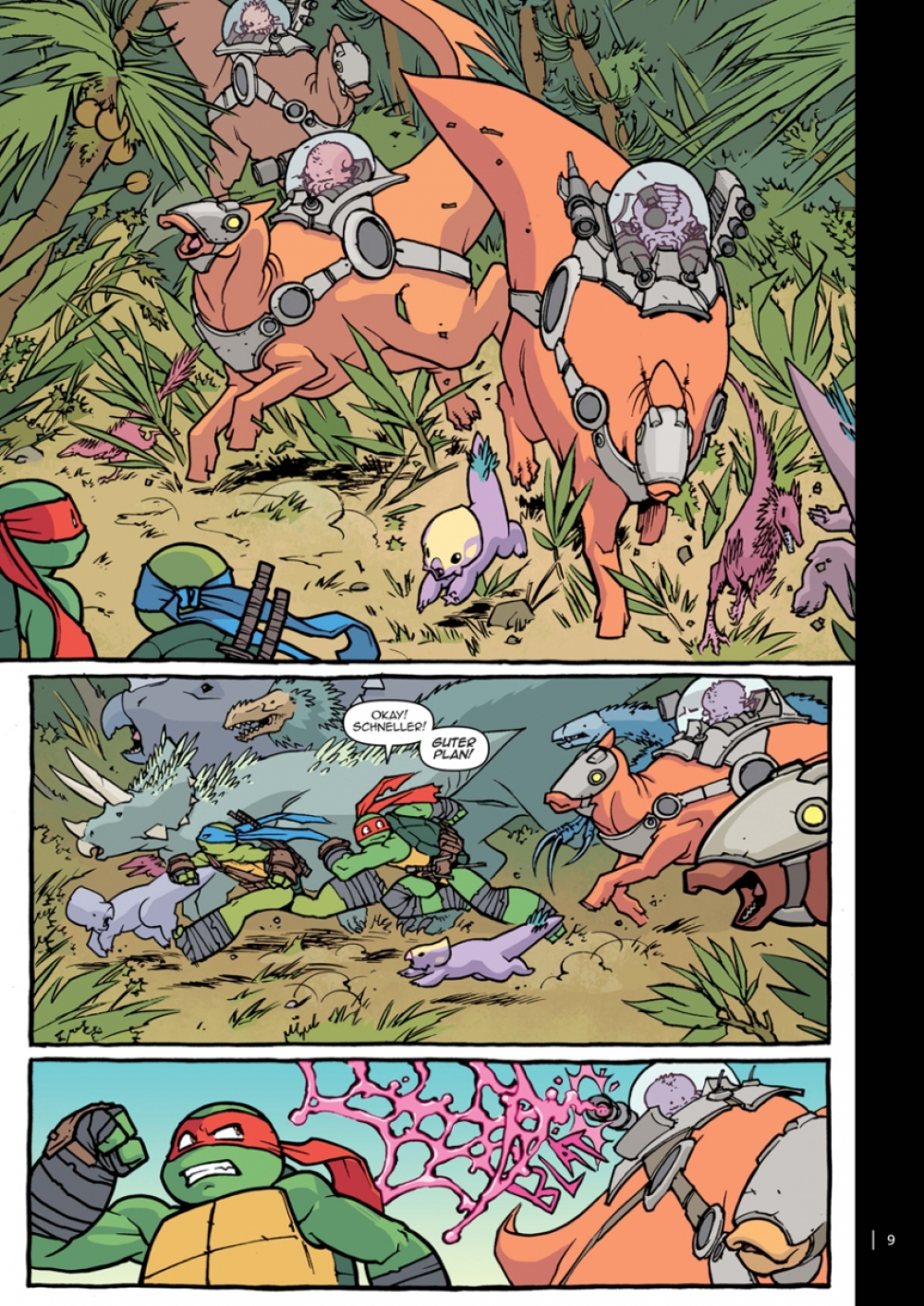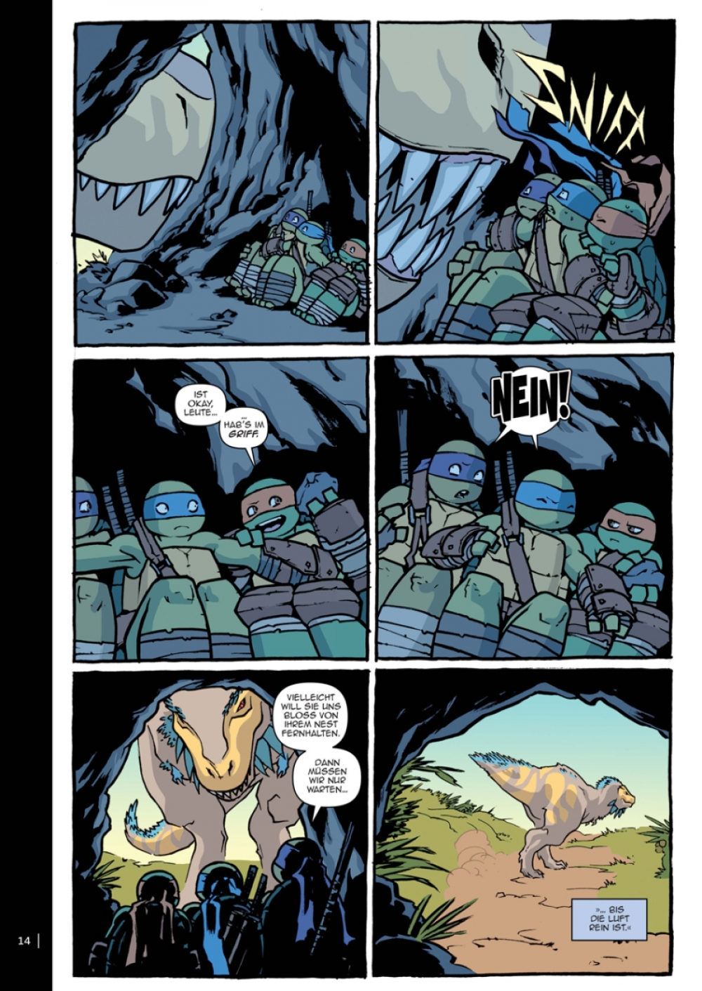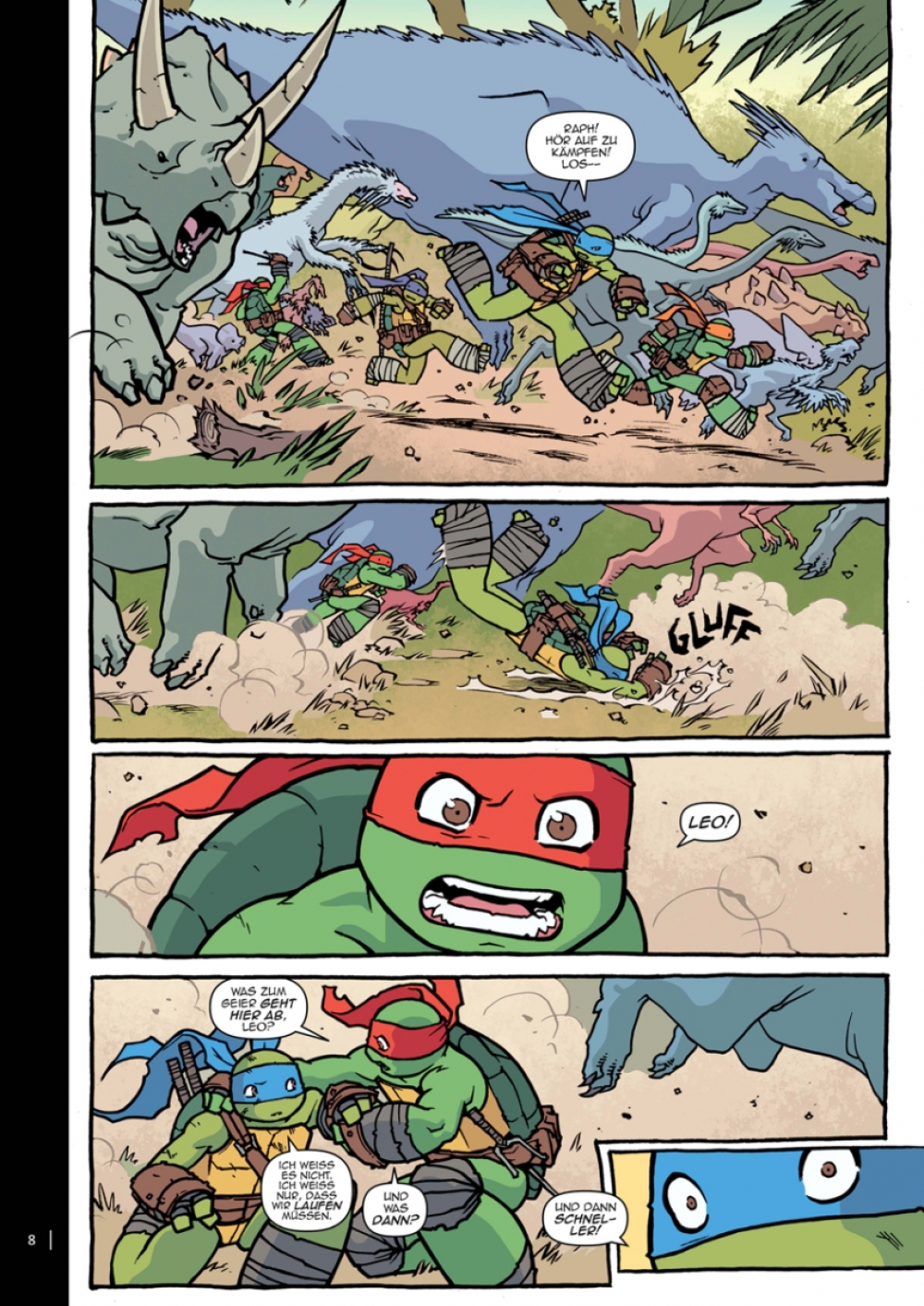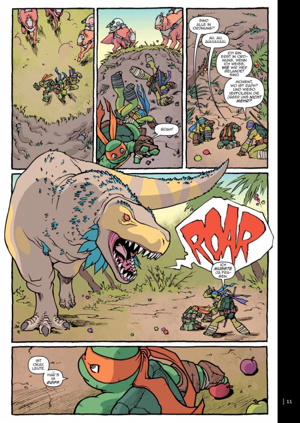 Band 5 beinhaltet die Hefte 38-44 der TMNT-Hauptserie sowie die Hefte 1-4 der »TMNT Saturday Morning Adventures« als deutsche Erstveröffentlichung.