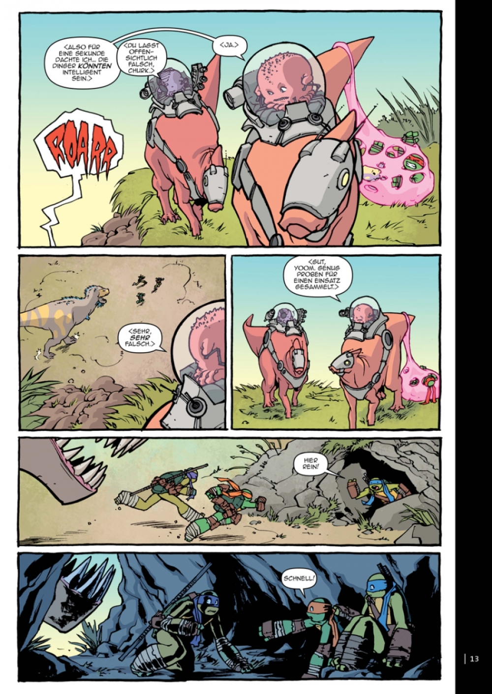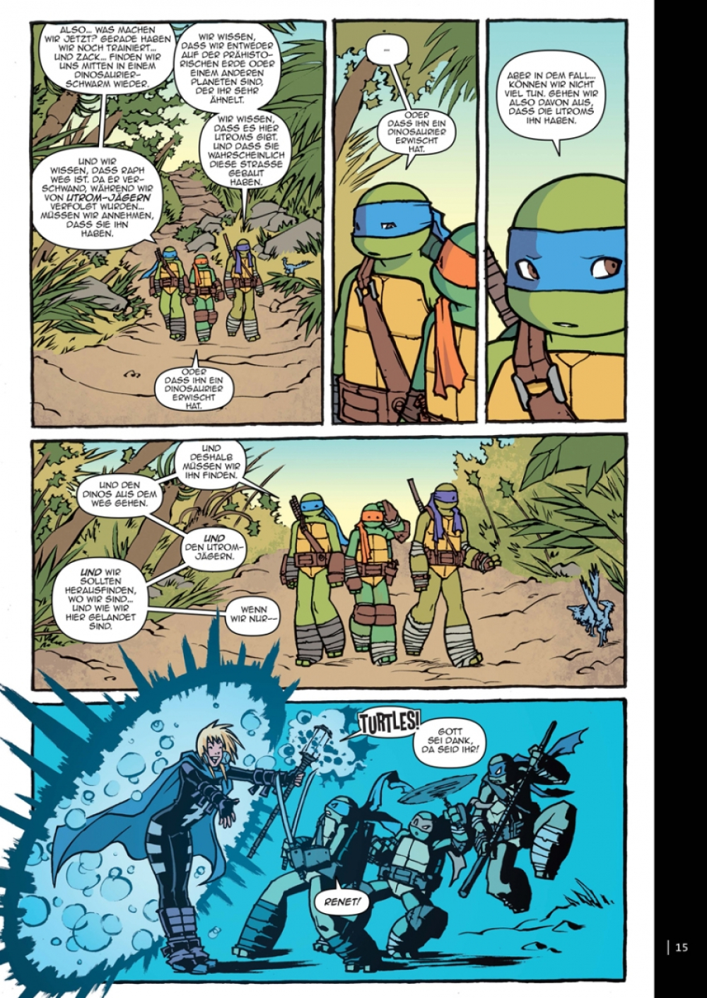 Erlebe sämtliche Abenteuer der heldenhaften Panzerkröten in der empfohlenen Lesereihenfolge, inklusive Oneshots, Crossover-Episoden und Special Events! Durch die Hilfe eines freundlichen Dimensionsreisenden gelingt es den Turtles, einer misslichen Lage zu entkommen und sie reisen rückwärts durch die Zeit. Derweil treffen Shredder und Krang endlich erneut aufeinander... aber werden sie es auch schaffen, ihre Kräfte zu vereinen, um ihre Ziele zu erreichen? Old Hob bleibt ebenfalls nicht untätig und perfektioniert die Kunst, Mutanten zu erschaffen. Außerdem in dieser Ausgabe: die kultigen Abenteuer eurer Lieblingshelden zum Samstagmorgen!