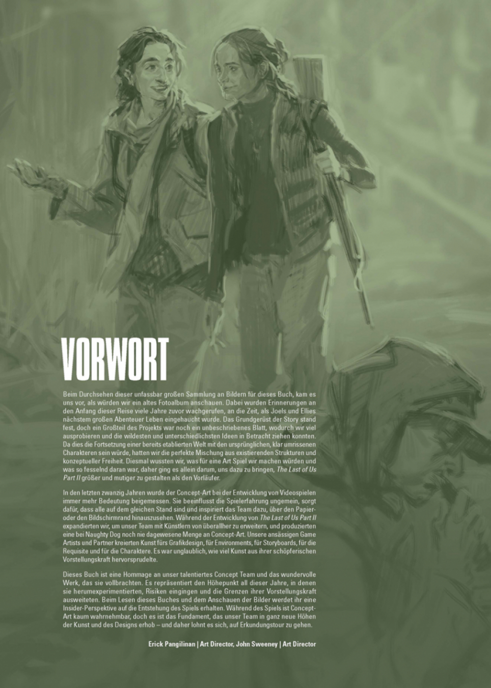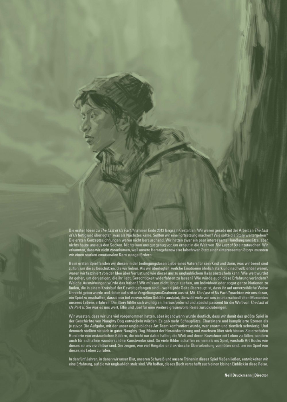Dieses hochwertigen Artbook umfasst auf jeweils über 170 Seiten exklusive Konzeptzeichnungen aus der Entwicklung von »The Last of Us II«, aufschlussreiche Kommentare der Künstler und Produzenten sowie detaillierte Aufzeichnungen zur Entwicklung des modernen Klassikers vom Spielstudio Naughty Dog.