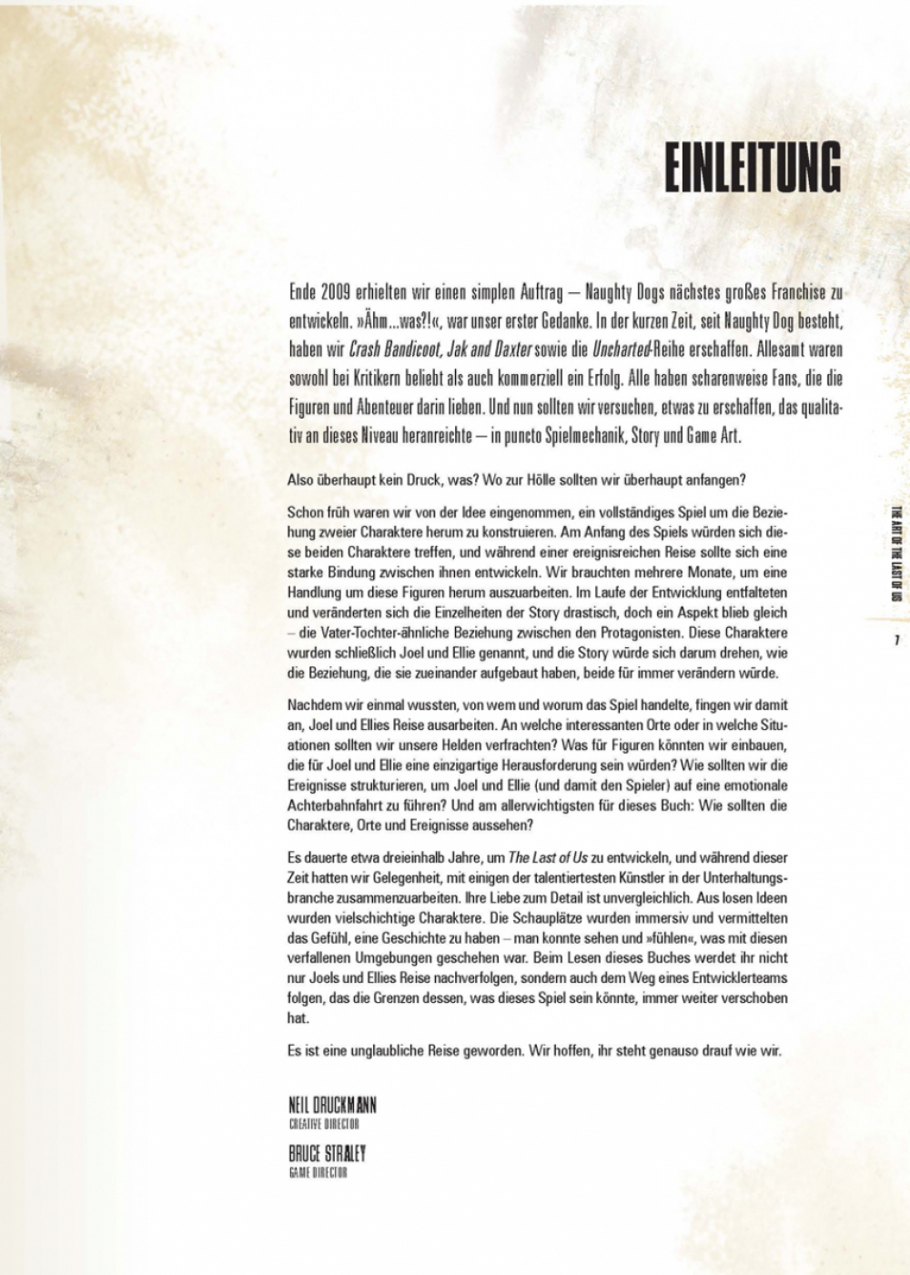 Dieses hochwertigen Artbook umfasst auf jeweils über 170 Seiten exklusive Konzeptzeichnungen aus der Entwicklung von »The Last of Us«, aufschlussreiche Kommentare der Künstler und Produzenten sowie detaillierte Aufzeichnungen zur Entwicklung des modernen Klassikers vom Spielstudio Naughty Dog.