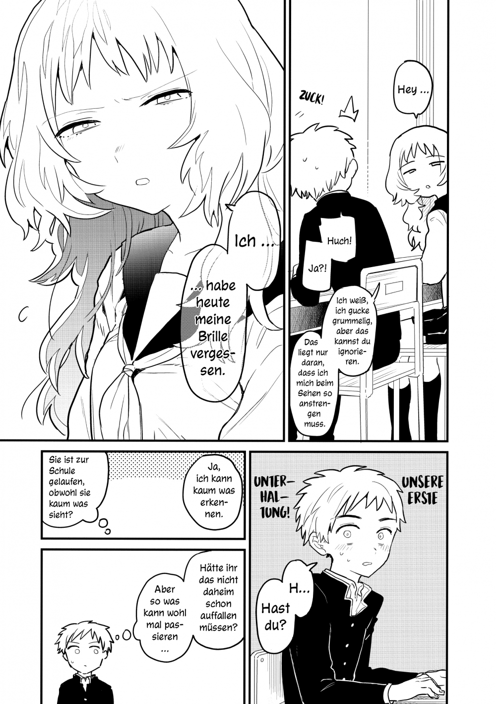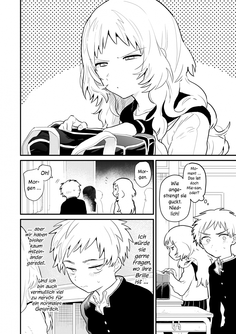 Für Komura beginnt das Schuljahr mit einer neuen Sitznachbarin - der Brillenträgerin Mie. Schon bald verliebt er sich in seine eigenwillige Mitschülerin ... die andauernd ihre Brille vergisst! Komura sieht in Mies Schussligkeit die ideale Chance, sie besser kennenzulernen. Denn wenn er ihr durch ihren quasi blinden Alltag hilft, verbringt er automatisch mehr Zeit mit ihr. Doch ob sein armes Herz diese ständigen emotionalen Höhenflüge verkraften wird?