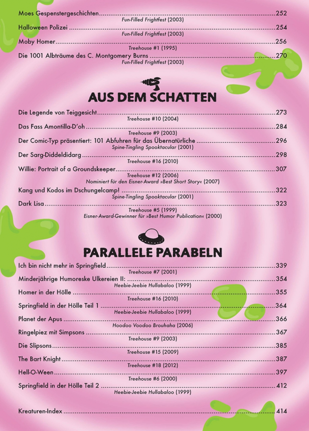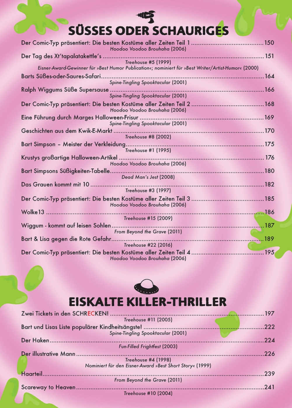 Im »Treehouse of Horror« begann 1995 die unheimliche Verbindung des gruseligsten aller Feste und der berühmtesten aller TV-Familien – unheimlich komisch und unheimlich starbesetzt! 23 Spezialausgaben der »The Simpsons«-Comics sind seitdem erschienen und bringen das Who’s Who von Springfield mit den kultigsten Klassikern aus Horror, SciFi und Fantasy zusammen. Darüber hinaus haben sich im Laufe der Zeit neben herausragenden Comic-Schaffenden wie Sergio Aragonés, Michael Allred, Paul Dini, Stan Sakai und Jill Thompson auch internationale Superstars wie Mark Hamill und Patton Oswalt sowie die Musiklegenden Alice Cooper und Lemmy Kilmister im »Treehouse of Horror« verewigt.