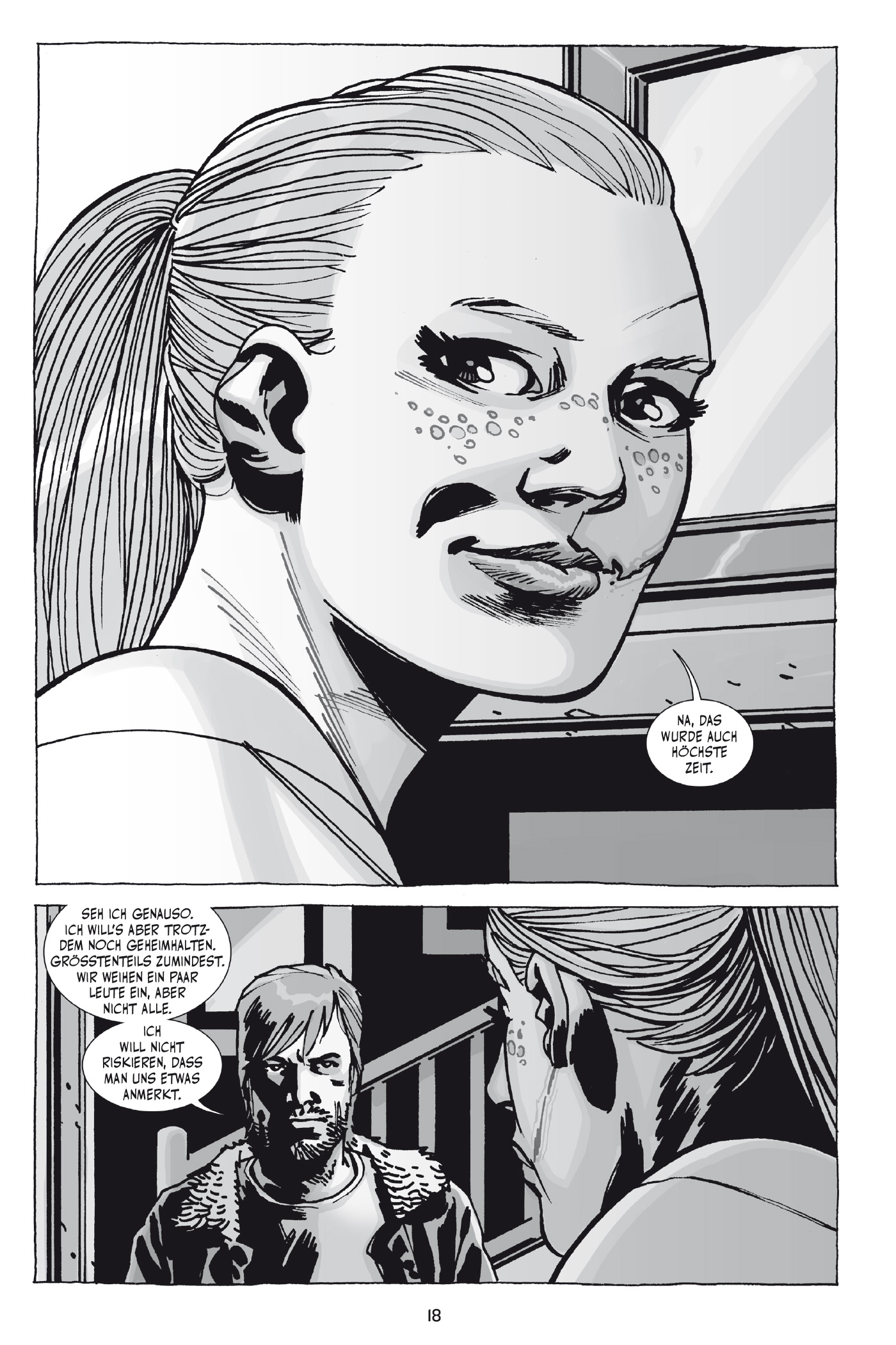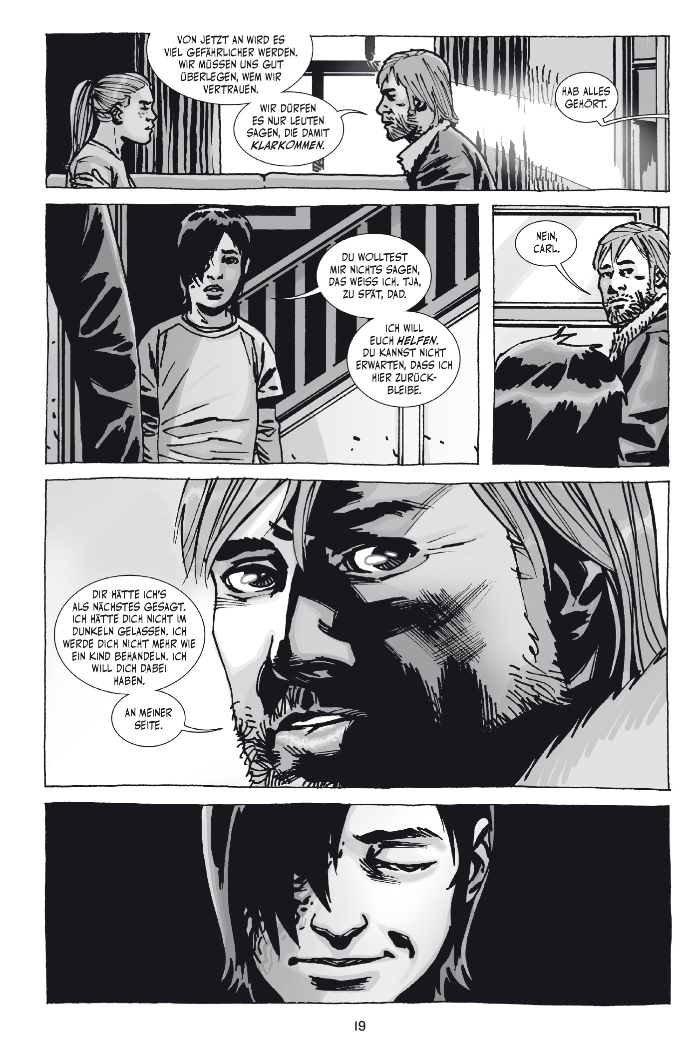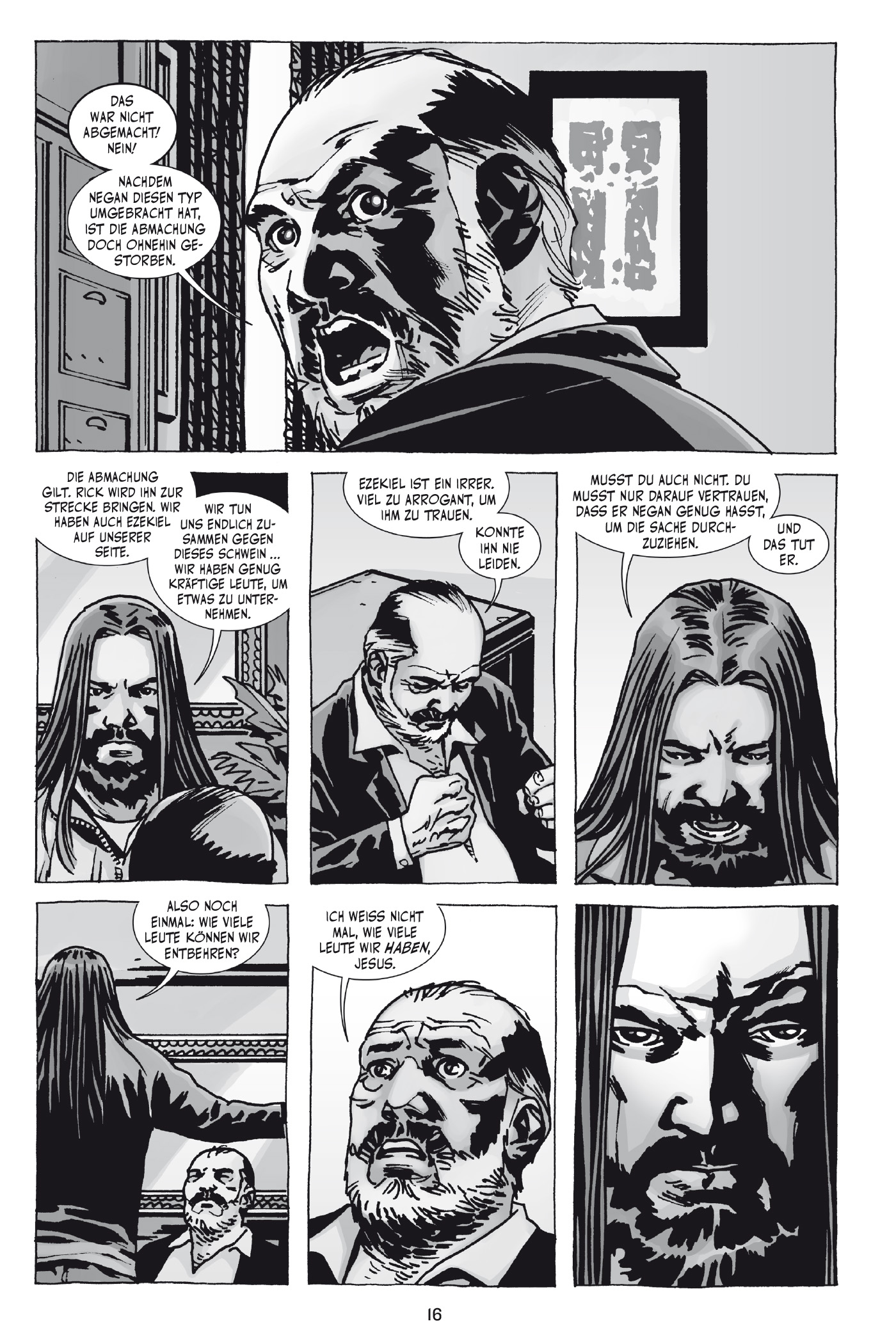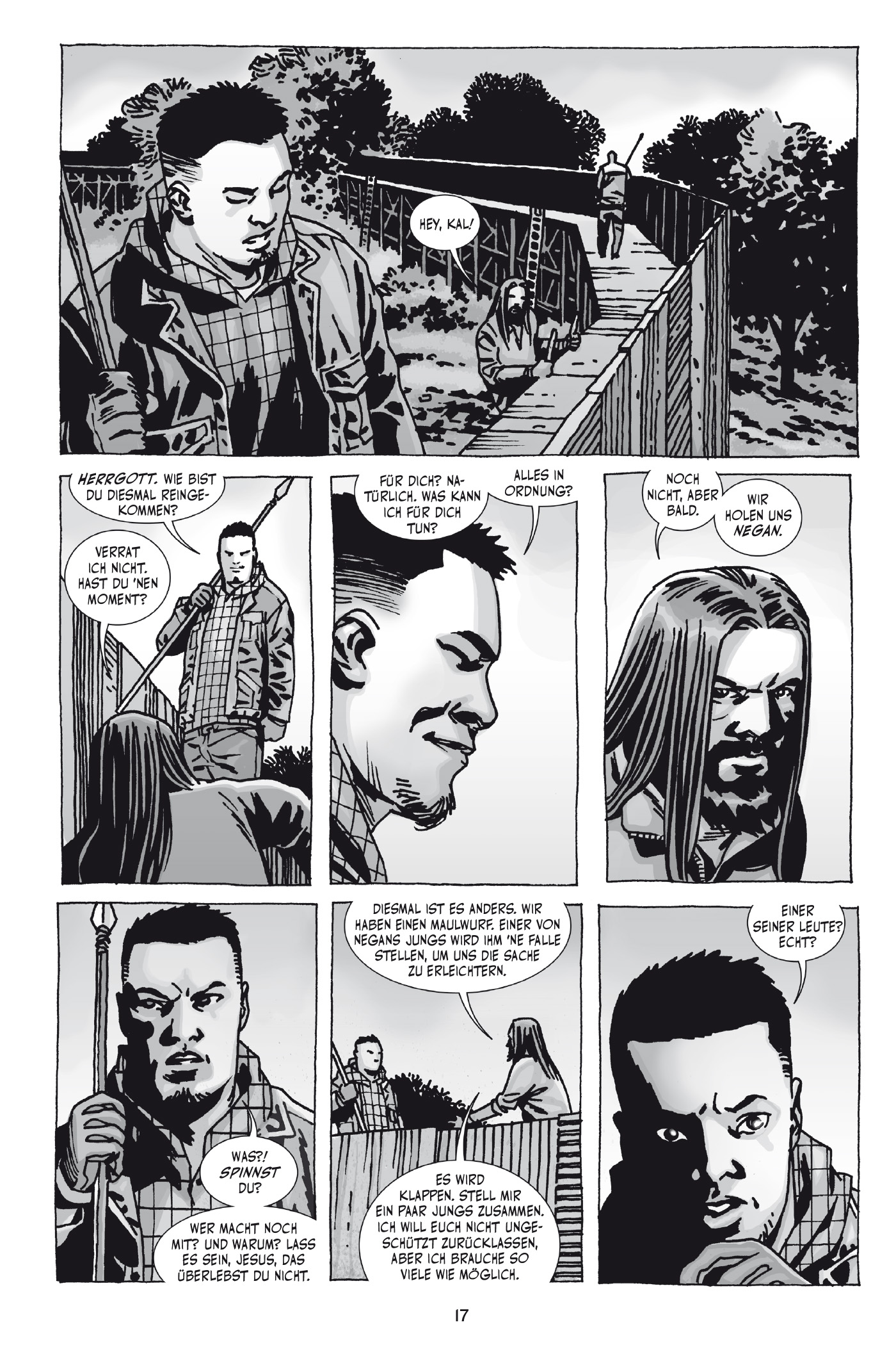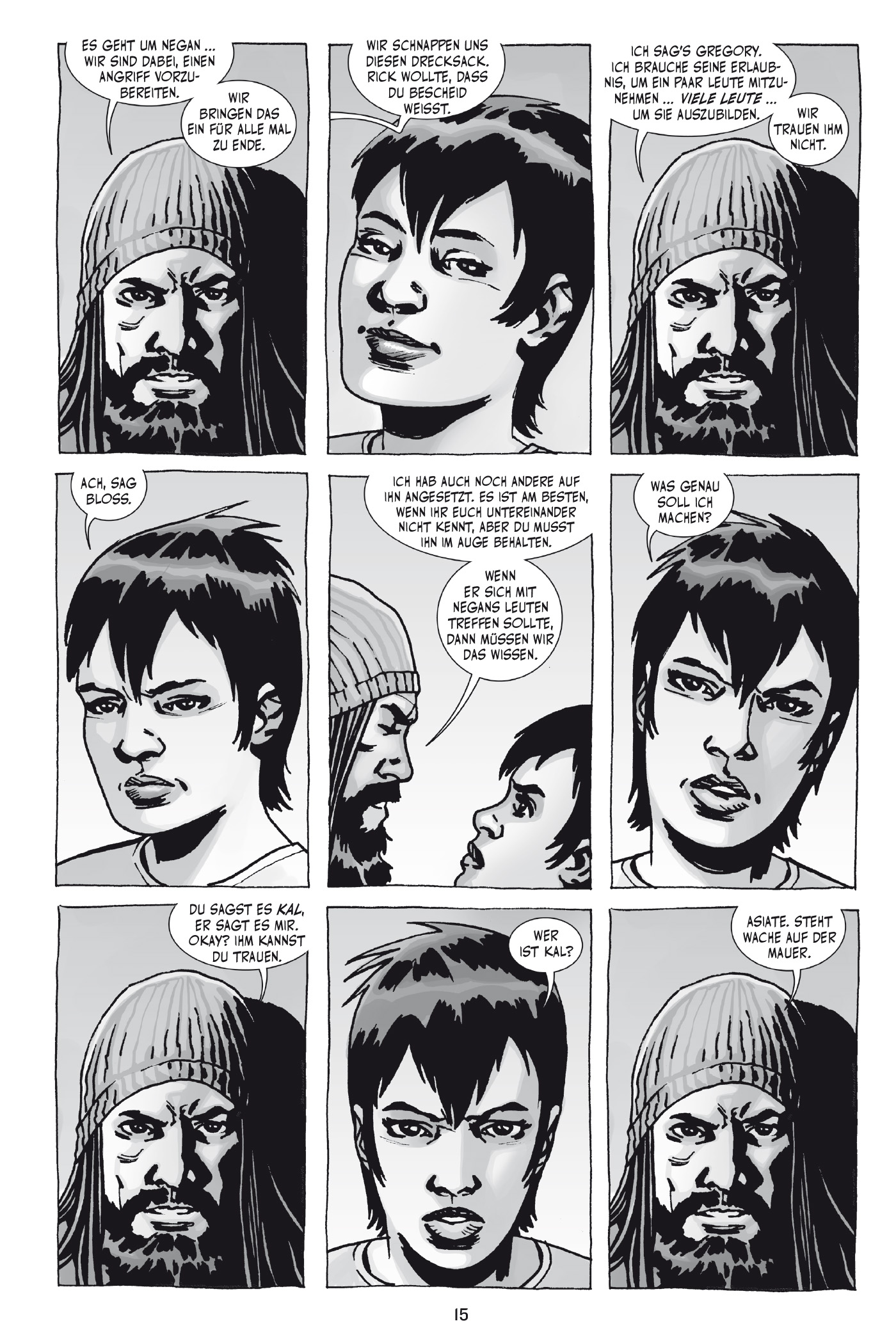 Ricks Stunde scheint gekommen, sich von Negan und seiner Armee, die er mit seinen perversen Regeln kontrolliert, zu … erlösen. Mit dem neuen Verbündeten Ezekiel, zu dem ihn Jesus führt und dem der Baseballschläger schwingende Bandenführer ebenfalls ein Dorn im Auge ist, sowie dem abtrünnigen Dwight, der sich schon zu lange vom selbstherrlichen Negan hat quälen lassen, beginnen sich die Rädchen zu drehen, die das Ende des Angst und Schrecken verbreitenden Tyrannen einleiten sollen. Doch Negan ist nicht auf den Kopf gefallen, und während Rick und seine Weggefährten in Alexandria weiterhin ihr doppeltes Spiel spielen, treibt er sein eigenes Spiel voran. Die Frage ist: Wer geht wem zuerst in die Falle?