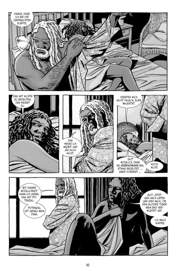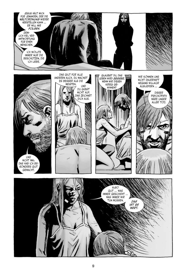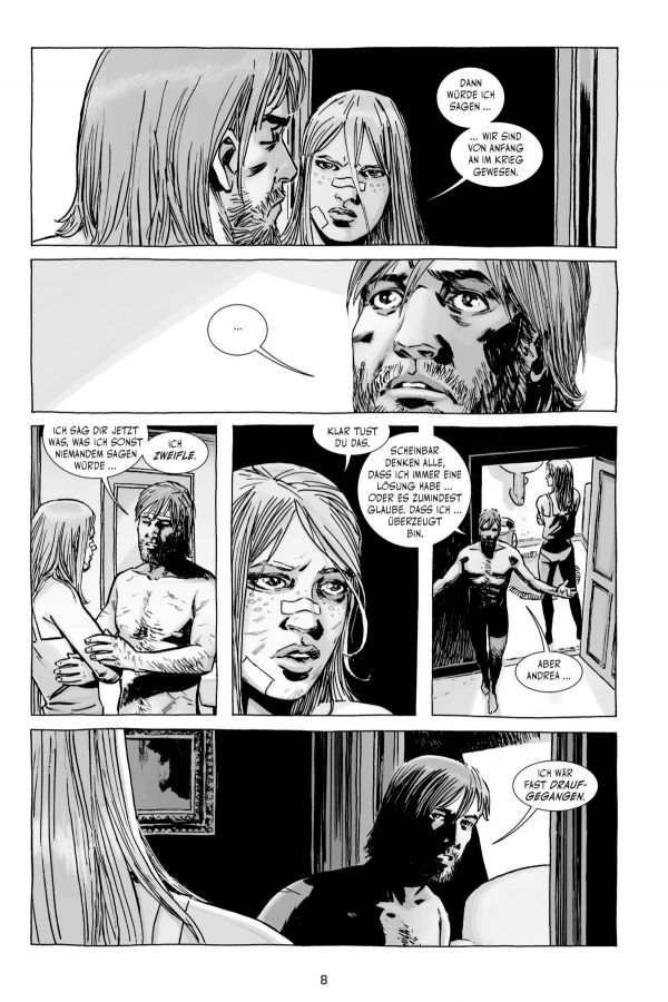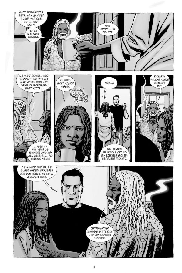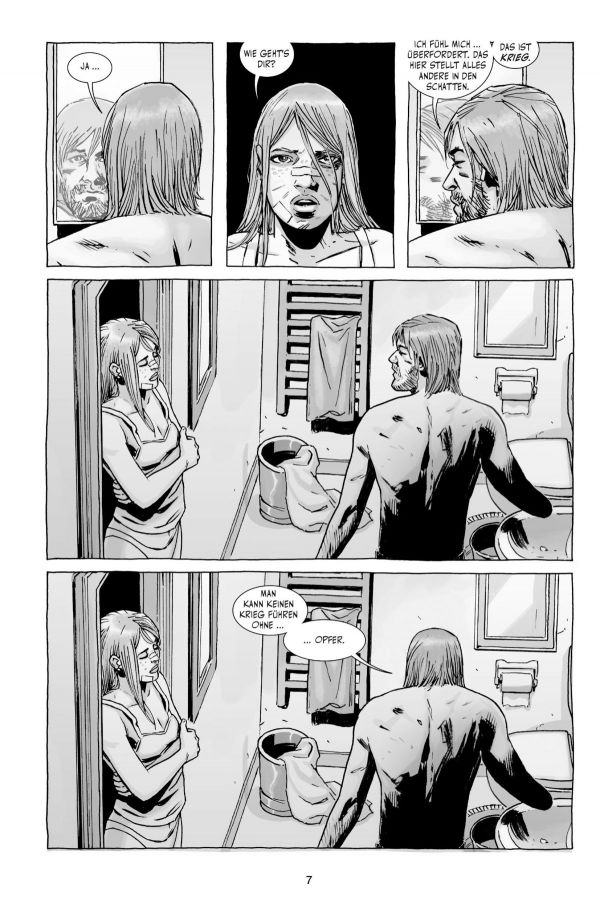 Mit Rick an der Spitze marschiert alsbald eine kleine schwerbewaffnete Truppe, der alle angehören, die sich gegen Negan wehren wollen, in das Territorium der Erlöser. Doch als Rick Negan vor den Toren seiner Basis ein Angebot unterbreitet, um einen Waffenstillstand zu ermöglichen, schlägt es Negan aus, die bestehende Vereinbarung zu ändern, und … wartet mit einer Überraschung auf: Gregory. Der Anführer der Anhöhe hat sich still und heimlich mit Negan verbündet. Die Situation eskaliert. Schüsse fallen. Im Durcheinander stürzt sich Holly in ein Selbstmordkommando, Ezekiel und Shiva werden von den anderen getrennt und nicht nur Carl, Andrea und die in Alexandria Verbliebenen wissen lange nicht, was aus den Ausgezogenen geworden ist.