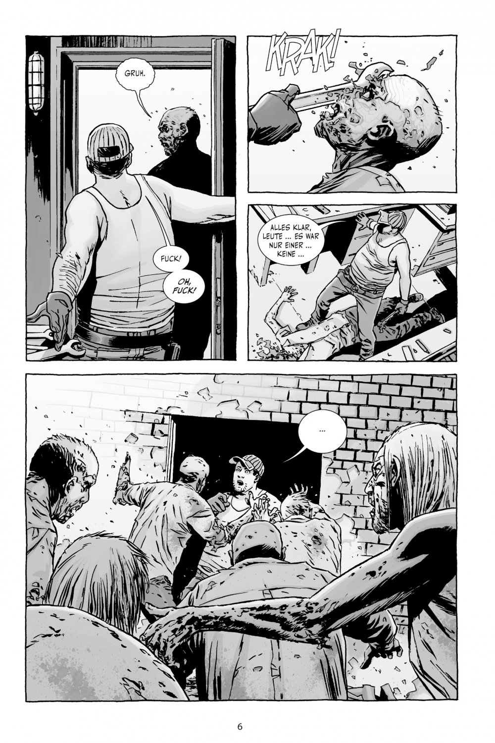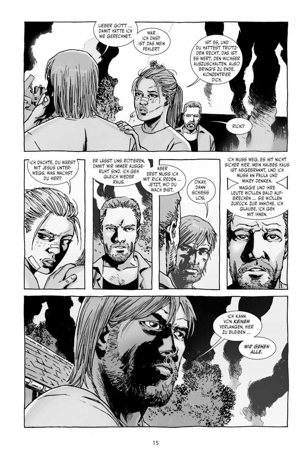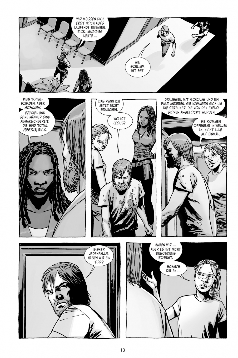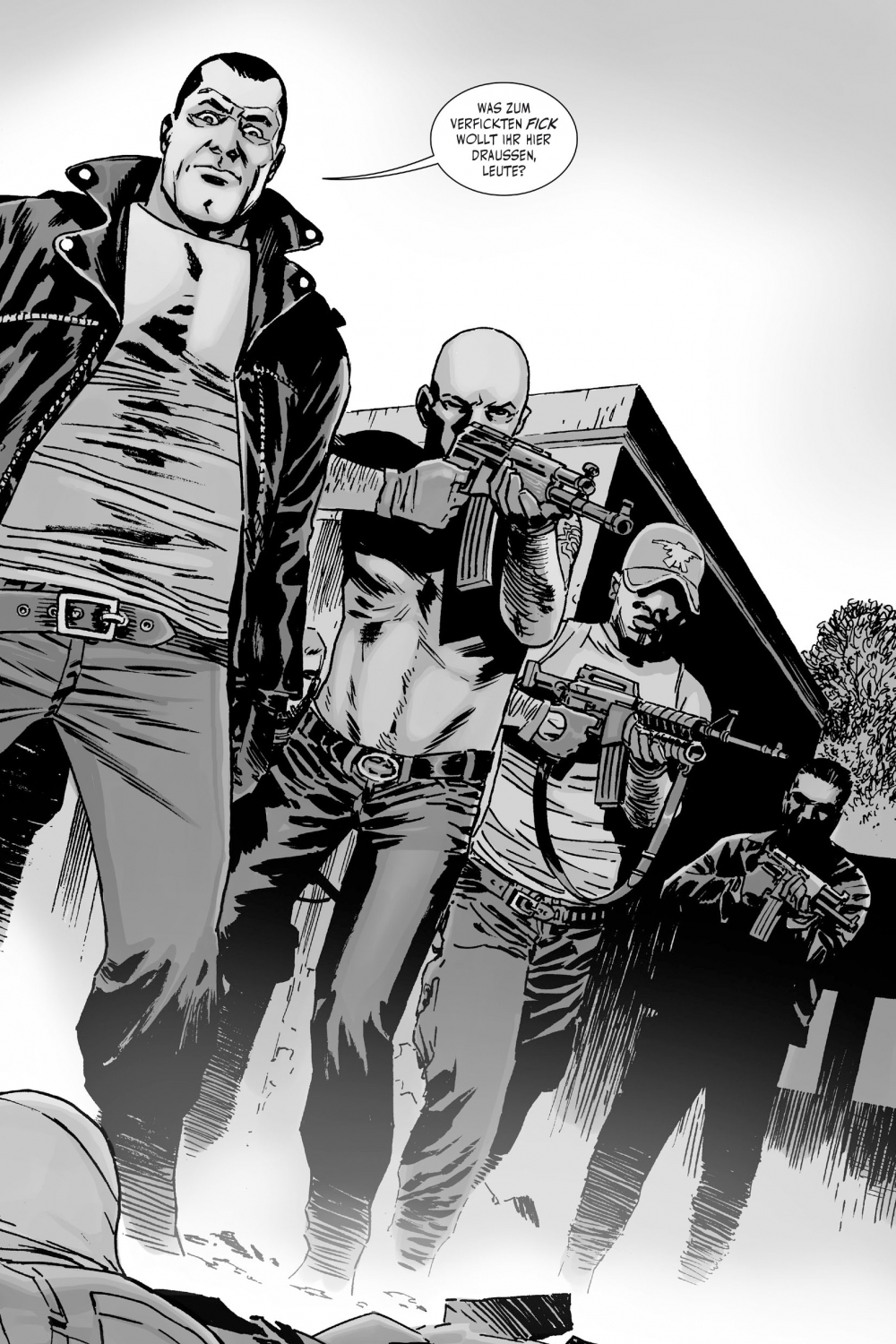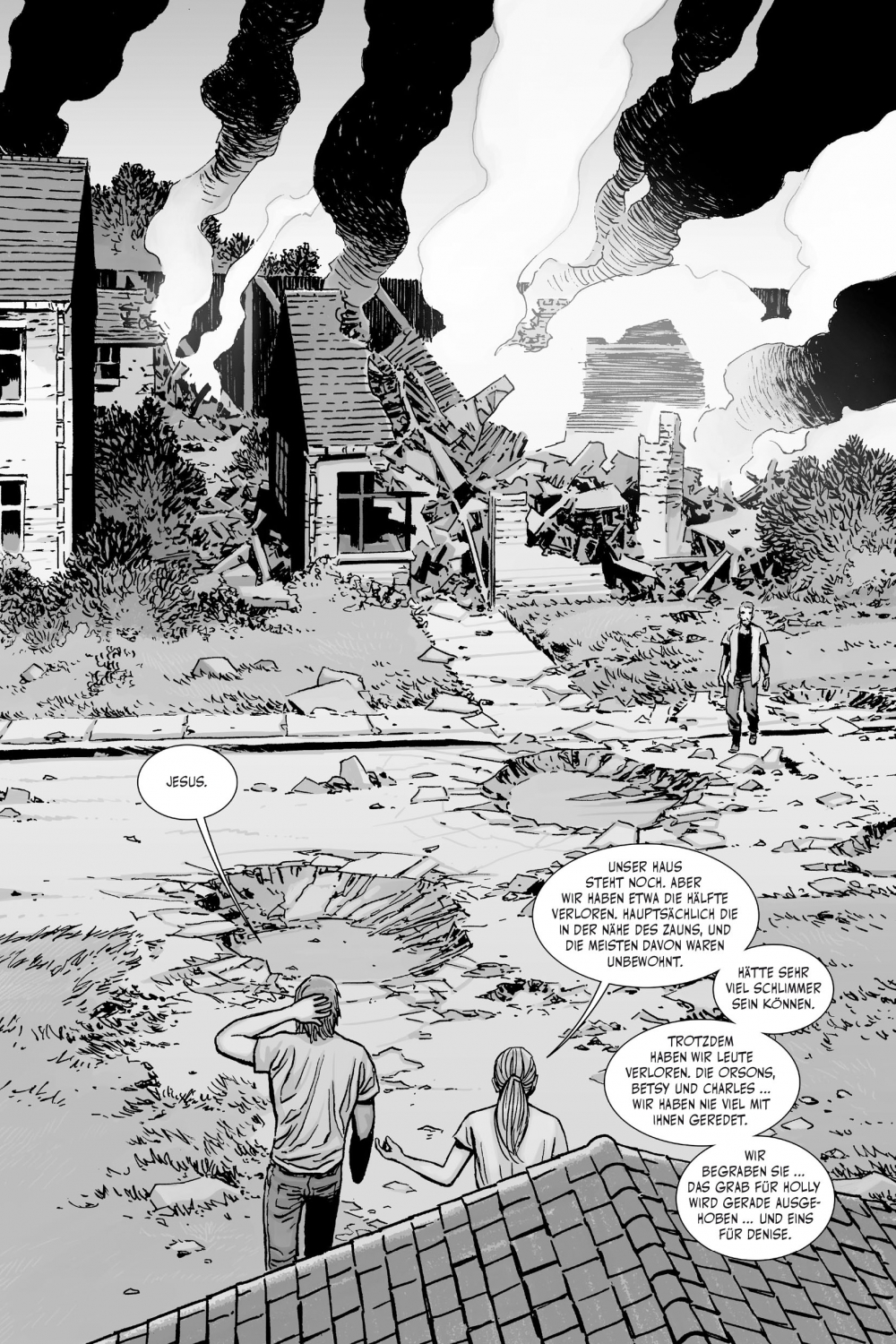 Inmitten der gegnerischen Offensive versucht sich die dezimierte Truppe um Rick nun in ihrer "Festung" neu zu formieren. Dass sie in letzter Sekunde Verstärkung durch die Anwohner der Anhöhe bekommen, jetzt angeführt durch Maggie, verschafft ihnen etwas Zeit. Aber die Schäden sind irreparabel, die Rauchschwaden über Alexandria dick, und Negan ist an einem Punkt angekommen, wo ihm jedes Mittel Recht ist, um am Ende als Sieger dazustehen … Mittel, so genadenlos und pervers, dass Rick und seine Anhänger sich noch keine Vorstellung davon machen können.