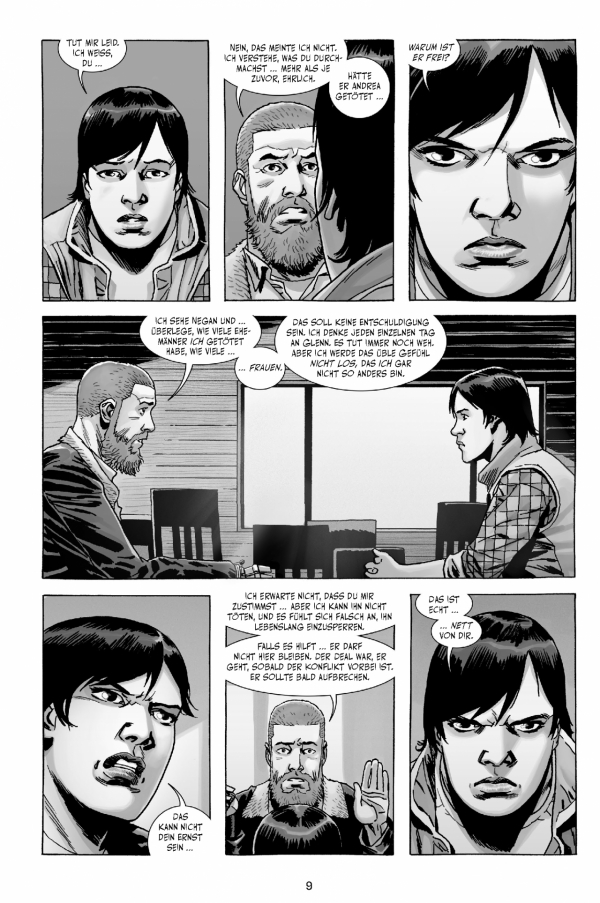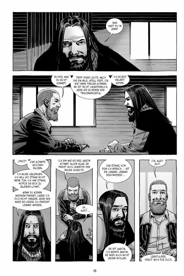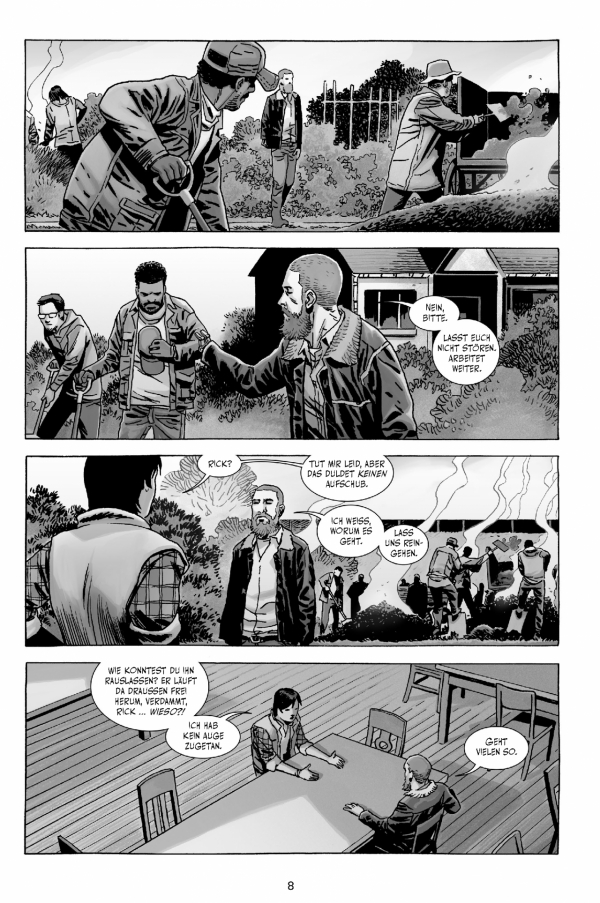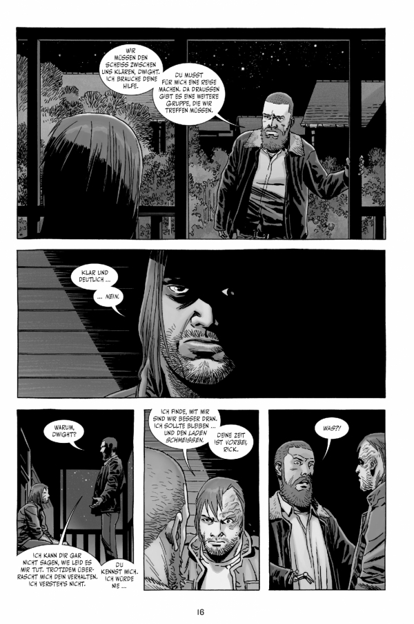Die Gruppe und ganz besonders Carl, Sohn von Anführer Rick, leiden immer noch unter den traumatischen Ereignissen des letzten Bandes. Es kommt zu Unruhen, bei denen sich Rick einmal mehr für seine Taten rechtfertigen muss – warum hat er Negan freigelassen? Warum hat er sich mit den Erlösern angelegt? Das alles führt dazu, dass Dwight Ricks Rolle als Anführer in Frage stellt und es zum Bruch zwischen den beiden kommt. Eine weitere Bewährungsprobe für die Überlebenden der Zombie-Apokalypse.
