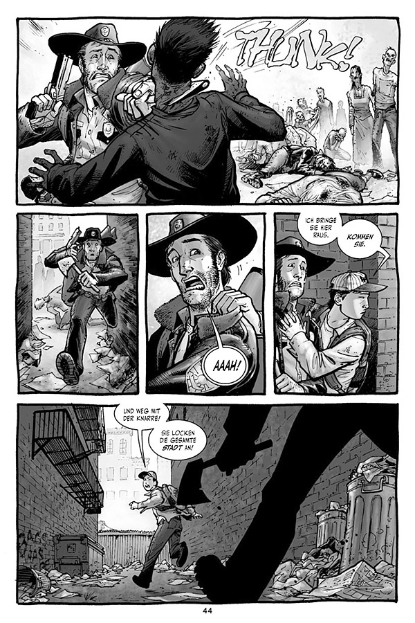 'In The Walking Dead', so Autor Robert Kirkman, 'möchte ich untersuchen, wie Menschen mit extremen Situationen umgehen und wie solche Ereignisse sie verändern.' Rick Grimes Odyssee durch ein untotes Amerika ist eine Reise zur Erkenntnis, was Leben wirklich bedeutet. Aufgrund der einfühlsamen Erzählweise und der markanten schwarz-weiß- Zeichnungen wurde diese Serie zu einem der meistgelobten US- Independent-Titel der letzten Jahre.