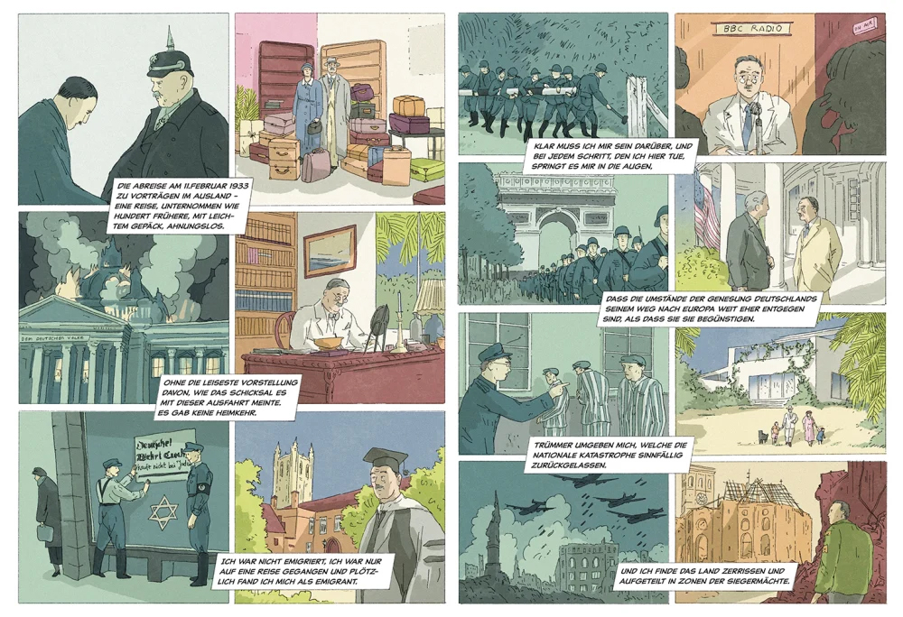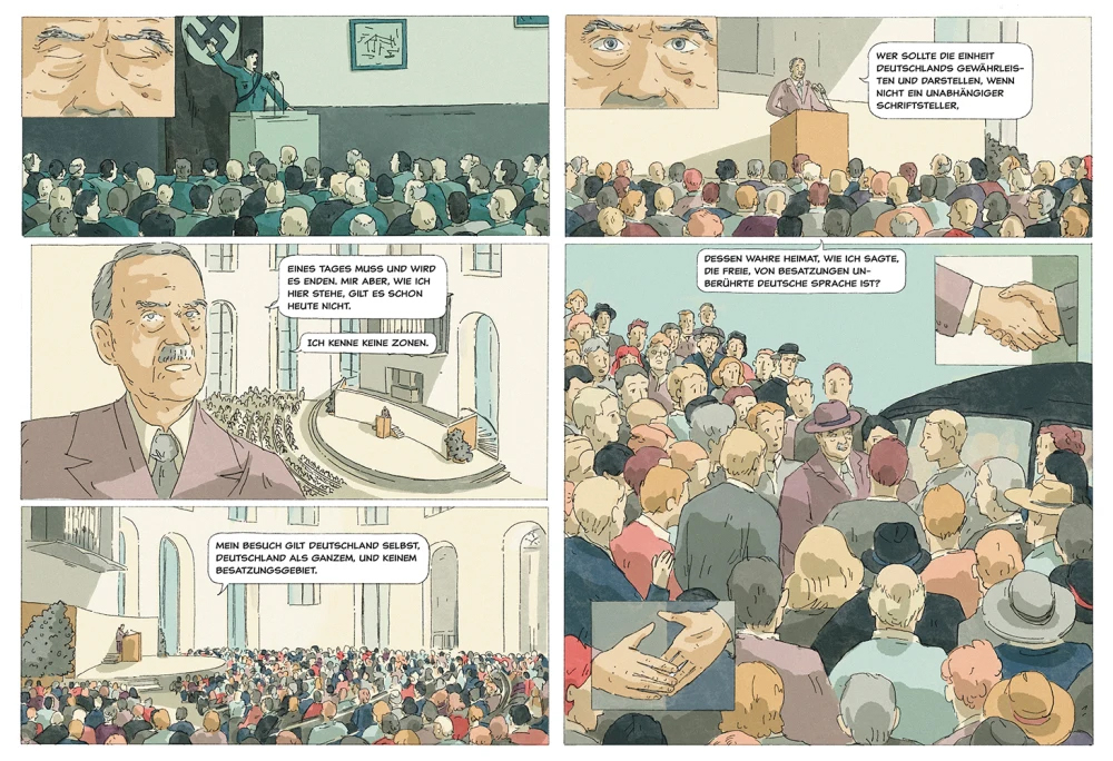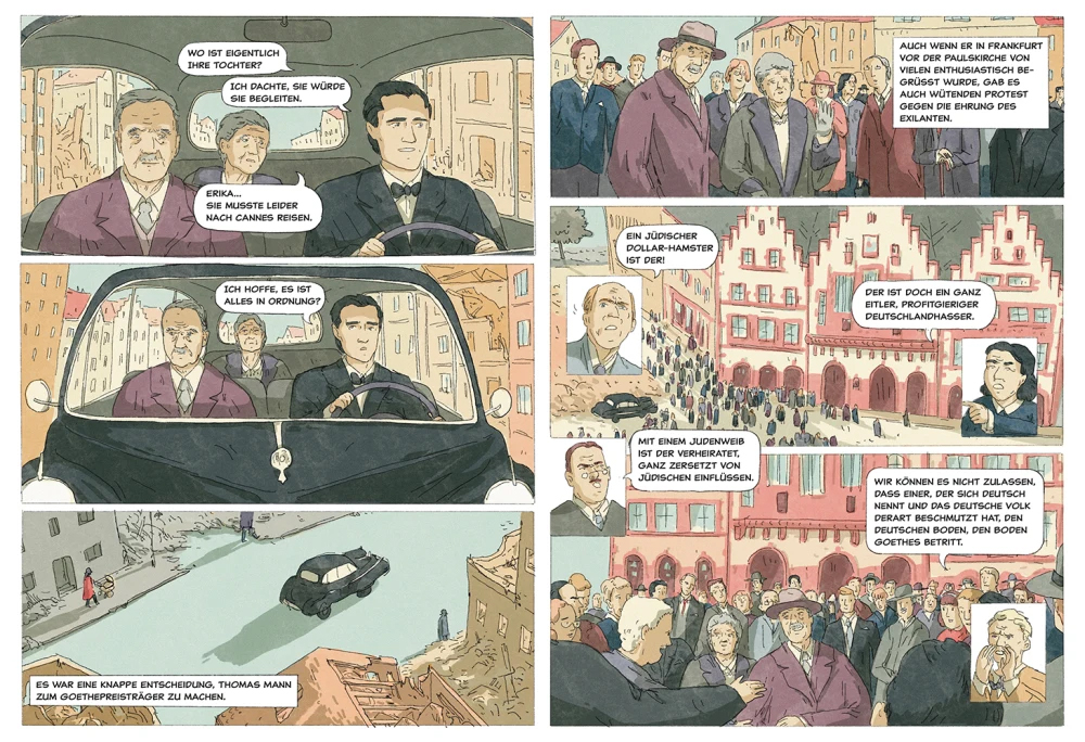 Basierend auf Thomas Manns Tagebüchern, Briefen, Reiseberichten und den Erinnerungen seines Schweizer Fahrers, erzählt diese Graphic Novel von Manns zehntägiger Rückkehr, einem politisch extrem aufgeladenen Kapitel im Leben Thomas Manns und seiner Familie. Zudem beleuchtet die Graphic Novel auch Schlüsselmomente im Leben des Schriftstellers, blickt in Flashbacks immer wieder auf historisch wichtige Phasen zurück und gibt einen facettenreichen Einblick in die Gedankenwelt Thomas Manns.
