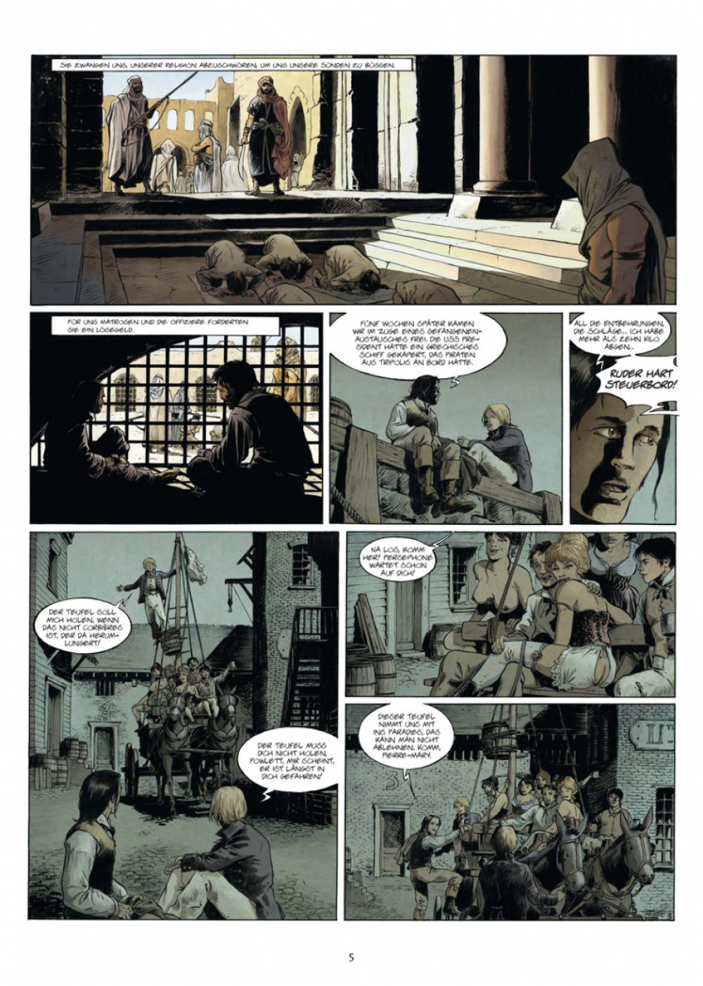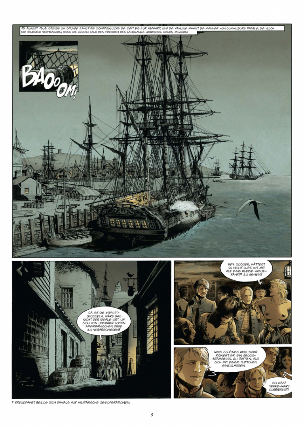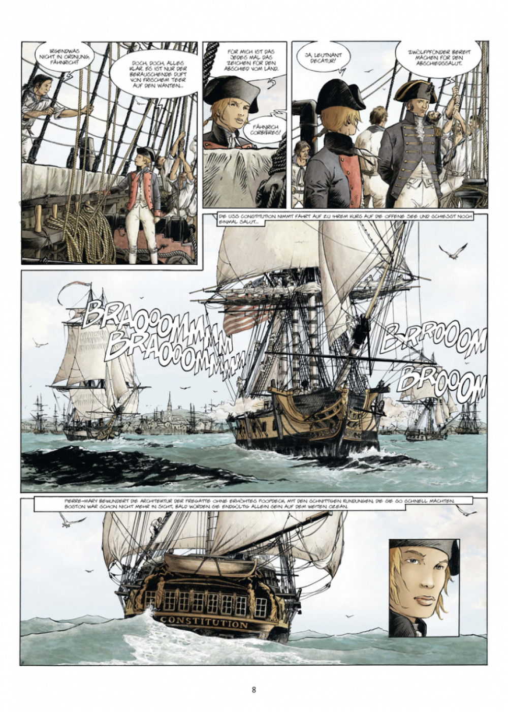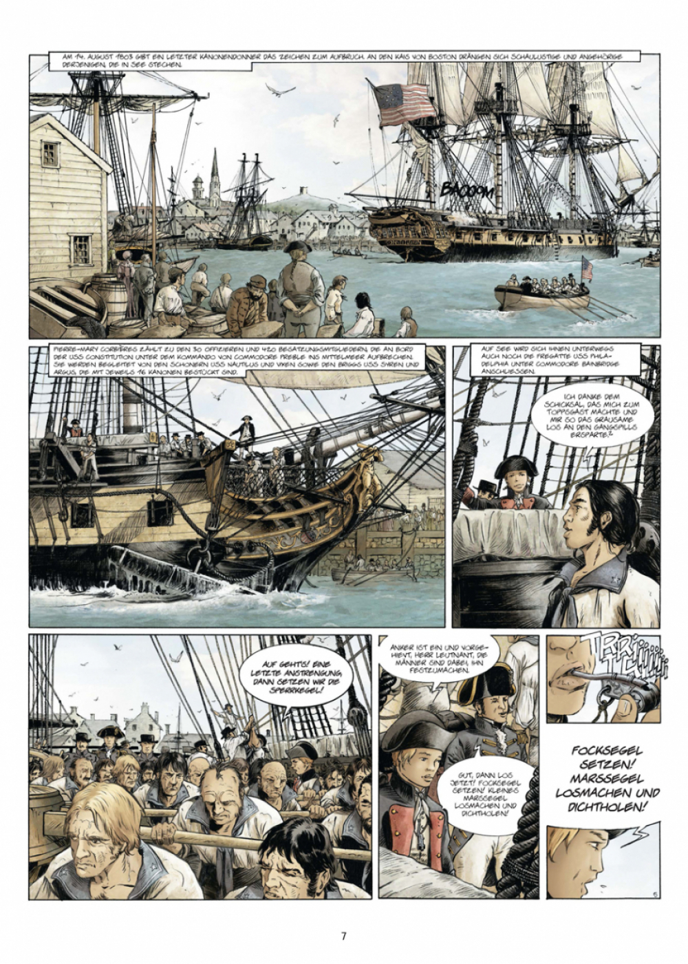 Nachdem die USA die Unabhängigkeit von England erlangt hatte, verlor ihre Handelsflotte den Schutz der Royal Navy. Zahlreiche Piraten witterten leichte Beute, und um darauf zu reagieren, wurden übermächtige Kriegsschiffe wie die USS Constitution erschaffen. Franck Bonnet verknüpft detailverliebte Zeichnungen der majestätischsten Schiffe der Seefahrtsgeschichte mit der abenteuerlichen Reise eines jungen Offiziers zu einem einzigartigen maritimen Comic-Erlebnis.