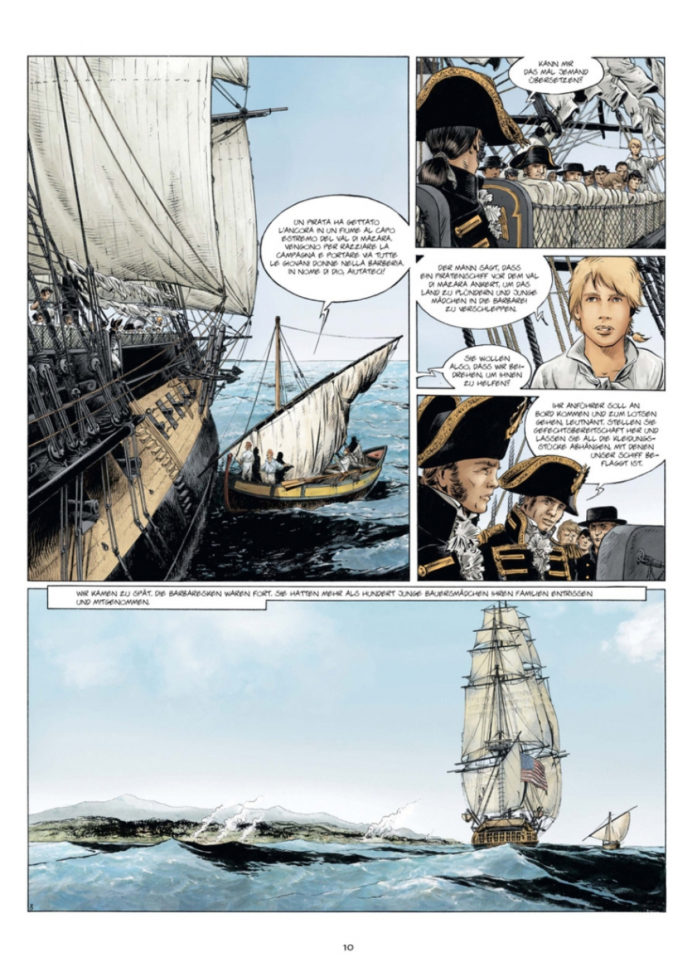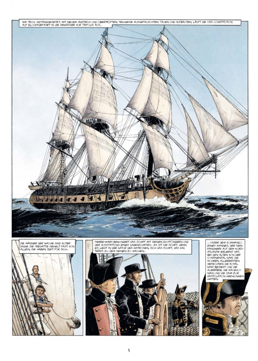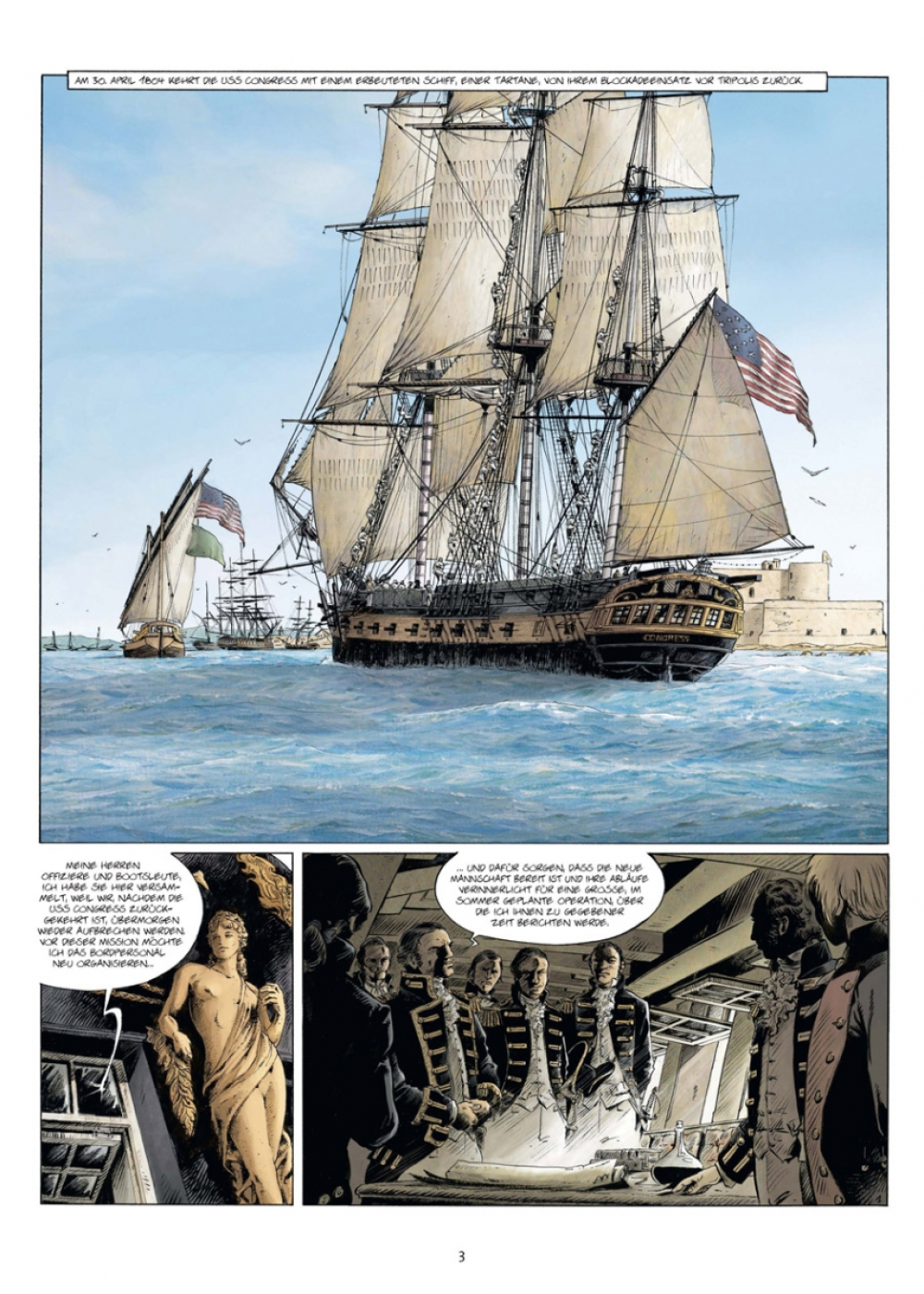 Nachdem die USA die Unabhängigkeit von England erlangt hatte, verlor ihre Handelsflotte den Schutz der Royal Navy. Zahlreiche Piraten witterten leichte Beute, und um darauf zu reagieren, wurden mächtige Kriegsschiffe wie die USS Constitution gebaut. Franck Bonnet verknüpft detailverliebte Zeichnungen der majestätischen Schiffe mit der abenteuerlichen Reise eines jungen Offiziers zu einem einzigartigen maritimen Comic-Erlebnis.
