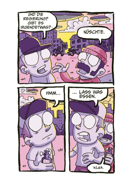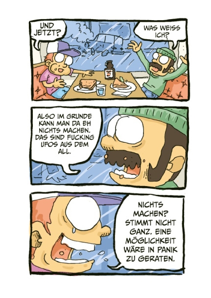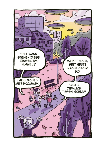 Während die Welt dem Untergang geweiht scheint, nehmen sich zwei Freunde die Zeit, alles aus einer anderen Perspektive zu betrachten. Nichts ist schöner als ein Spaziergang an der frischen Luft und ein kühles Getränk in der Hand – wenn da nicht diese verdammten UFOs wären.