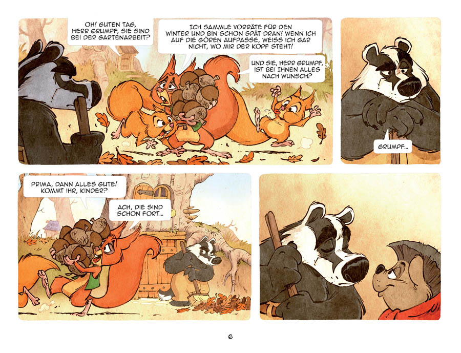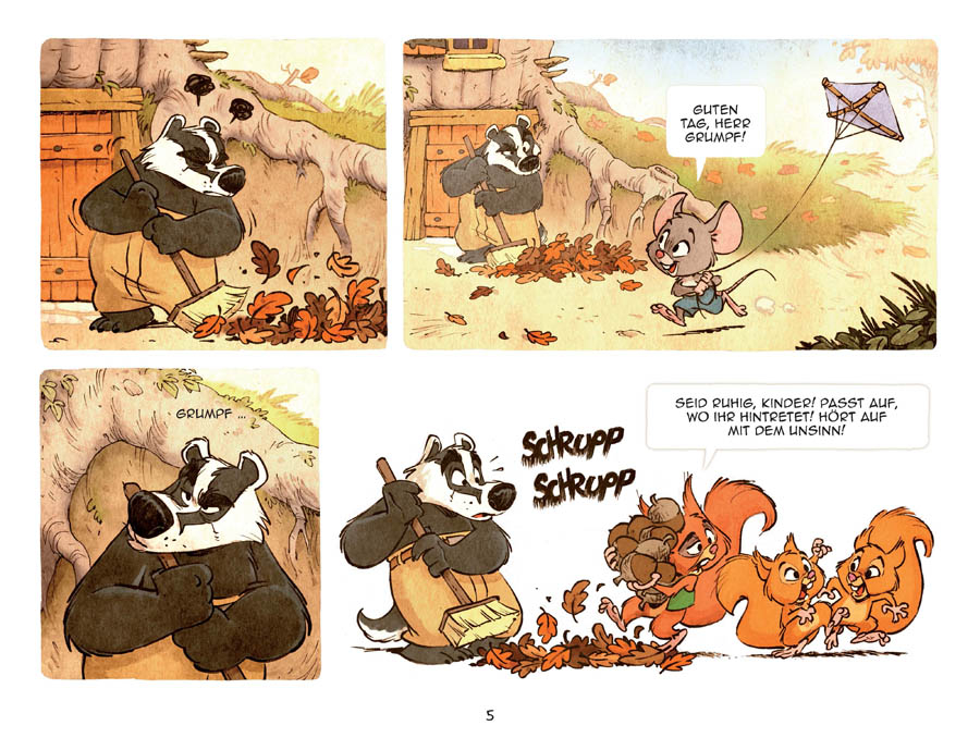 Im Wald bringt der Wechsel der Jahreszeiten viele Veränderungen mit sich. Im Herbst müssen Vorräte angelegt und Laub zusammengekehrt werden, wobei sich nicht alle Tiere so geschickt anstellen wie Herr Grumpf, der Dachs. Im Winter ist es kalt und ungemütlich, vor allem, wenn man allein ist wie Herr Fuchs, der so gerne eine Freundin hätte, aber so furchtbar schüchtern ist. Der Frühling lässt die schönsten Blumen sprießen… zu dumm, dass das kleine Wildschwein dadurch immer niesen muss, obwohl es einen Strauß für seine Mama pflücken will. Und im Sommer kann man endlich wieder spielen und toben, aber manche Waldtiere wie der Uhu möchten trotzdem lieber ihre Ruhe haben.