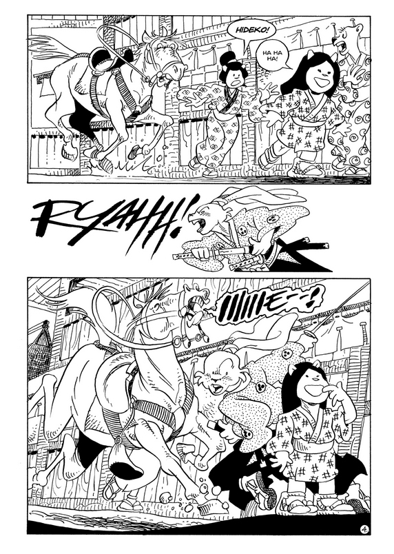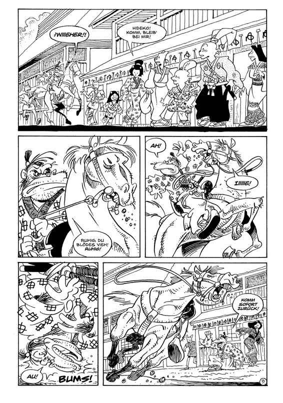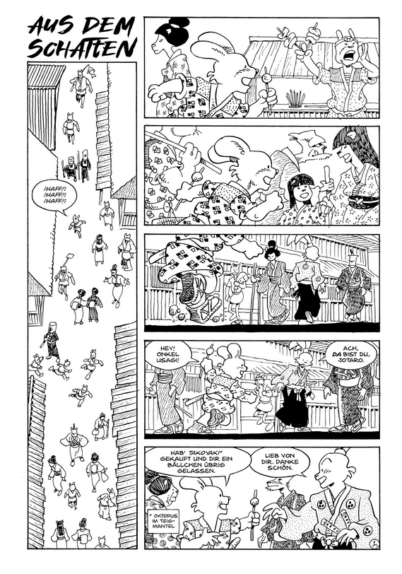 Und wem begegnen die beiden Reisenden in diesem Band? Da sind zum einen die Ninja vom Neko-Clan, die hinter ihrer ehemaligen kashira Chizu her sind (einer alten Freundin Usagis), dann treibt die Koroshi-Mördergilde wieder ihr Unwesen, die schöne Diebin Kitsune sorgt nicht nur mit ihren Kreiseln für Wirbel und schließlich erfahren wir auch endlich, wie Usagis Begegnung mit dem tengu des Westberges verlaufen ist. Aber all das ist nichts gegen den bösen Künstler, der Jotaro in dem Dreiteiler „Sumi-e“ mit einer dämonischen Tuschegarnitur angreift. Gegen dessen schwarze Kunst brauchen Usagi und Jotaro den Beistand von Sasuke, dem Dämonenbezwinger …