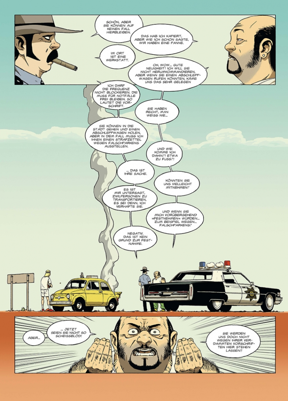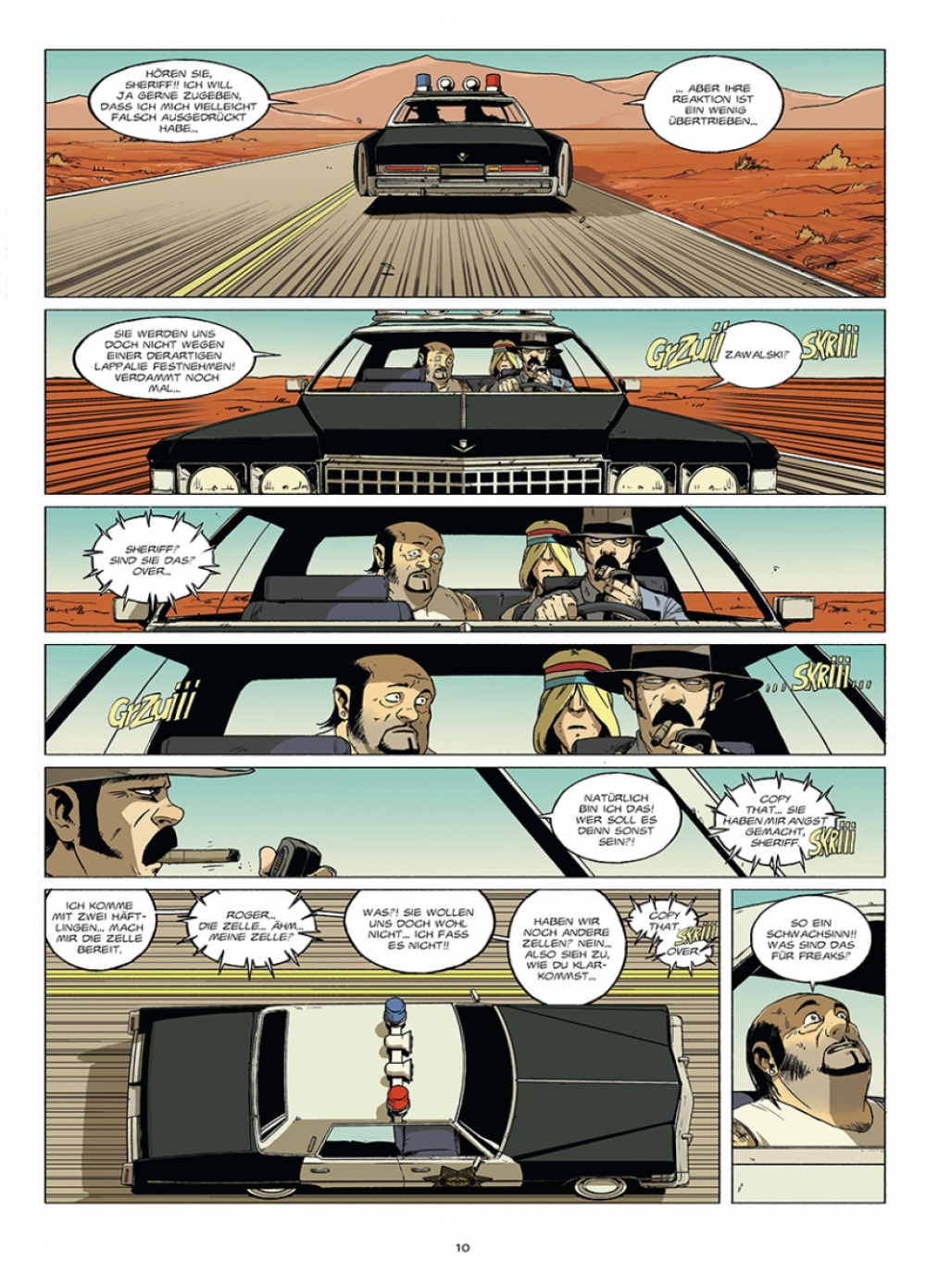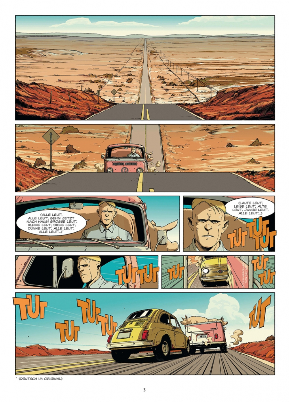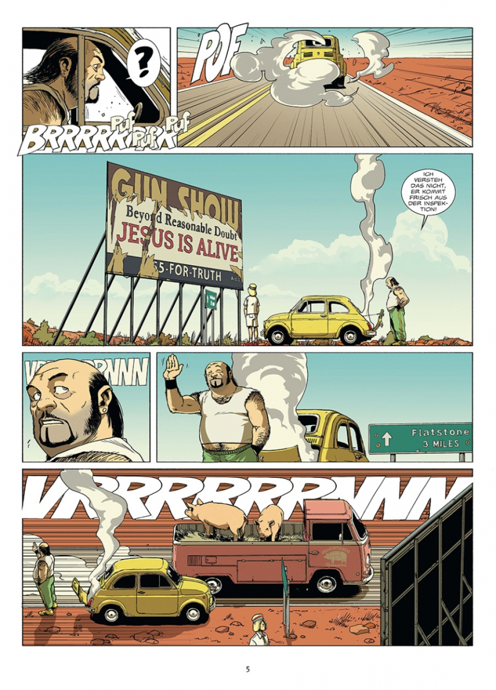 Figuren, so verrückt, als kämen sie aus Lewis Carrolls Wunderland, Kampfszenen, so überzogen wie bei Tarantino, überzüchtete Supersportwagen, Ex-Nazis in knappen Lederhosen, versoffene Rednecks, ein Junge mit azurblauem Blick, Schweinehunde, Blutbäder, Staub und schales Bier und ein großzügiger Schuss Heavy Metal – »Valhalla Hotel« ist so absurd wie überdreht und strotzt vor gnadenlos schwarzem Humor.