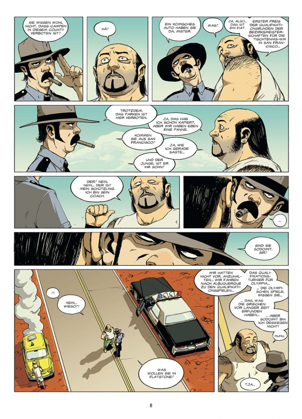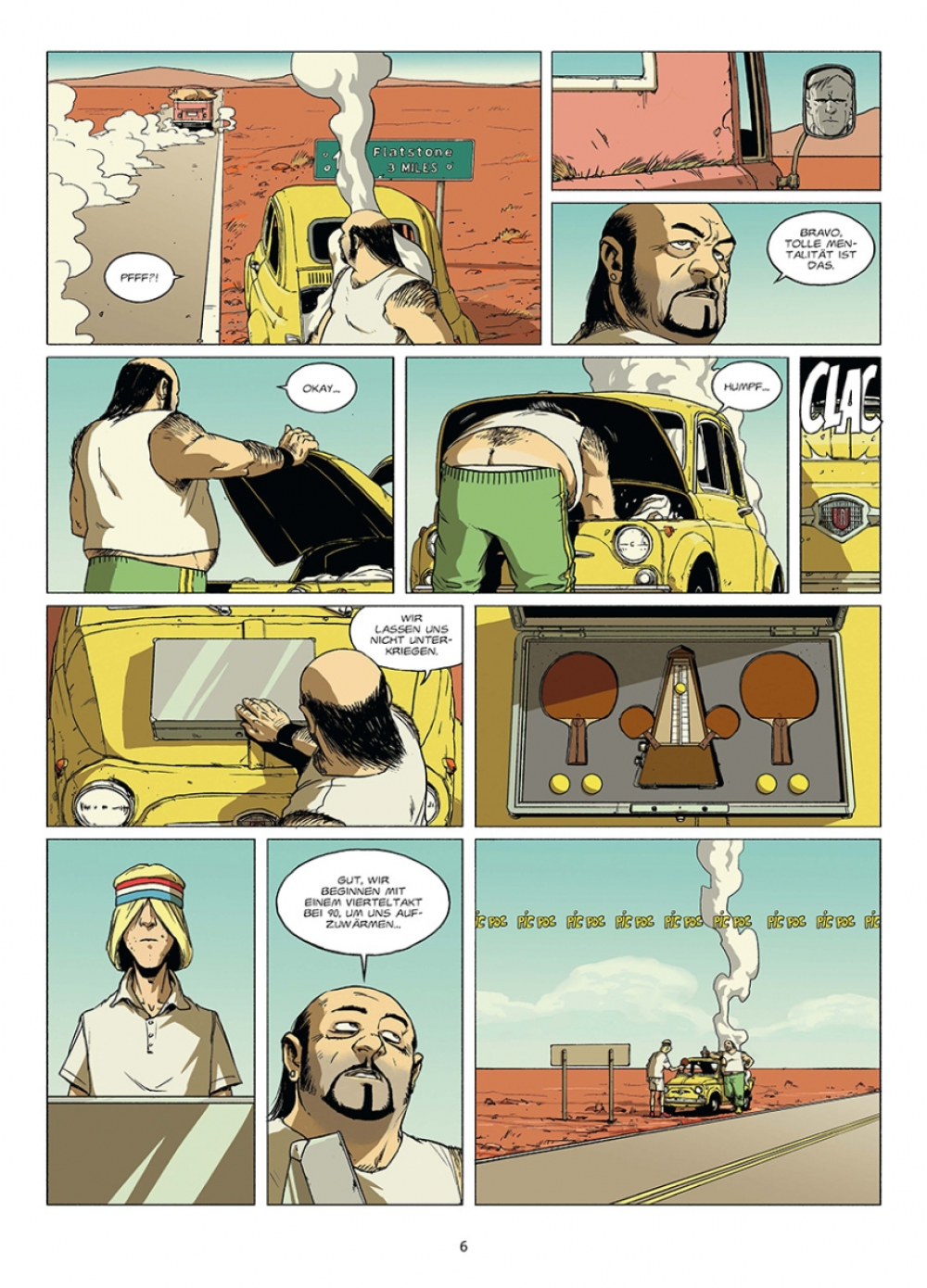 Auf dem Weg zur Ping-Pong-Regionalmeisterschaft in Albuquerque haben der schweigsame Lemmy und sein Coach Malone mit ihrem treuen Fiat 500 eine Panne. Einige Meilen entfernt, mitten im Herzen von New Mexico, liegen die Kleinstadt Flatstone und eine rettende Werkstatt. Nach einigen »administrativen Schwierigkeiten« mit dem homophoben Sheriff, der in Lemmy und Malone mehr als nur Trainingspartner vermutet, finden die beiden schließlich Zuflucht im Valhalla Hotel, während ihr Wagen repariert wird. Doch am nächsten Morgen ist Lemmy spurlos verschwunden. Und für Malone beginnt eine absurde Odyssee.