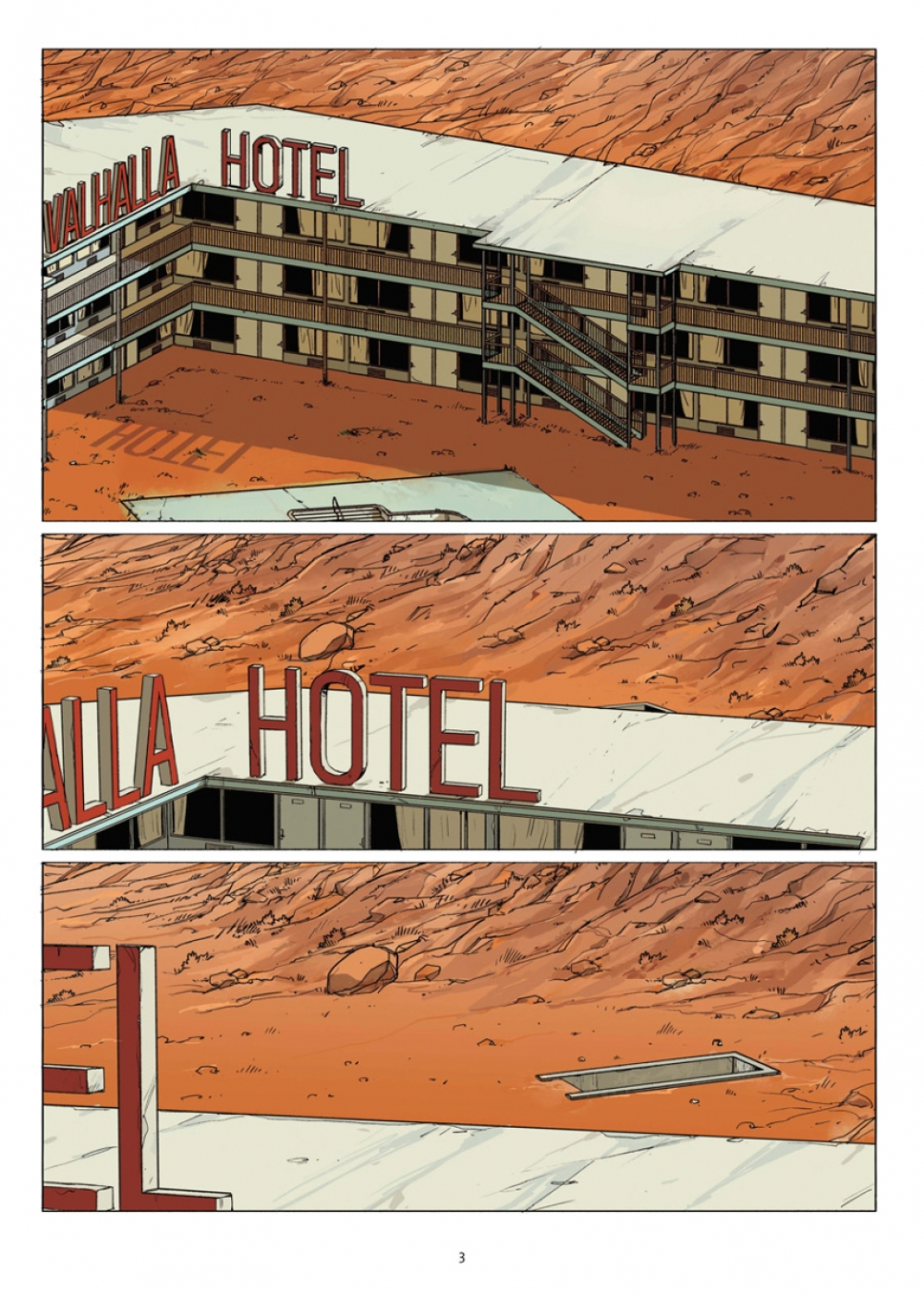 Figuren, so verrückt, als kämen sie aus Lewis Carrolls Wunderland, Kampfszenen, so überzogen wie bei Tarantino, überzüchtete Supersportwagen, Ex-Nazis in knappen Lederhosen, versoffene Rednecks, ein Junge mit azurblauem Blick, Schweinehunde, Blutbäder, Staub und schales Bier und ein großzügiger Schuss Heavy Metal – »Valhalla Hotel« ist so absurd wie überdreht und strotzt vor gnadenlos schwarzem Humor.