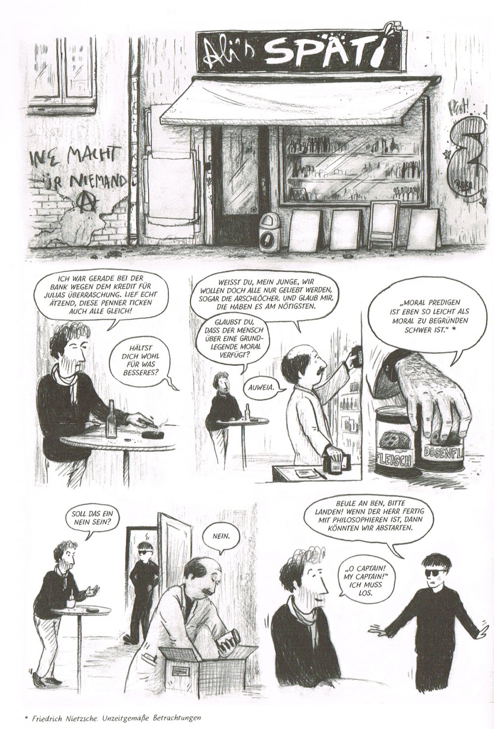 Abends in Alis Kiez-Späti, wenn das Spiel läuft und Ben im Kreise seiner Freunde ist, scheint die Welt in Ordnung, aber an allen anderen Fronten muss der junge Berliner Rückschläge einstecken. Bens IT-Job ist eine Sackgasse, seine eigentliche Leidenschaft, das Zeichnen, bereitet ihm auch keine Freude mehr und wegen seiner chronisch trüben Laune hat seine Freundin das Weite gesucht. Wie der ewig gestrafte Sisyphos, der in jedem von Bens Bildern auftaucht, müht er sich mit seinem ziellosen Alltag ab, bis jede Pore seines Körpers nach Veränderung schreit. Aber sich selbst neu zu erfinden, ist selbst in Berlin, wo die Inspiration an jeder Ecke wartet, keine leichte Aufgabe ...