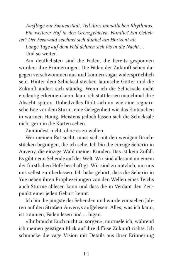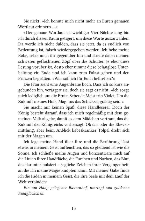 Violet ist Prophetin und Lügnerin, die den königlichen Hof mit ihren raffiniert formulierten – und nicht immer zutreffenden – Weissagungen beeinflusst. Ehrlichkeit ist für Verlierer, wie den gar nicht so märchenhaften Prinzen Cyrus, der Violet ihres offiziellen Postens berauben will, sobald er am Ende des Sommers den Thron besteigt – außer Violet unternimmt etwas dagegen.