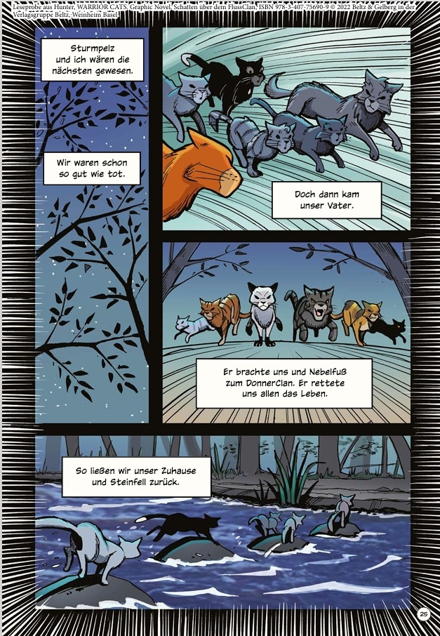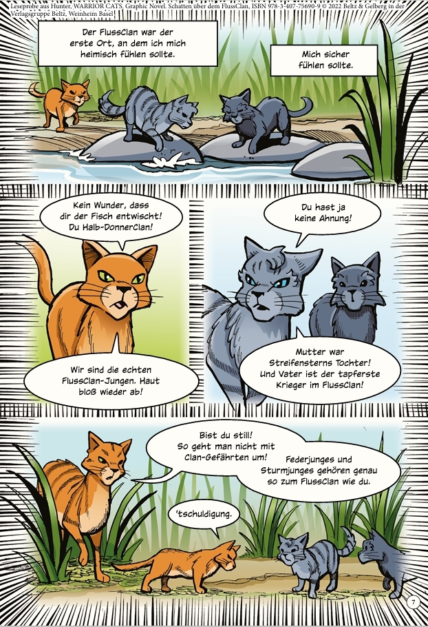 Die FlussClan-Kätzin Federschweif wurde von seinem Clan beinahe getötet und kann ihren Gefährten nicht vergeben. Das ändert sich, als der FlussClan die Streunerin Sasha mit ihren zwei Jungen aufnimmt.